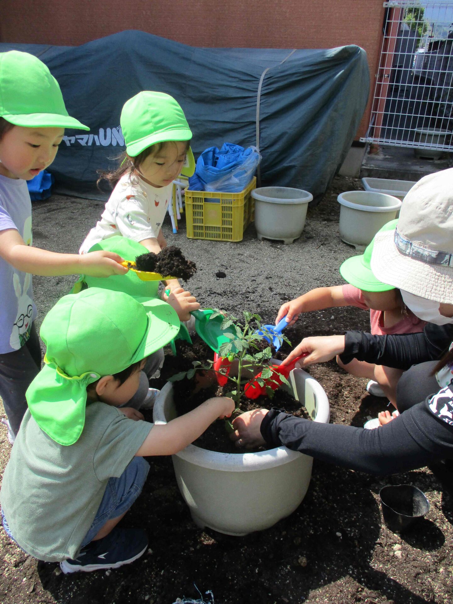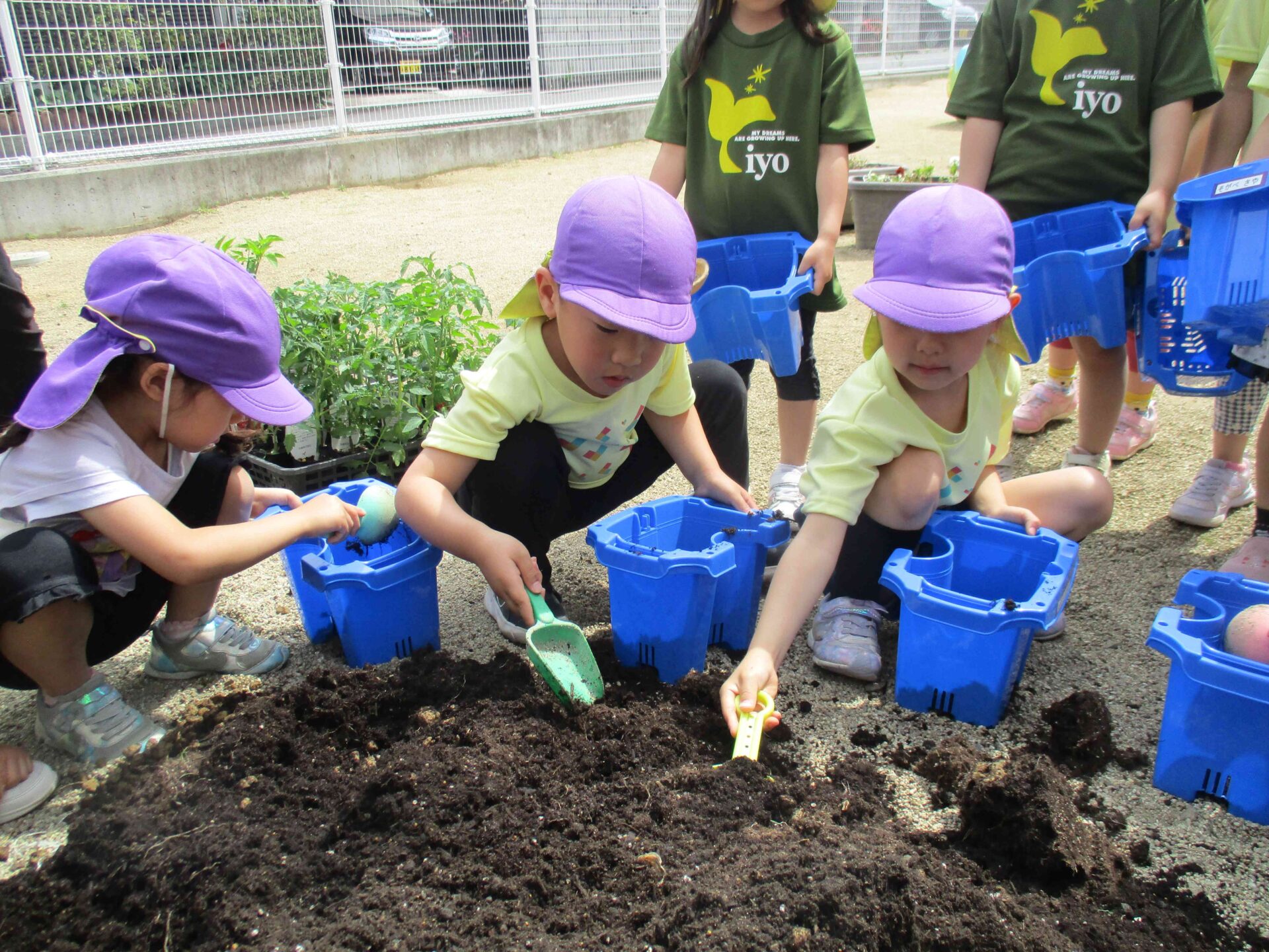 はじめて夏野菜を育てる3歳児にじチームは、ミニトマトの苗を植えました。