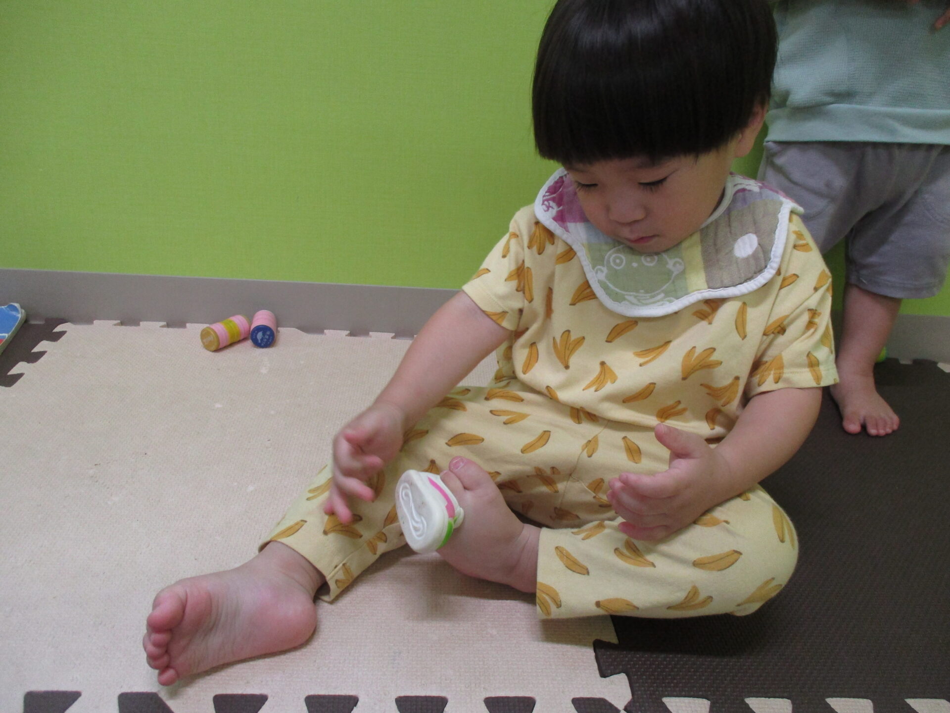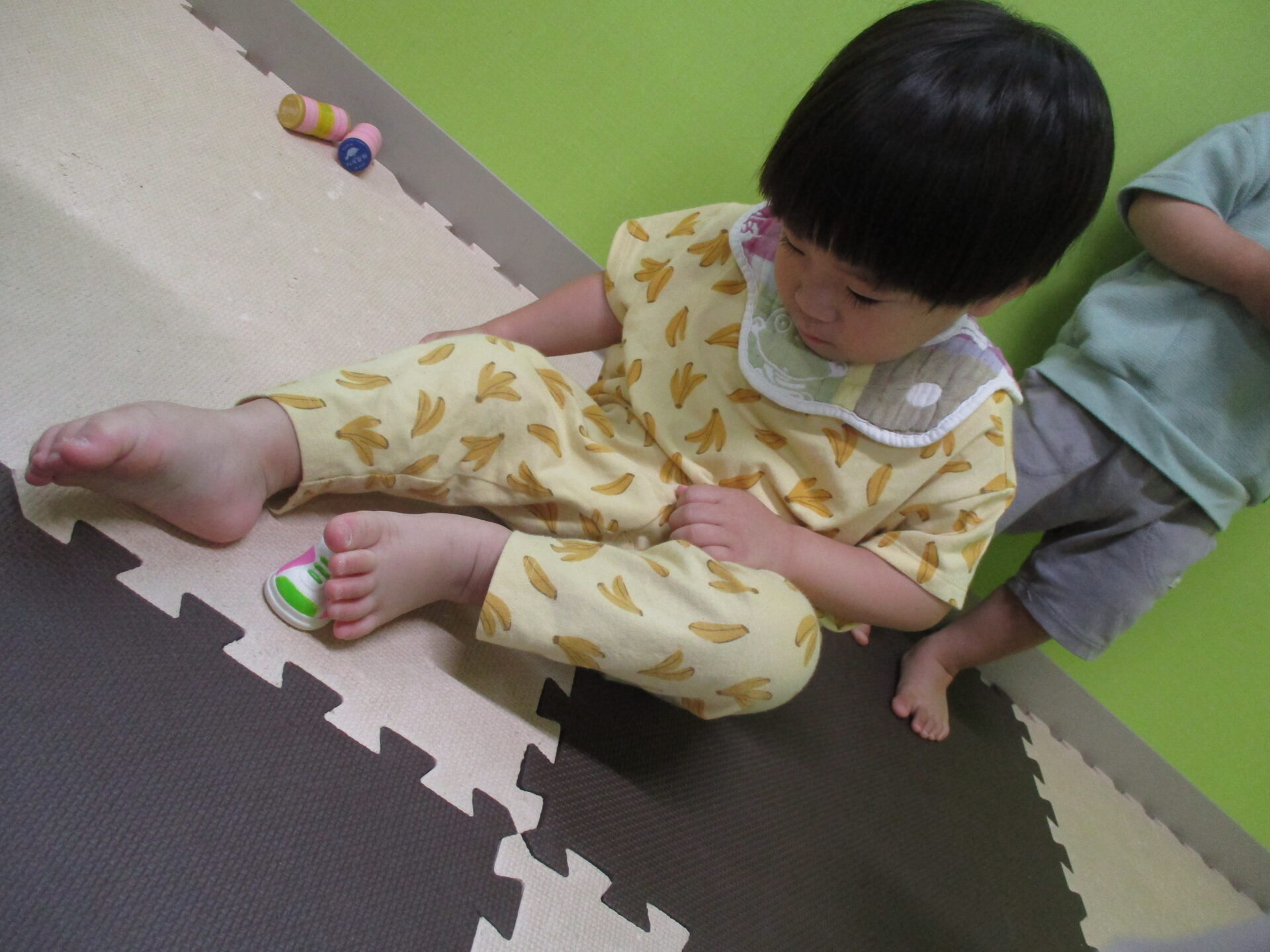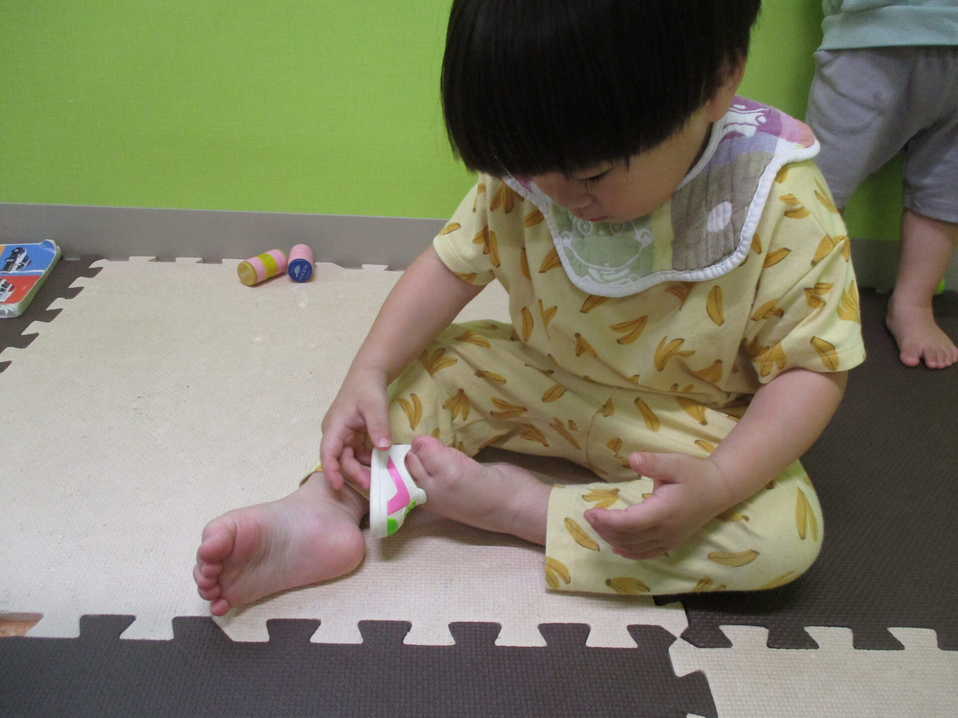 はけたよ はけた!可愛く履けています。靴を履く習慣がちゃんとできていて、「履く」ことへの意欲が感じられた瞬間でした。
