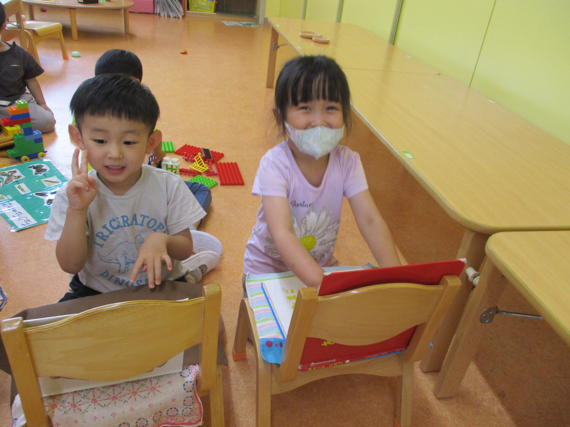 3歳児にじチームでは、ごっこ遊びが盛んです。おかあさん・おとうさん・猫・お姉ちゃん・あかちゃん…などなど、なりきって遊んでいます。そんな中でも、スマートフォンやパソコンなどを使っている人の模倣をする子が増加中!