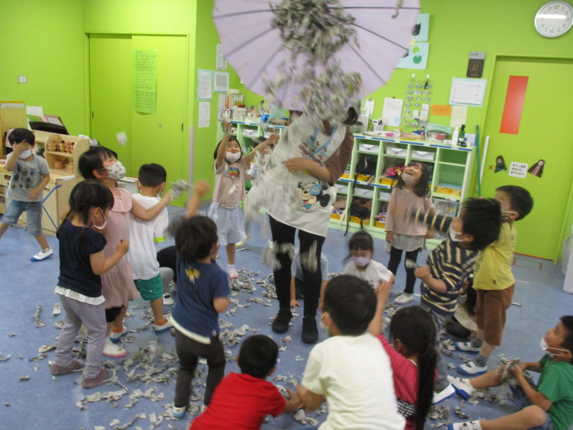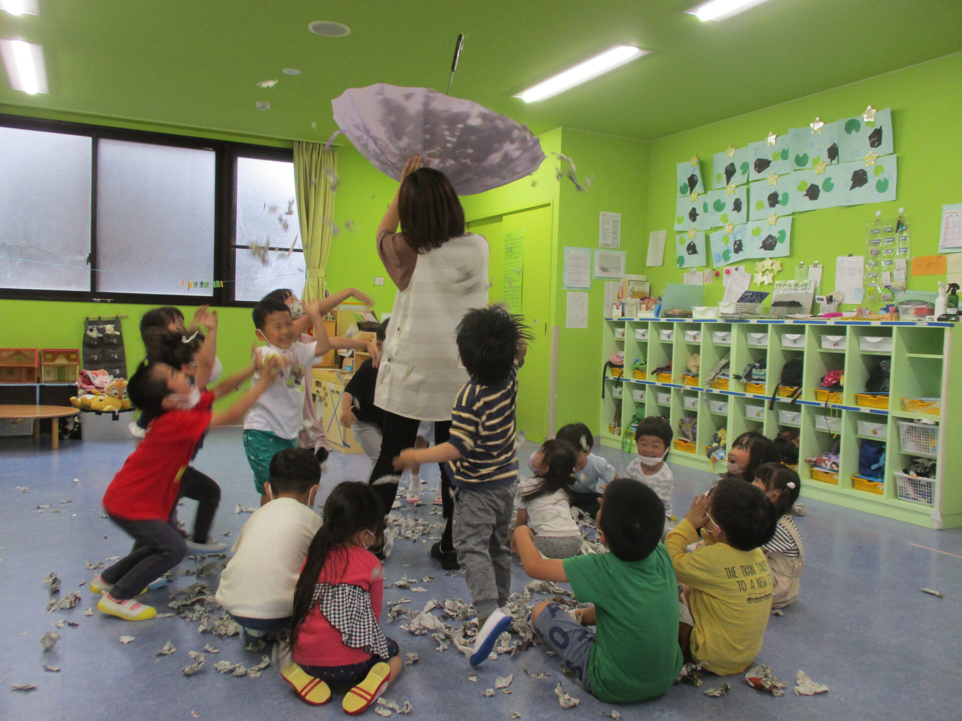 4歳児そらチームは傘を使ってお部屋で楽しみました。