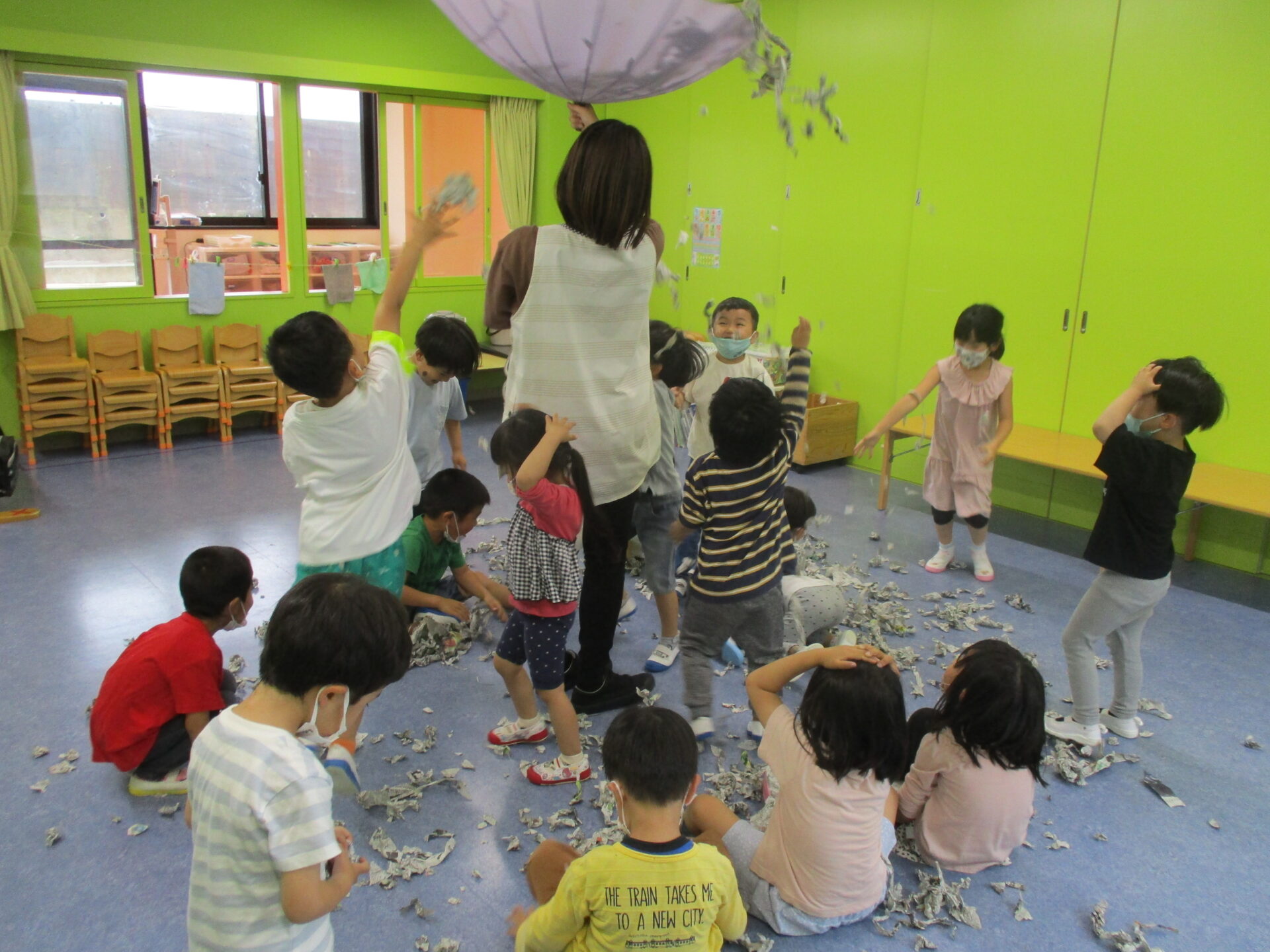 保育教諭の掛け声とともに、ザーーーーーっと新聞紙の雨が!「キャー!ふってきたー!」と大騒ぎに。またはじめから傘に新聞紙を入れて、ザーーーーッと降らせる、の繰り返し遊びです。なんどもなんどもやりとりをして存分に楽しみました。
