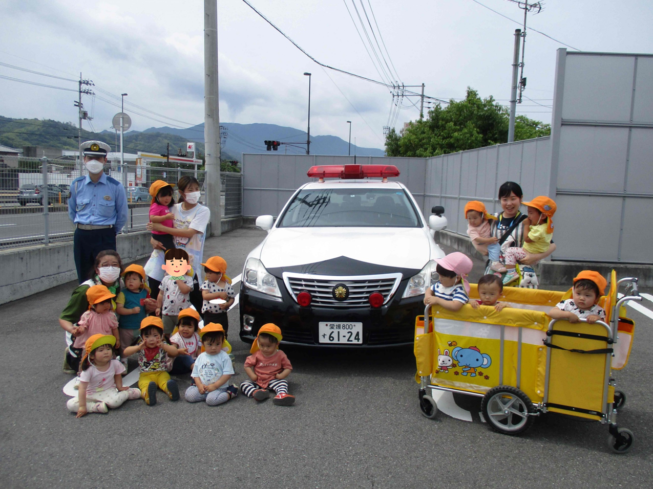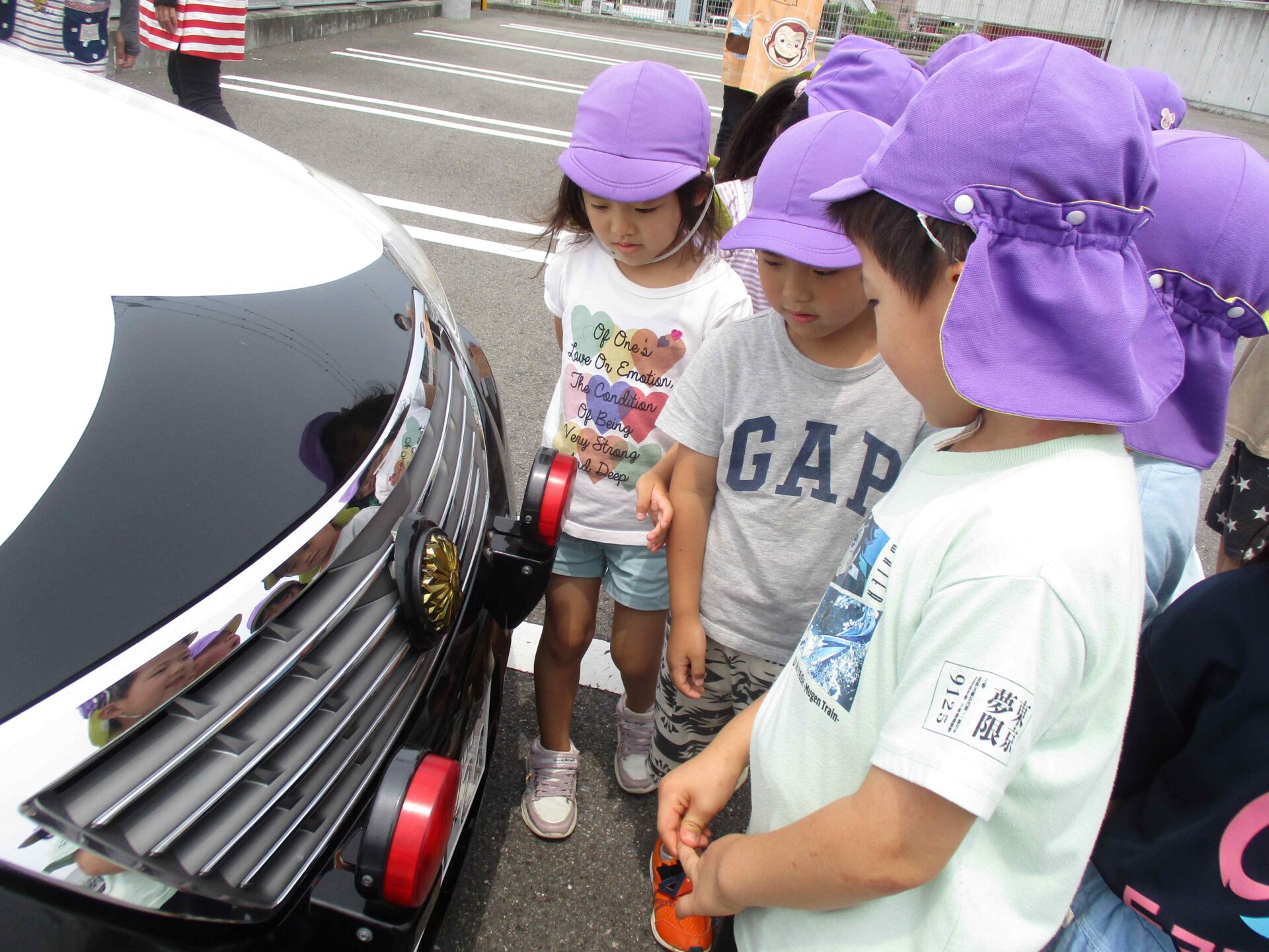 うみ・だいちチームの0・1・2歳児のお友達は、間近で見るパトカーに大興奮で写真撮影。