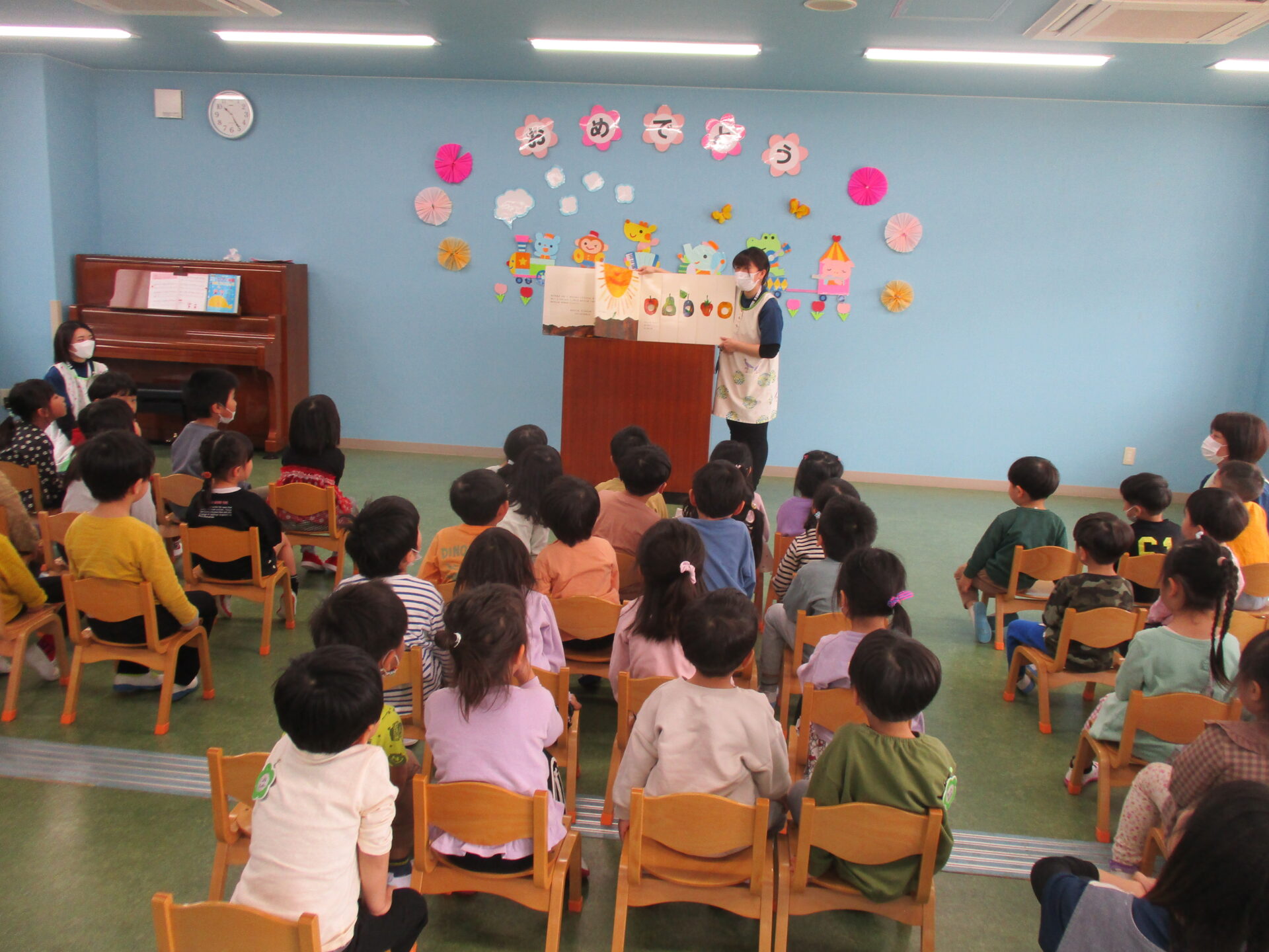 今年度はじめてのお楽しみコーナーは、みんなが大好き『はらぺこあおむし』の大型絵本を保育教諭のアカペラにあわせて楽しみました。保育教諭の美声に負けないくらいのかわいい歌声で、こどもたちも一緒に歌ってくれました♪