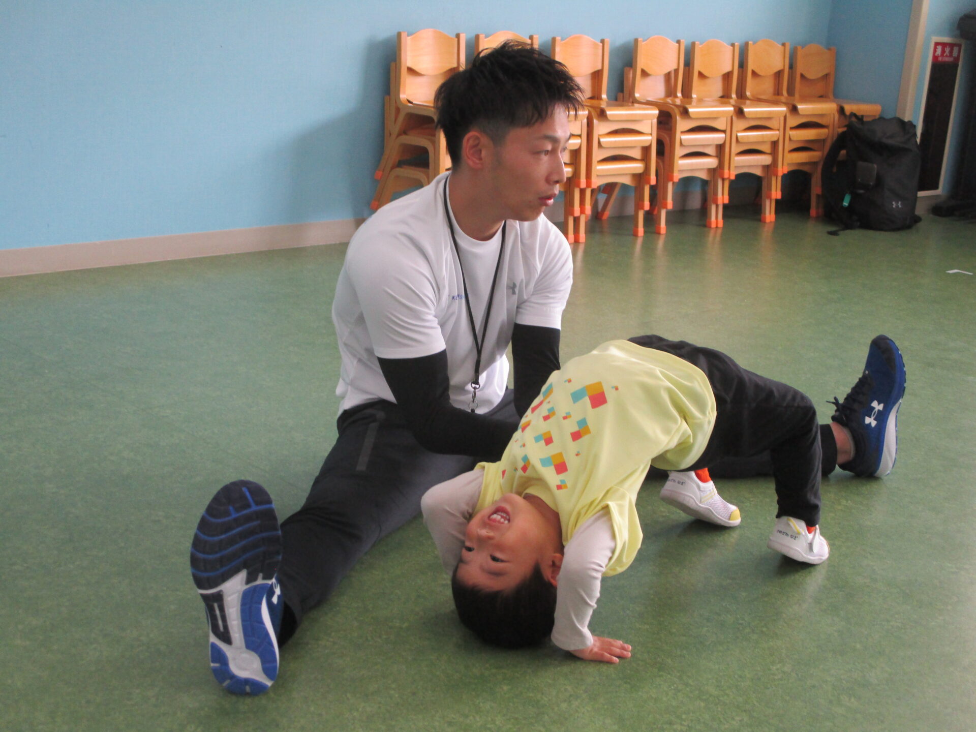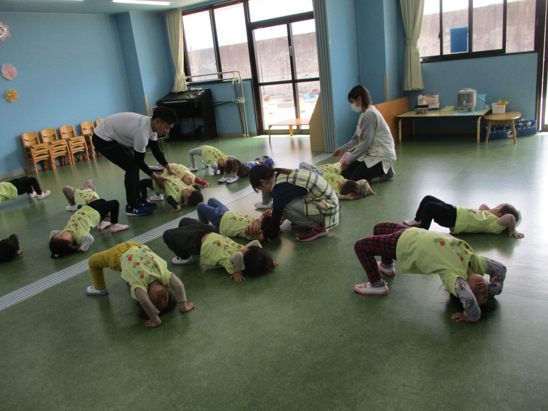 ブリッジにも挑戦です。けんしょう先生が、体の使い方について、一人ずつ丁寧に教えてくれます。