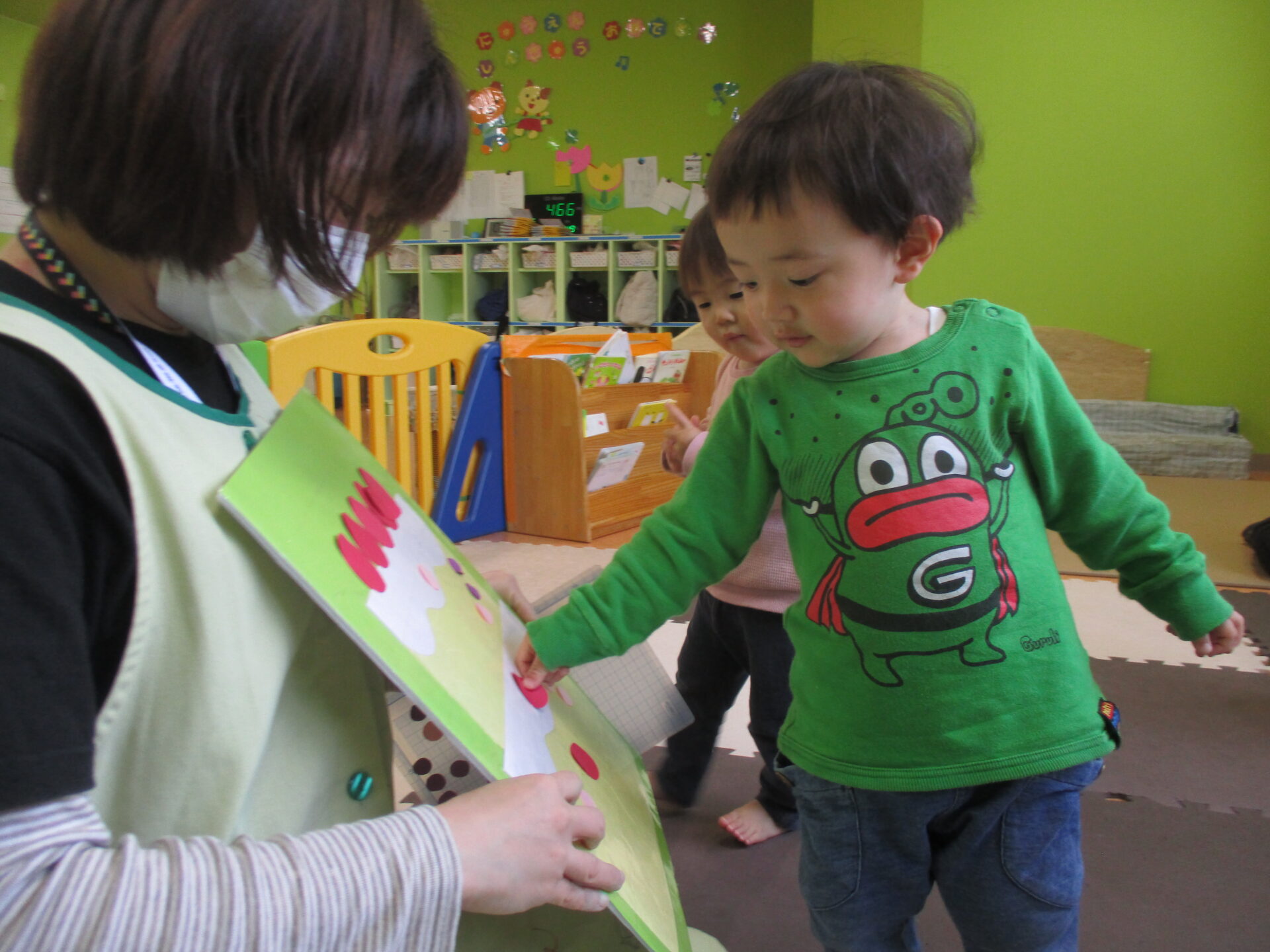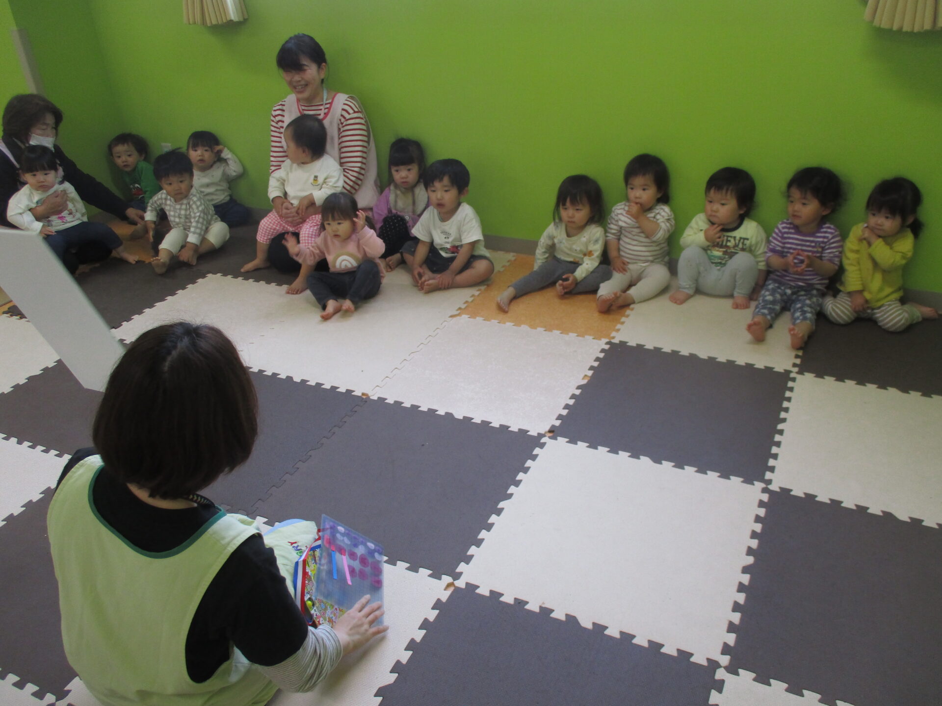 保育教諭が、「壁にぺったんこ~」と声をかけると、背中を壁にくっつけてお話を聞くのがだいちチームのスタイル。お友達と場所を譲り合いながら、ちょこんと座る姿がとってもかわいいです。