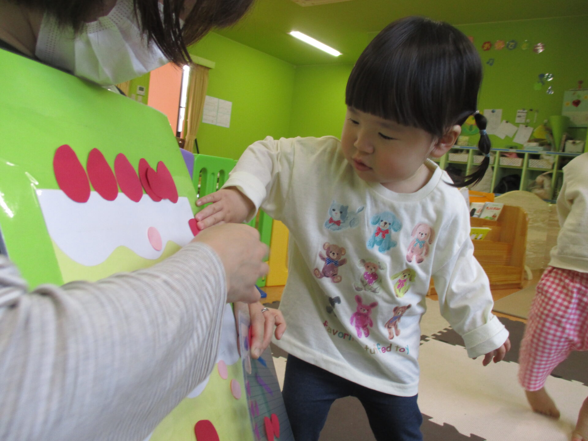 今日の誕生会は、みんなで大きなケーキにシールを貼り、デコレーションを楽しみました🎂