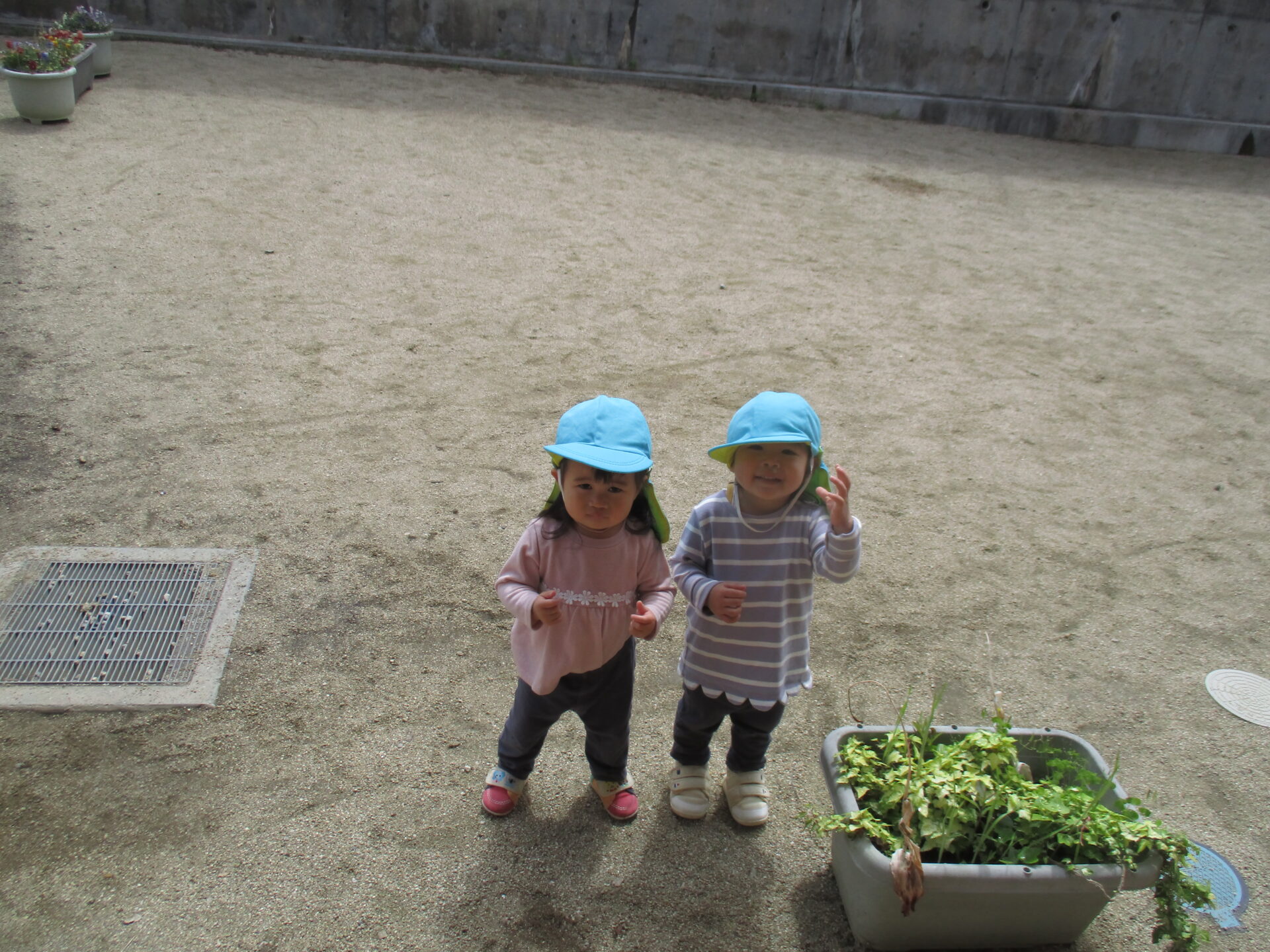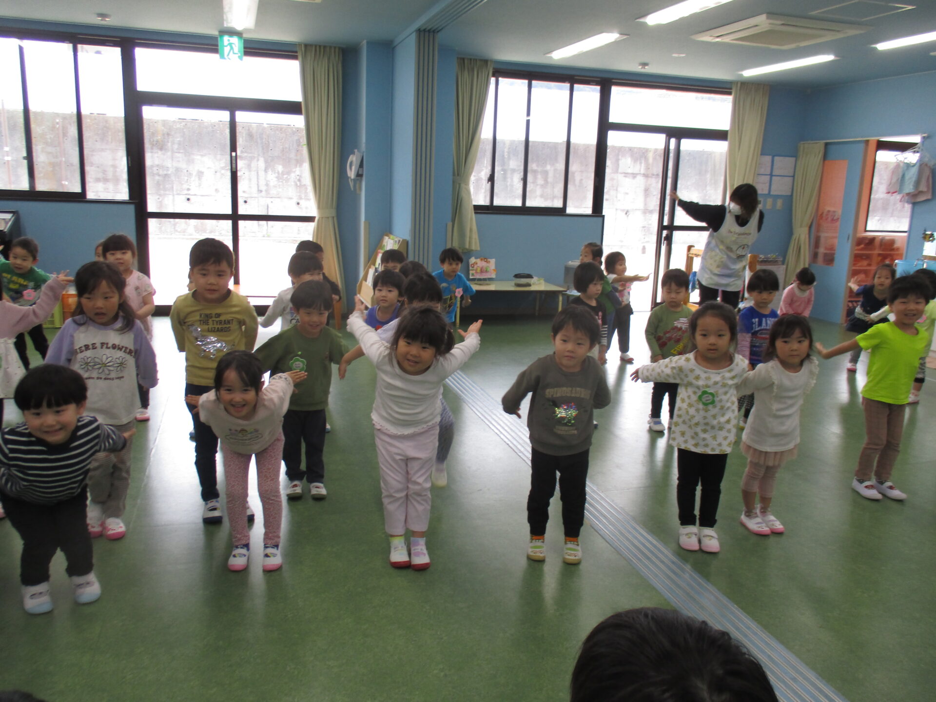 園庭で遊んでいた1歳児のお友達も、窓の外で一緒に体操をしていました。かわいい♪