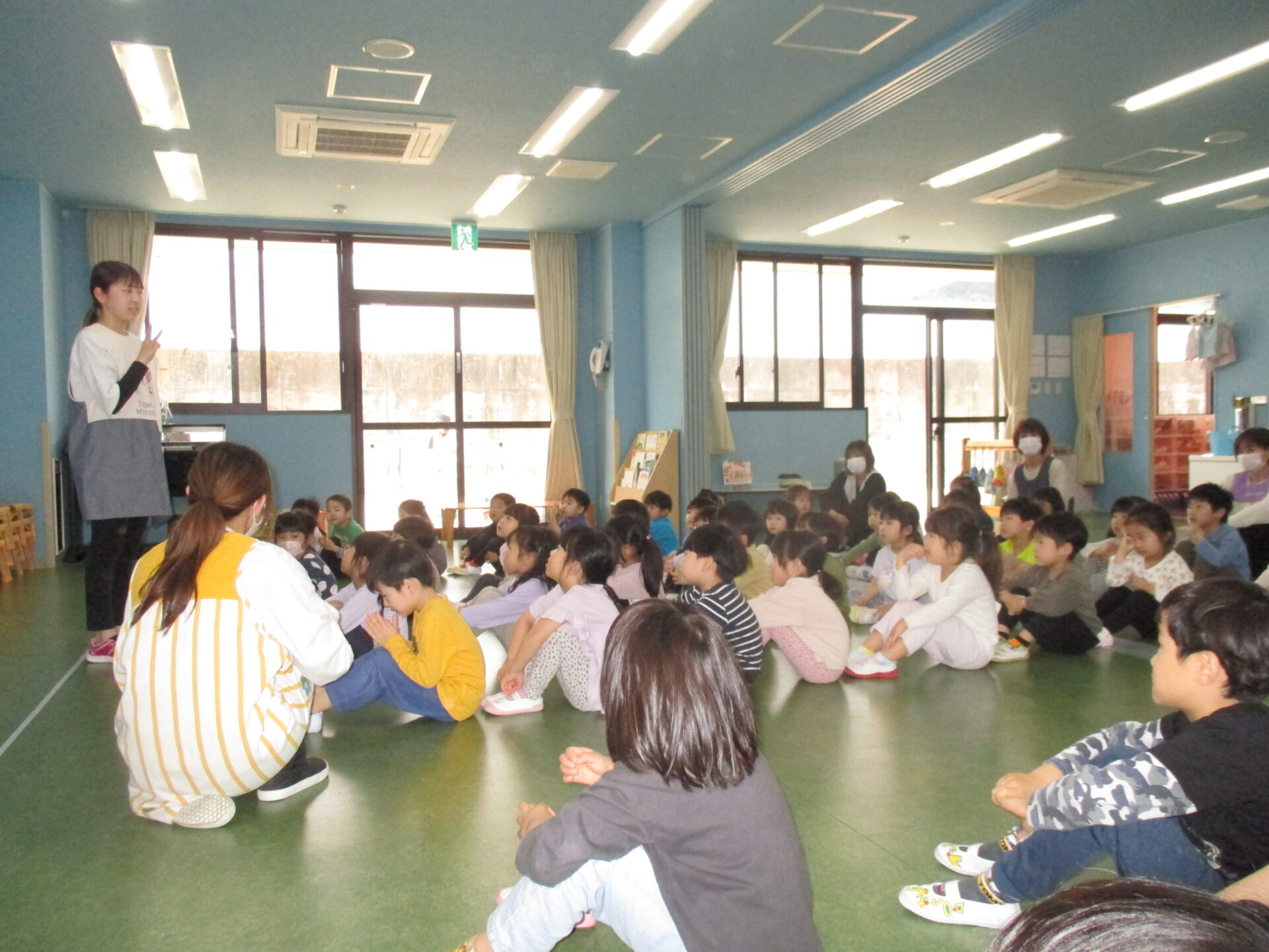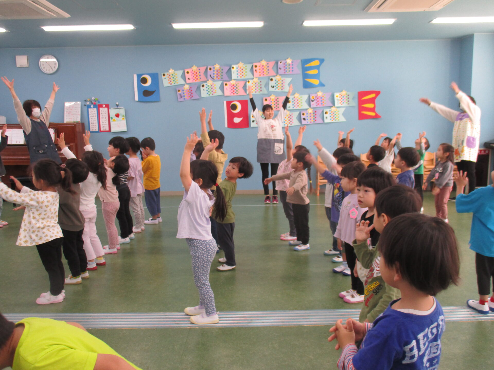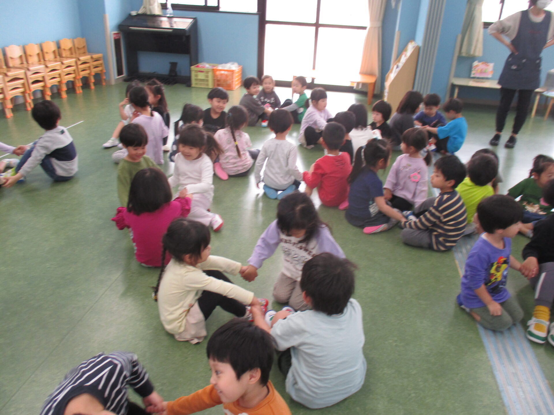 5月8日水曜日。GW明けの1階ホールには、3・4・5歳児が集まっていました。