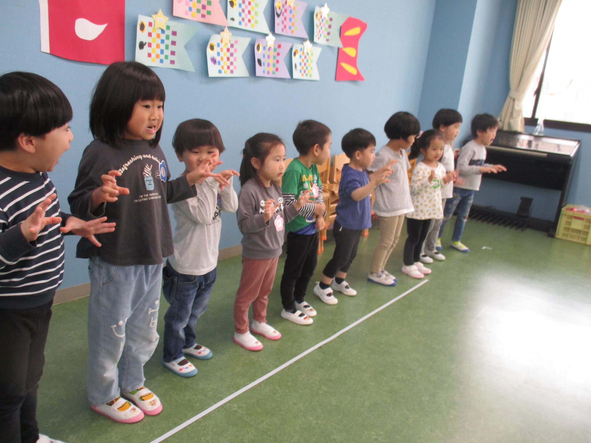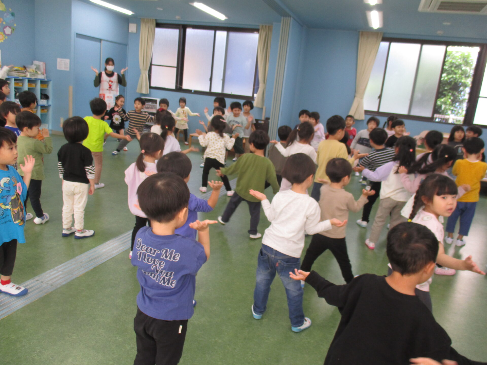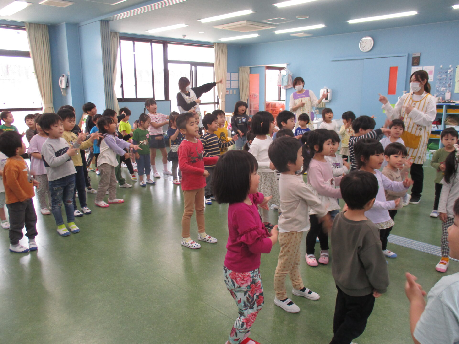 5月8日水曜日。GW明けの1階ホールには、3・4・5歳児が集まっていました。