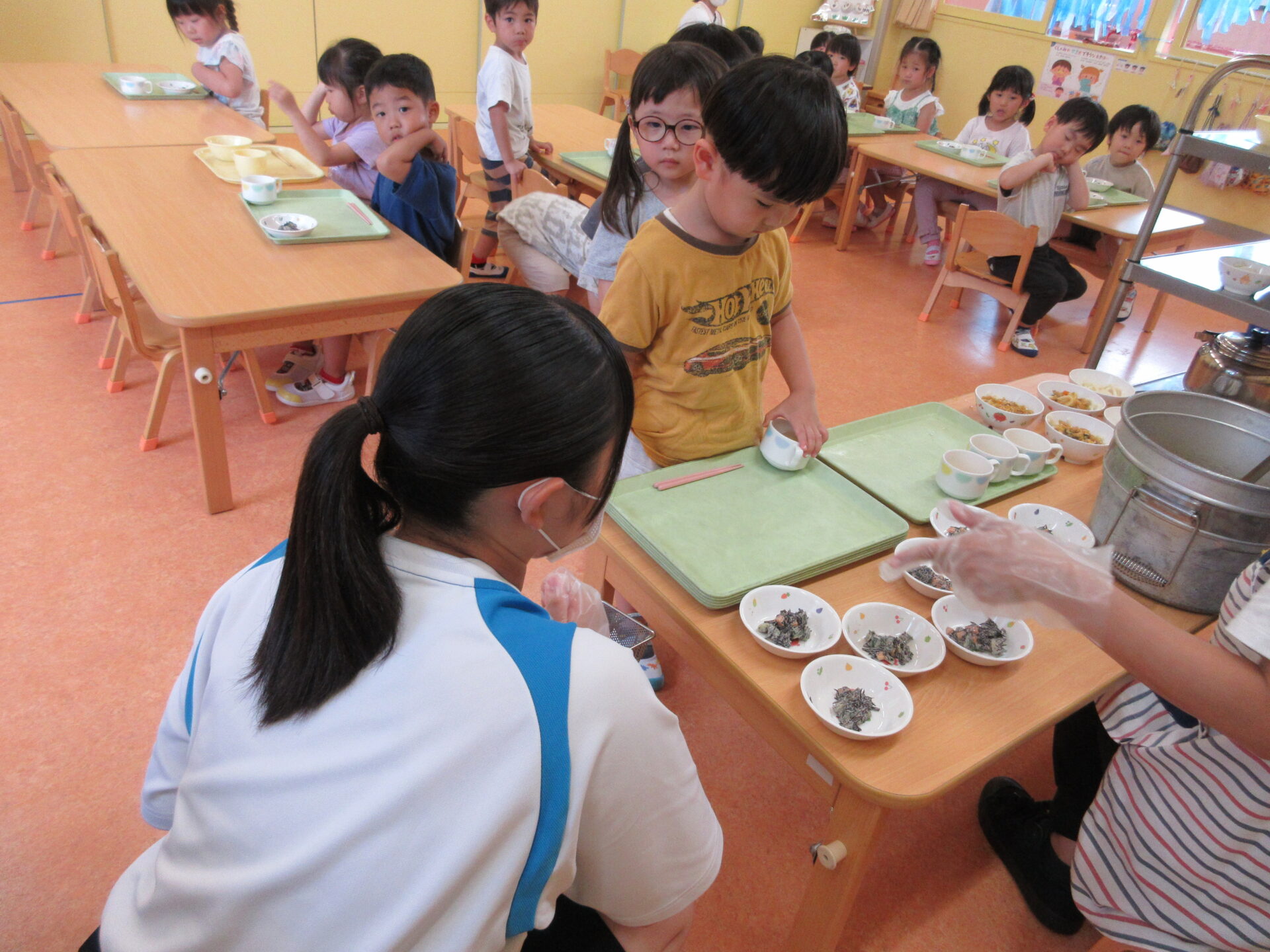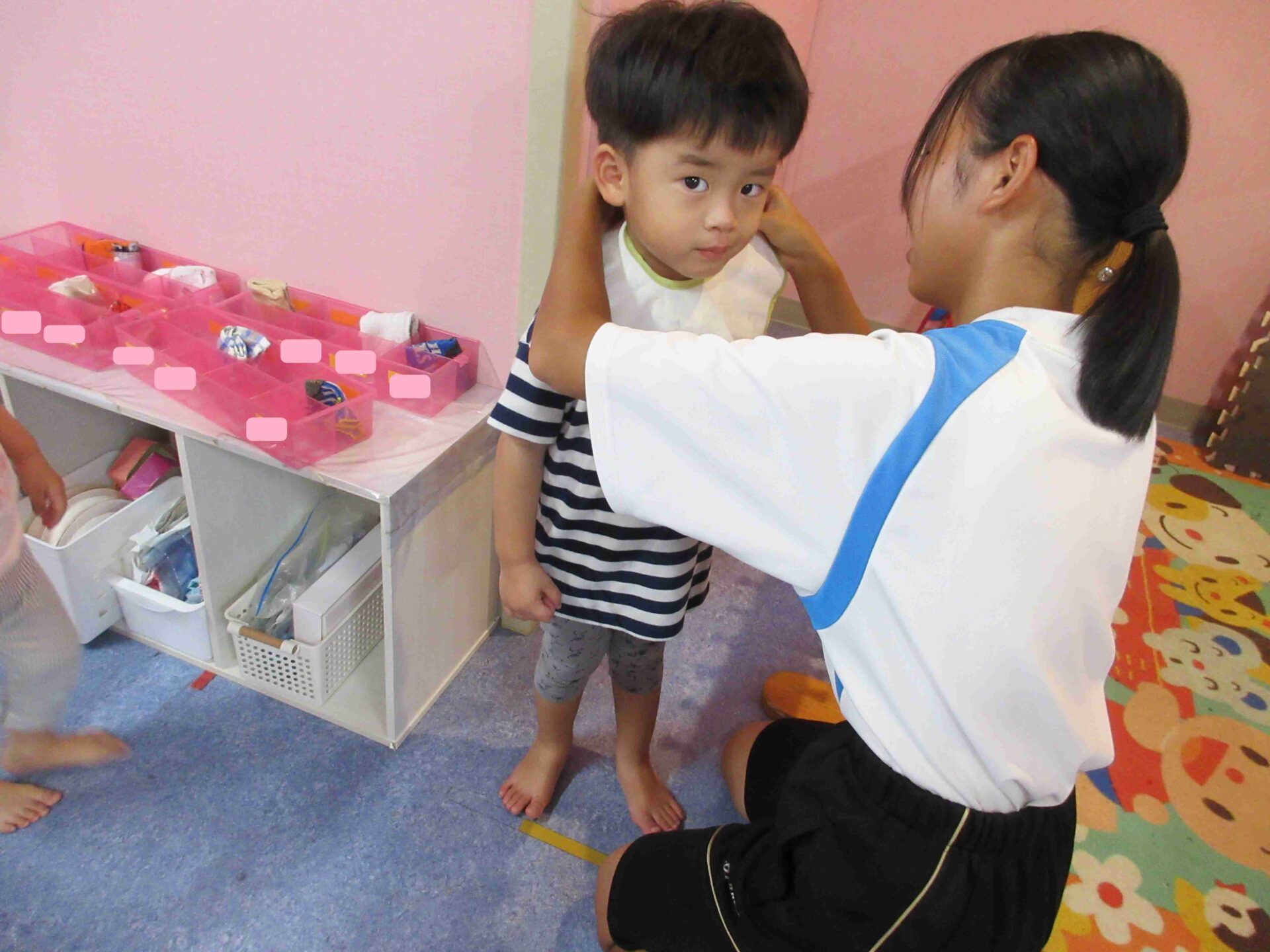 園児たちは、いつもの保育教諭とは違う『お姉ちゃん』とのかかわりを喜んでいます。