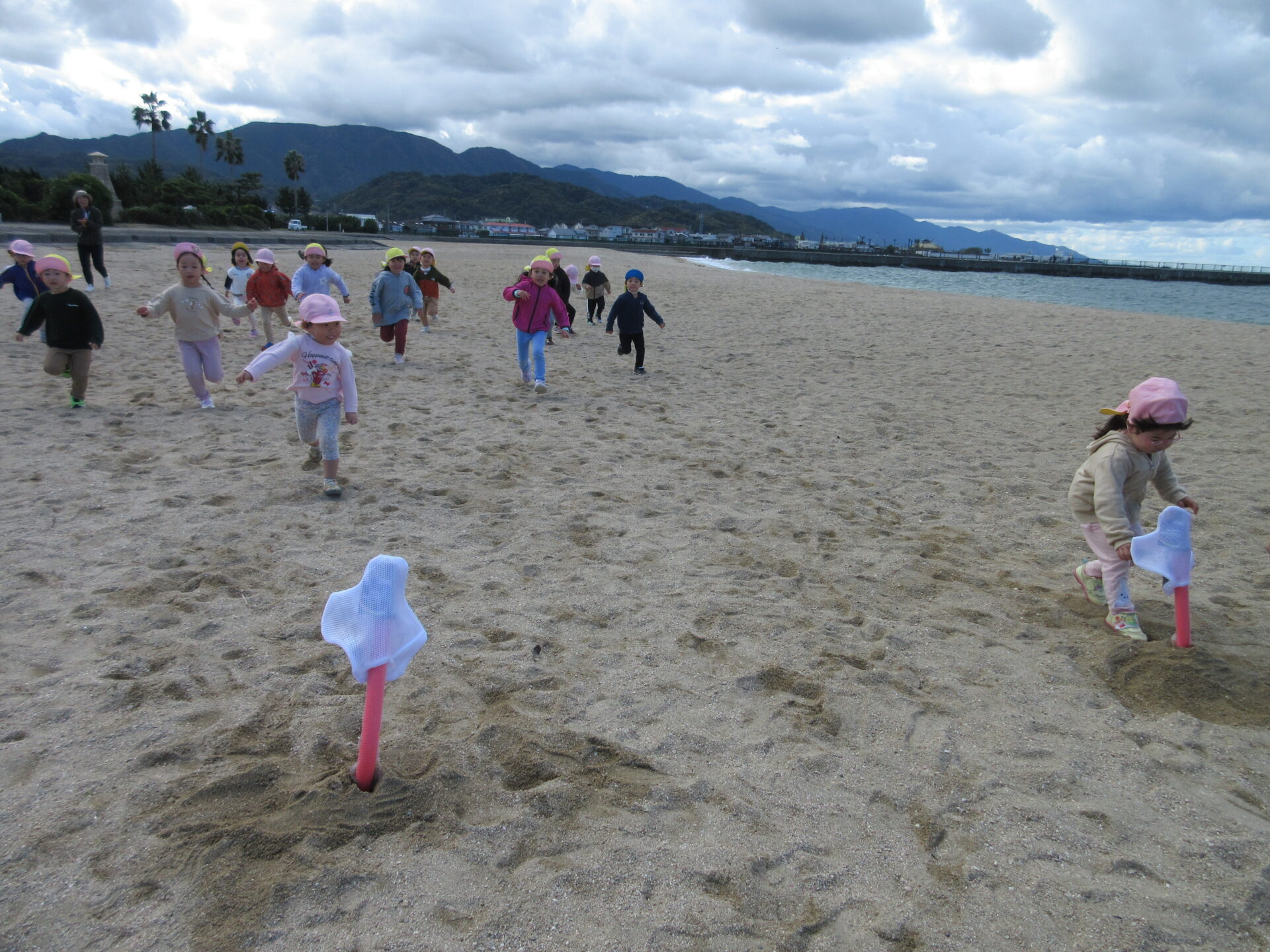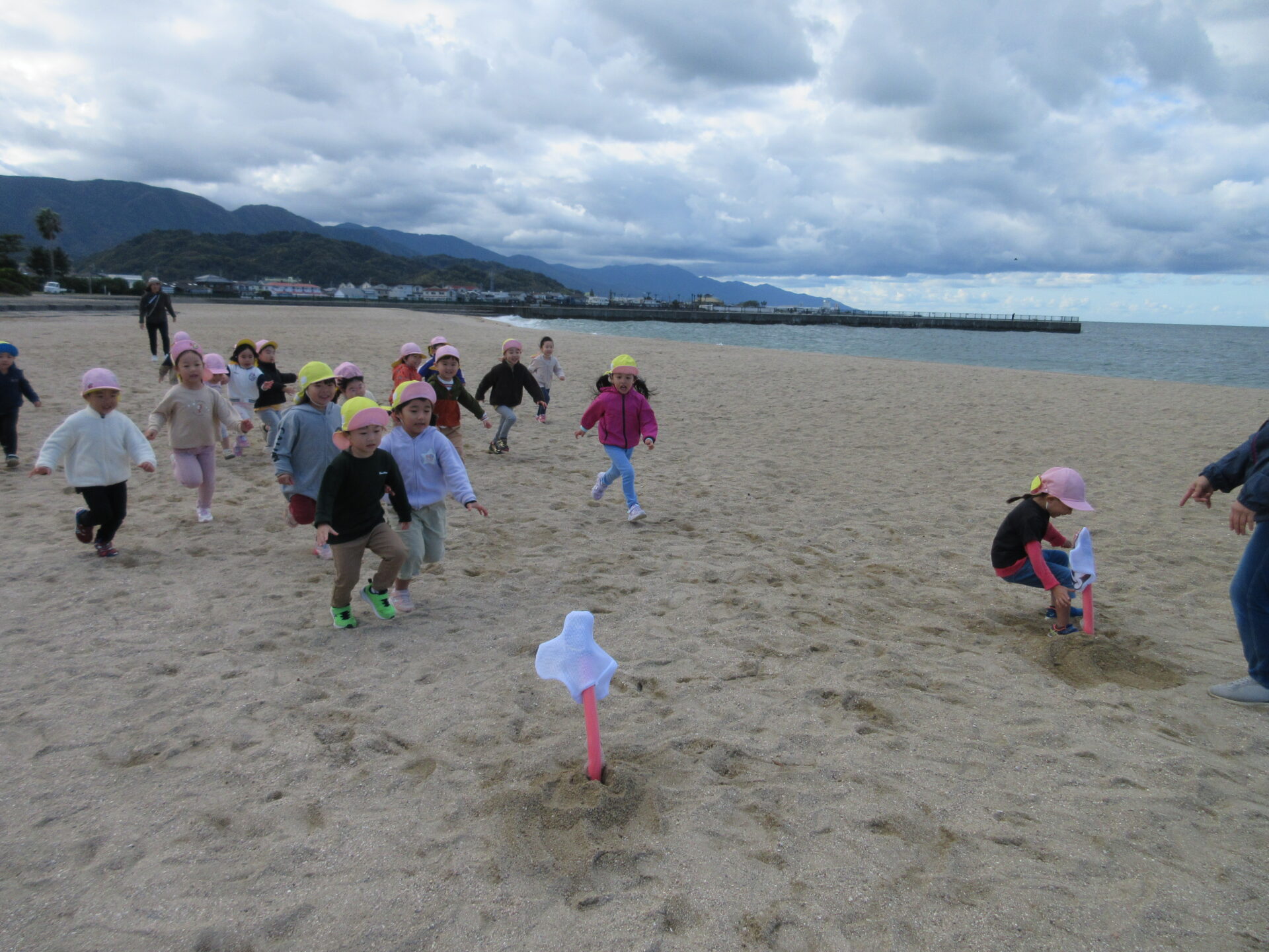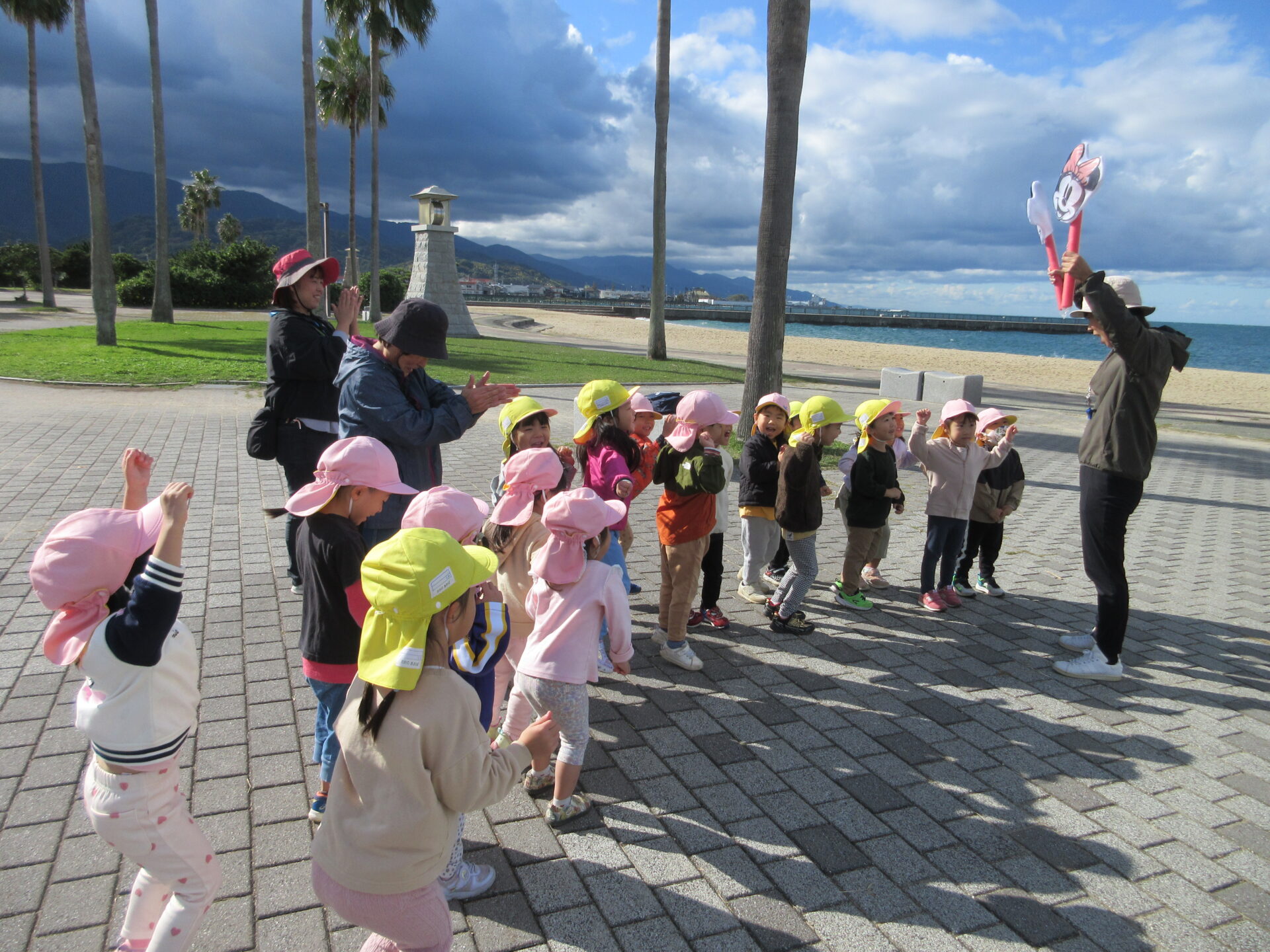 3歳児にじチームは五色浜海浜公園まで散歩しました。目的は…「ビーチフラッグをしたい!」からです。
