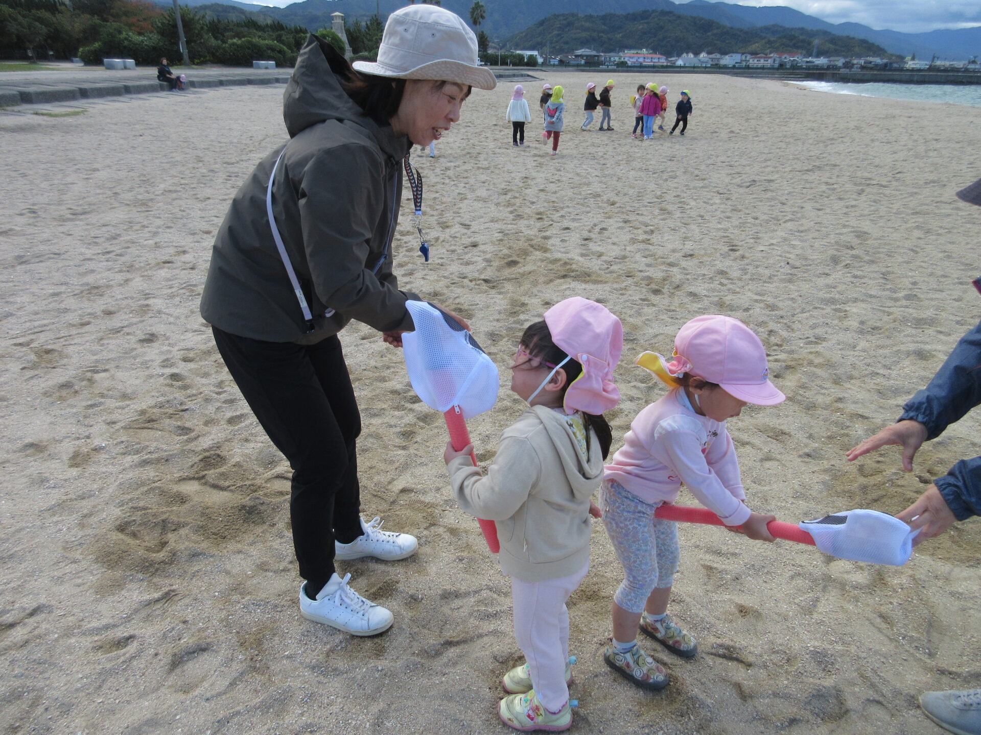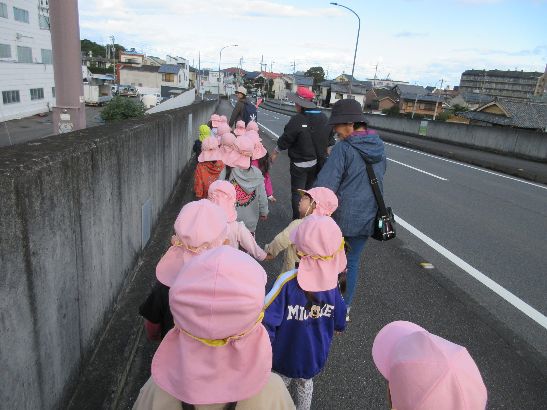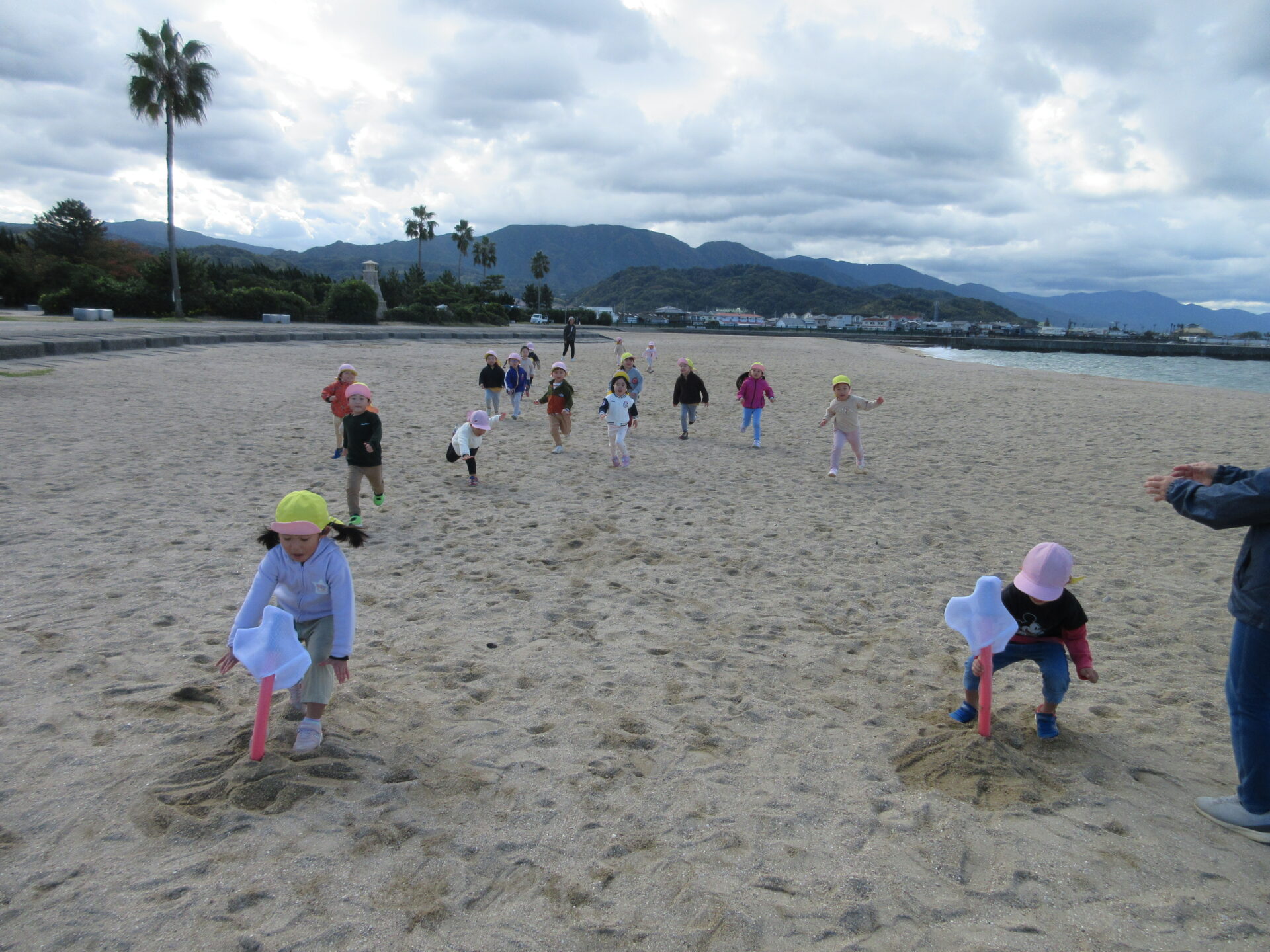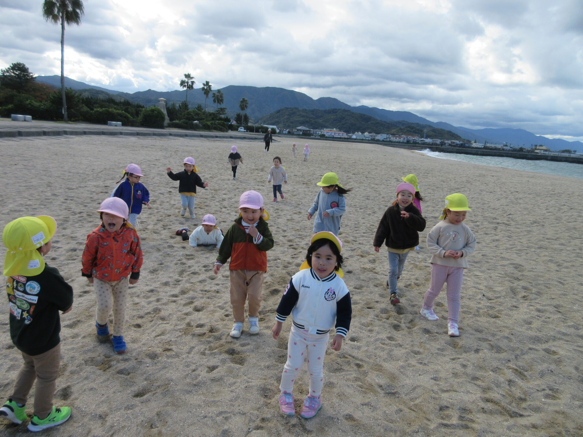 3歳児にじチームは五色浜海浜公園まで散歩しました。目的は…「ビーチフラッグをしたい!」からです。
