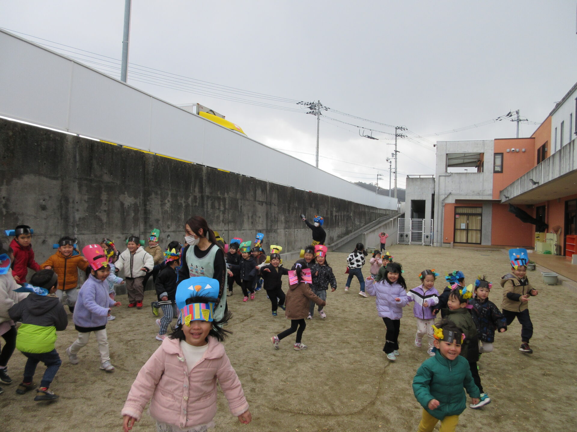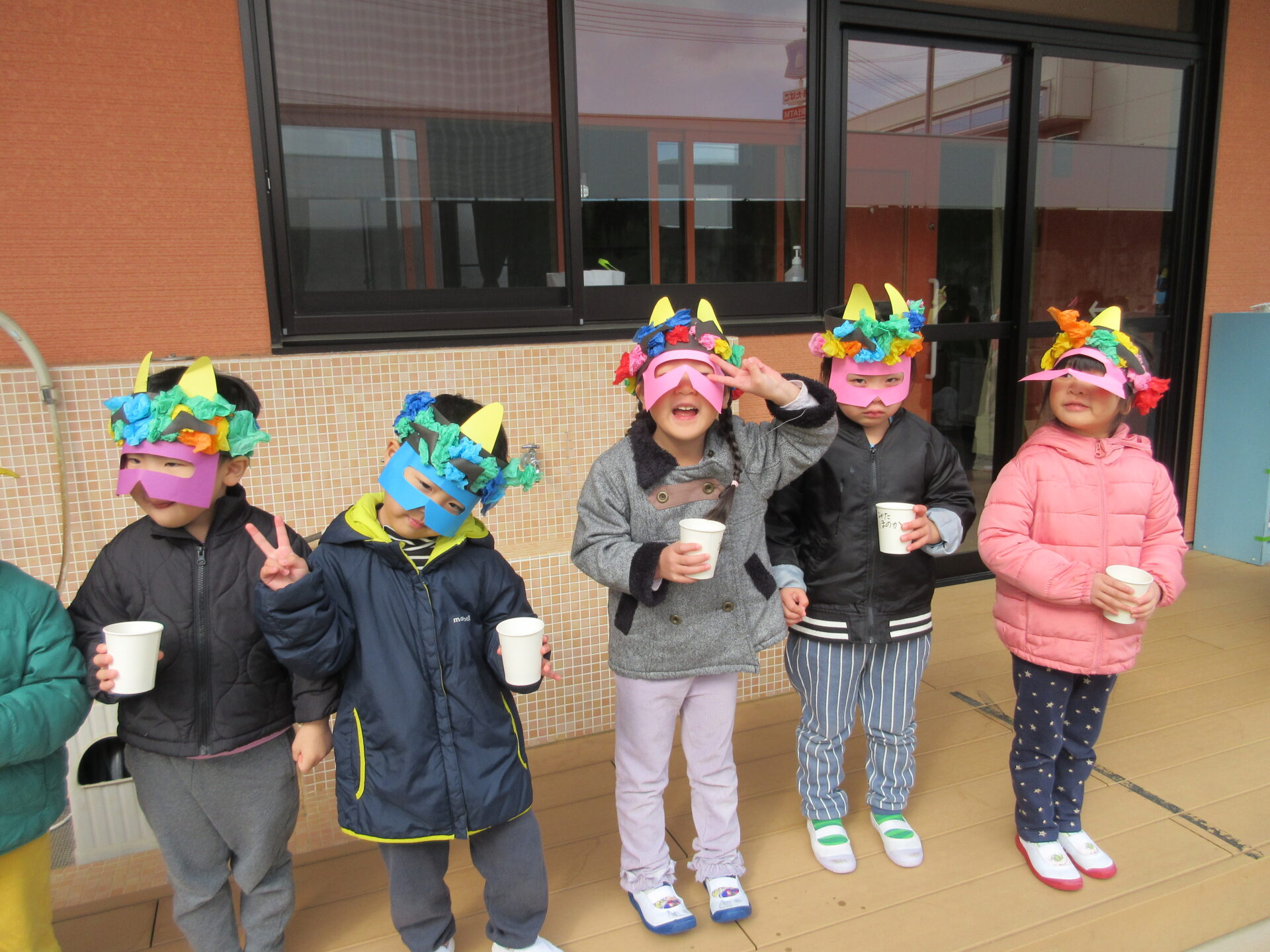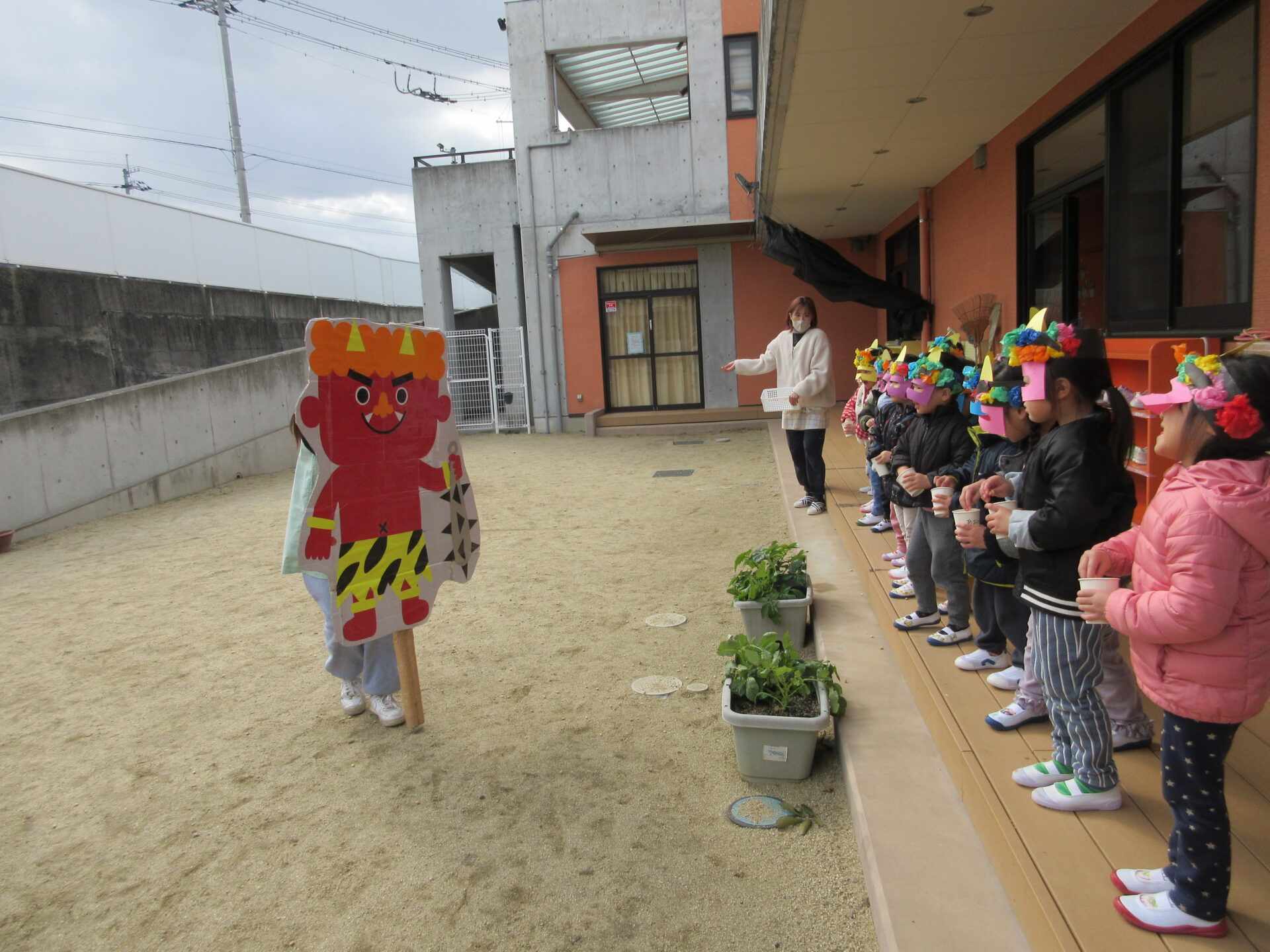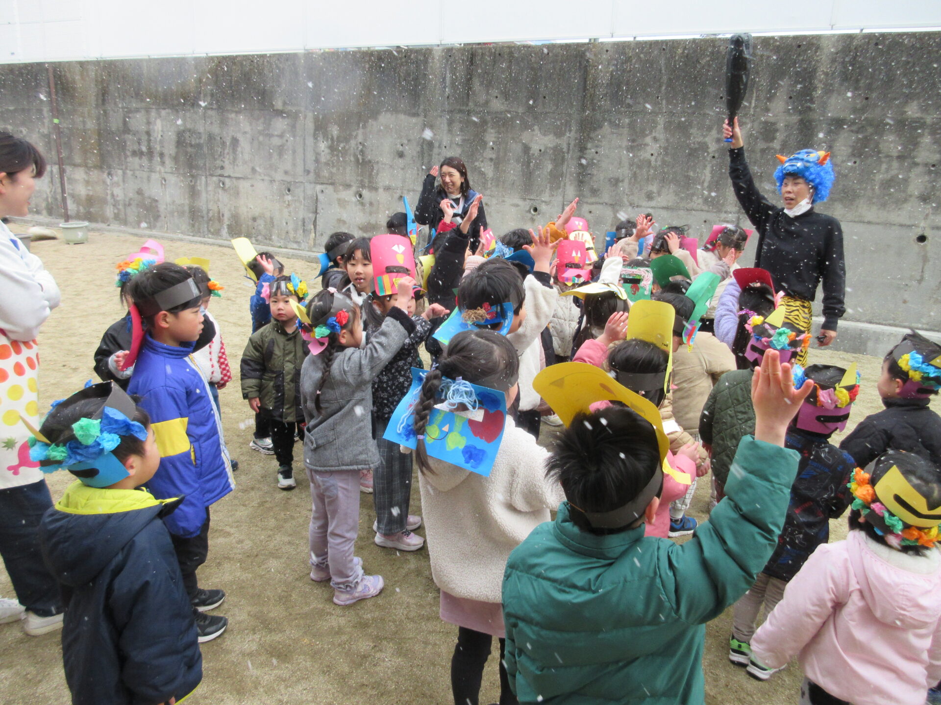 こども園の豆まきはこども達と節分について考えたあと、手作りの鬼のお面を付けて園庭へ!雪がちらつく中、「鬼は外!福は内!」と威勢のいい掛け声とともに豆をまきました。