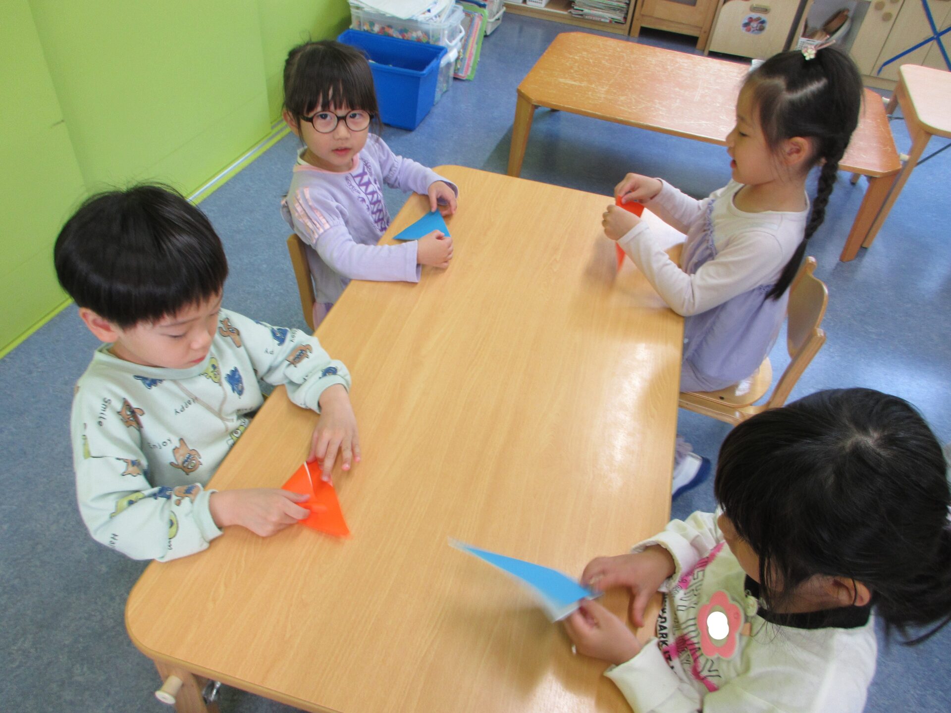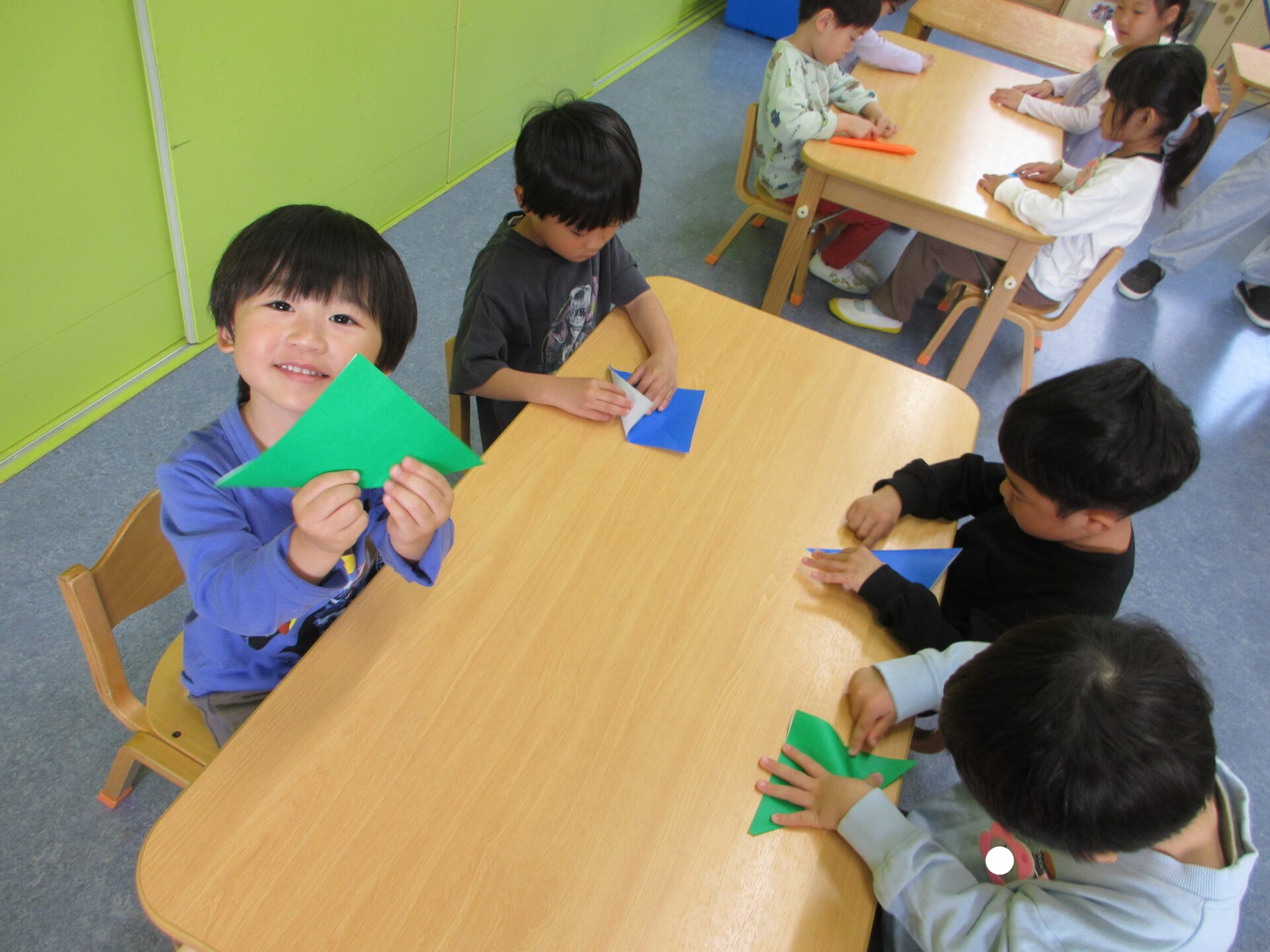 真剣な表情で折り紙に集中したり、「みてみて~!」とできたことを喜んだりするこどもたち😊