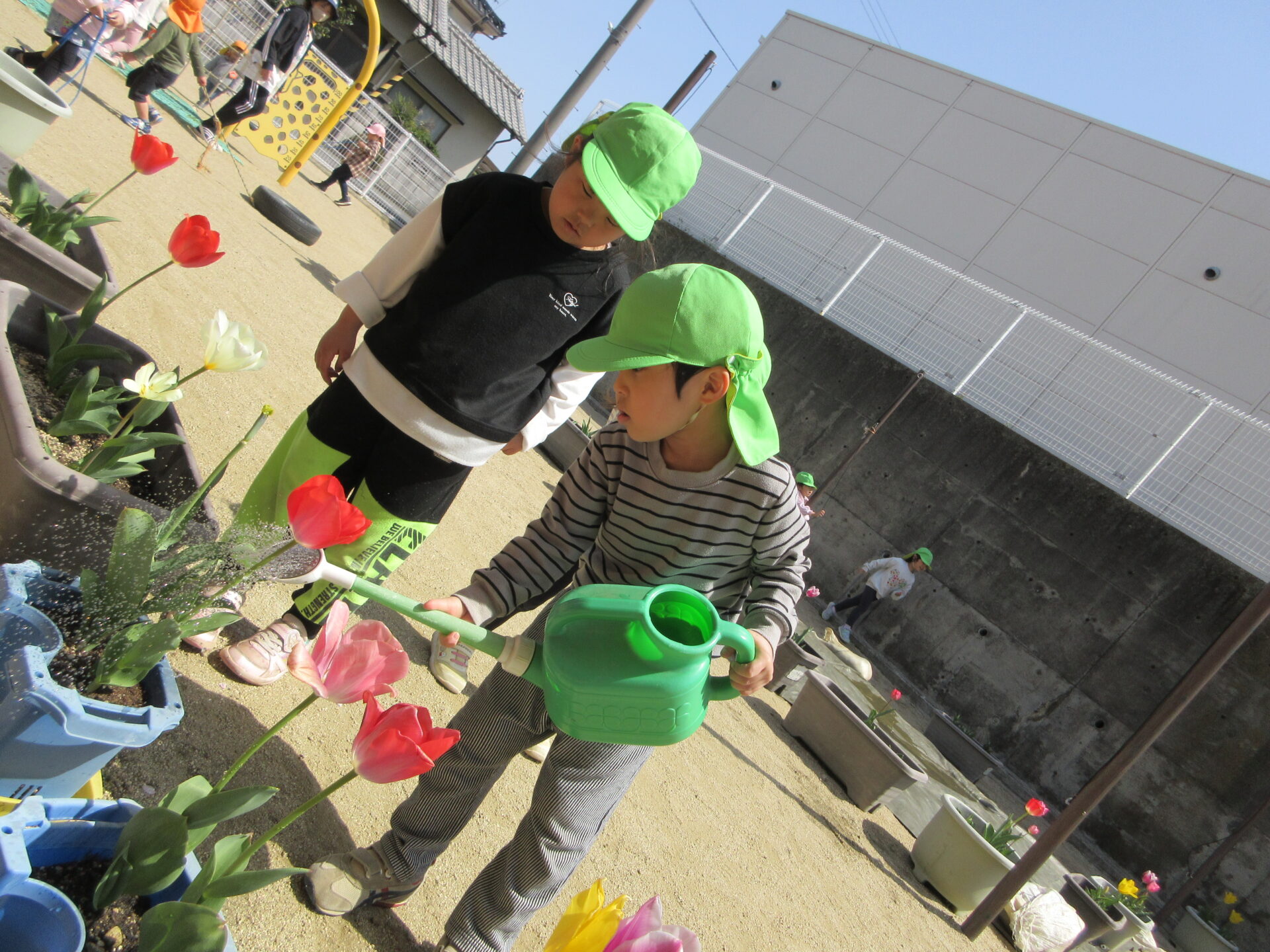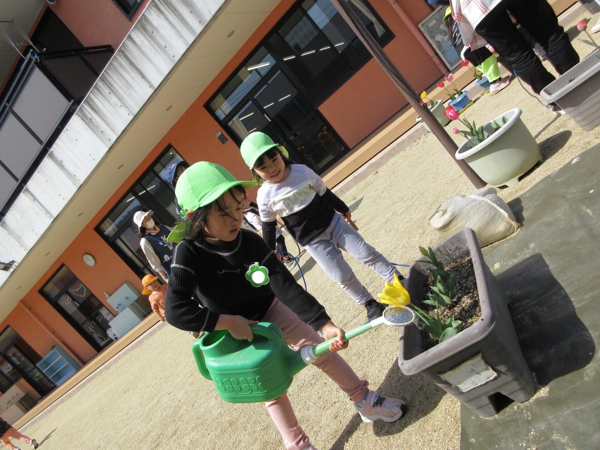 当番活動では、朝や帰り、給食前・後のあいさつ以外にも、くじらチームの靴箱掃除をしたり、天気の良い日には、園庭にある花に水やりをしたり…頑張っています!
