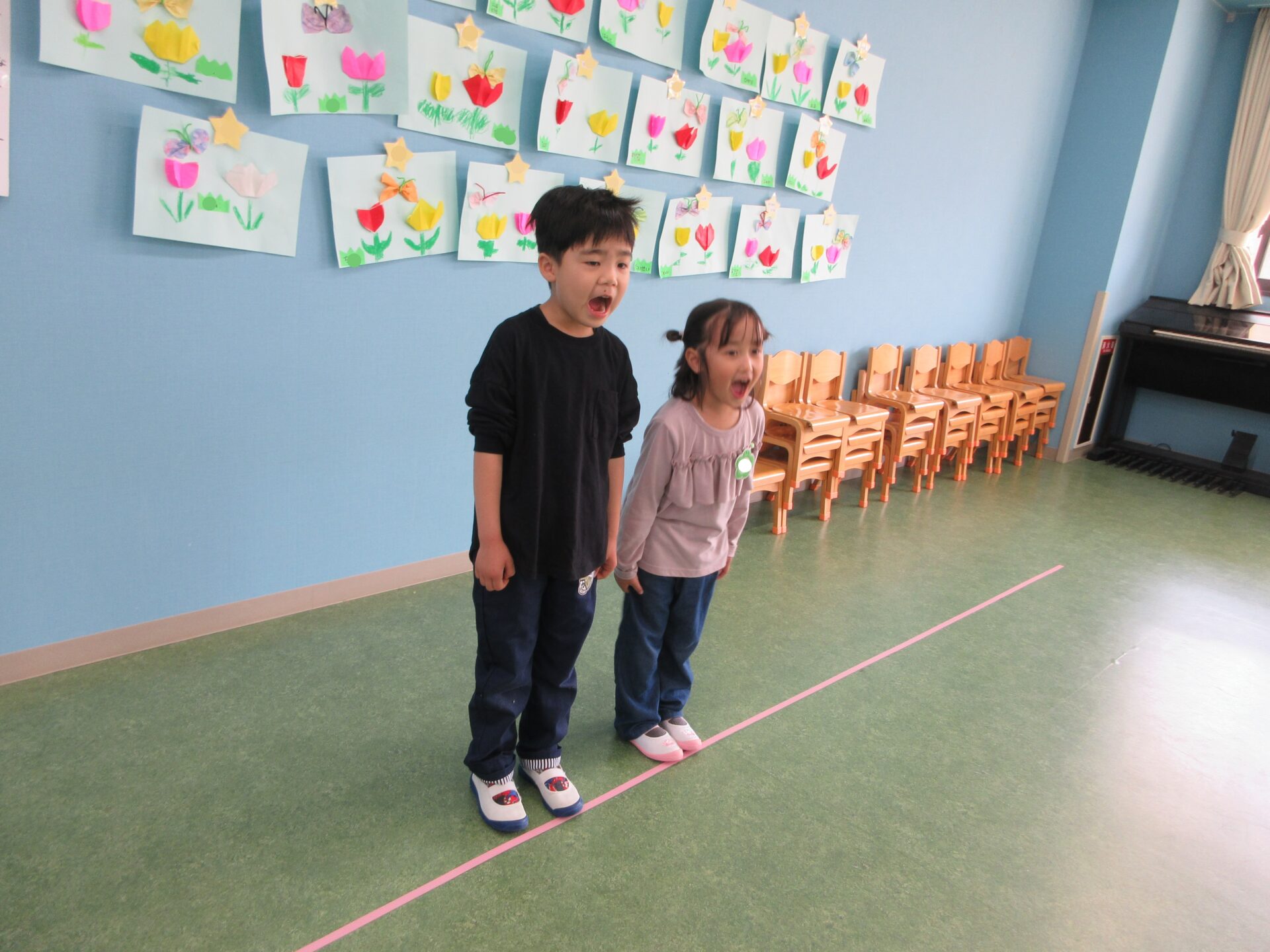 5歳児くじらチームでは毎日、当番活動を2人1組で行います。朝の会を進行した後に、みんなから「お願いします!」と言われると「頑張ります!」とやる気を見せます✨