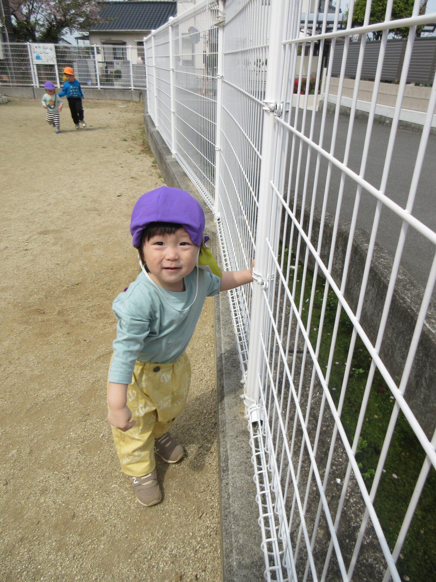 4月のある日…バギーに乗ったり、お友だちや保育者と手をつないだりして、園庭へ😊