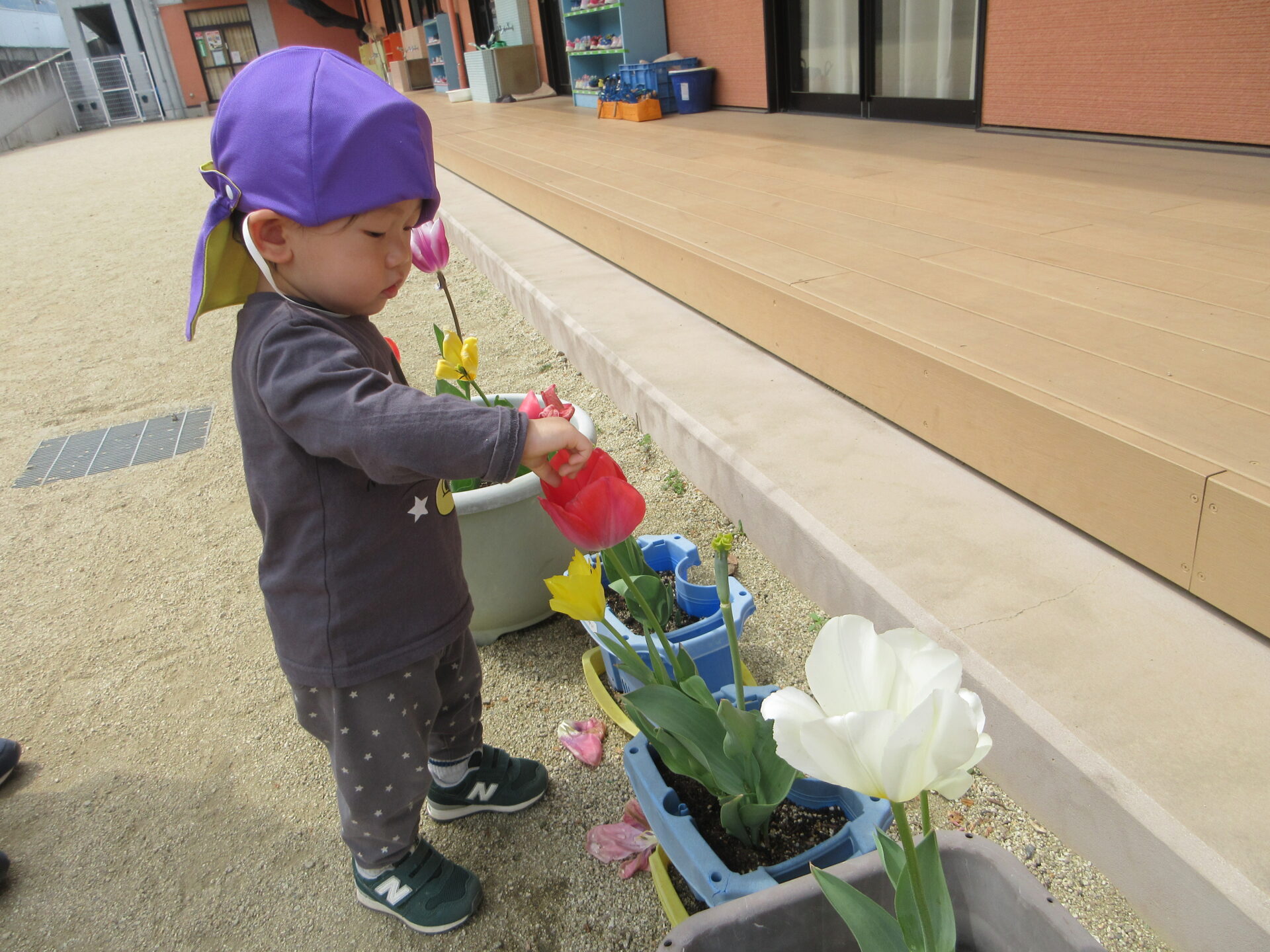 園庭に咲いてある、チューリップを見つけて少しずつ近づいて…