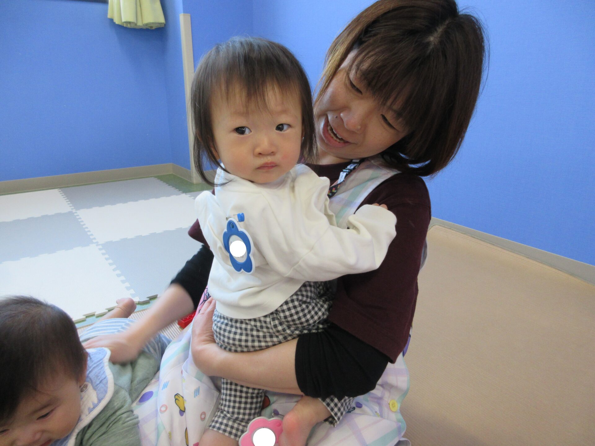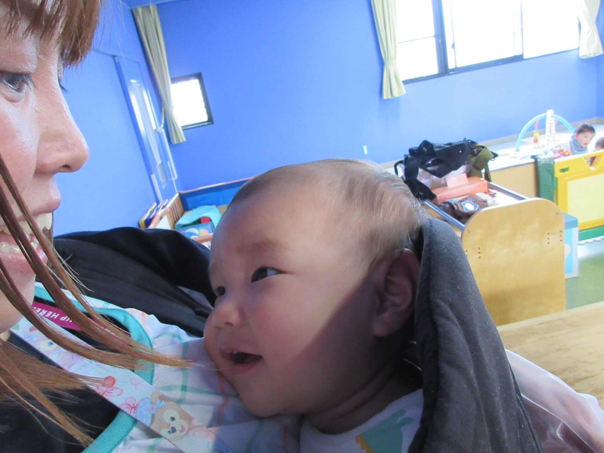 保育者に抱っこされて、この笑顔です😊