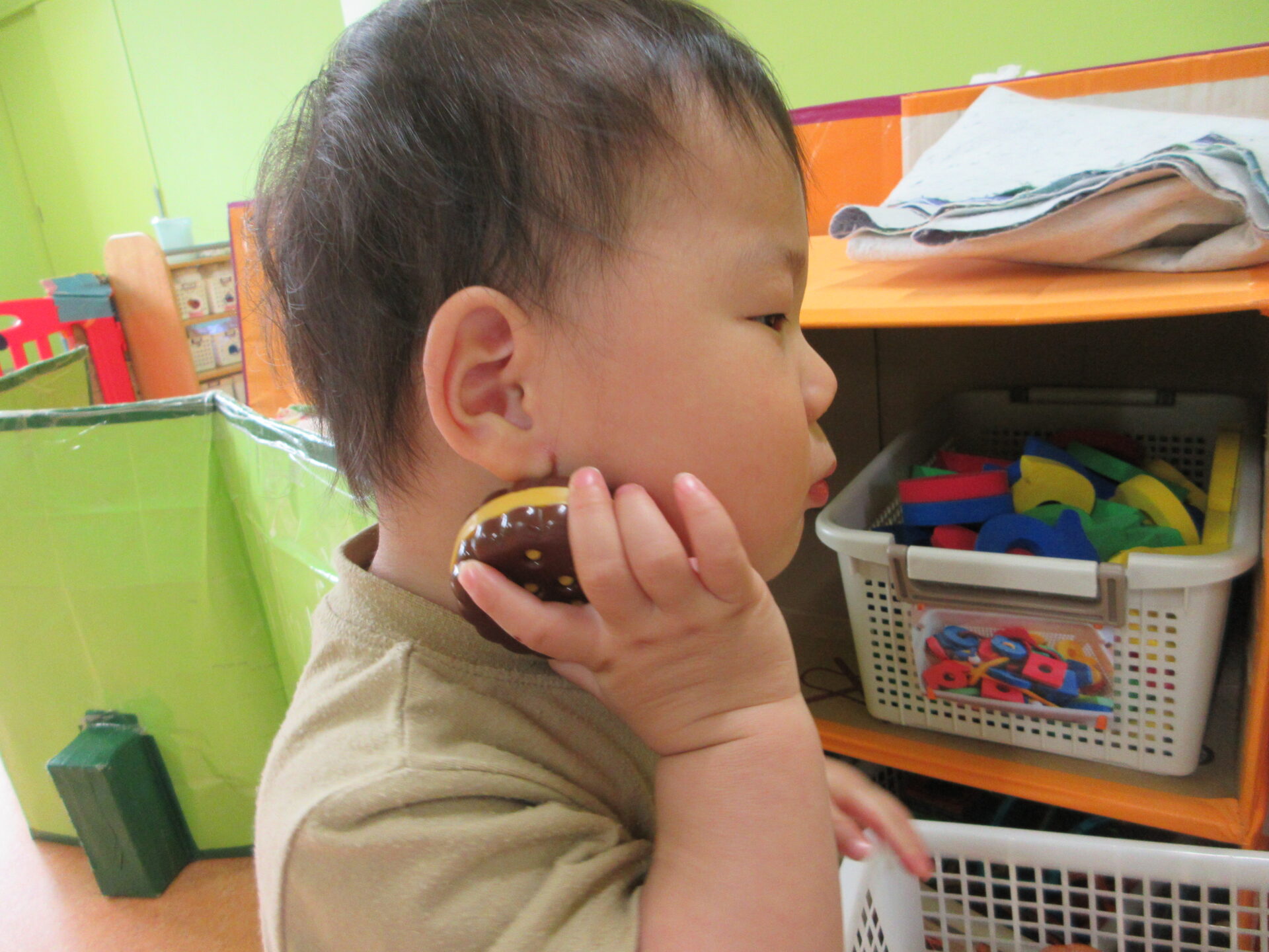 クラスの子機が📞ピリリ…と鳴り、保育者が出て対応していると、それを見ていた1歳児A君が、ままごとのビスケットを耳付近(ほぼ、ほっぺ😊)に当てています。