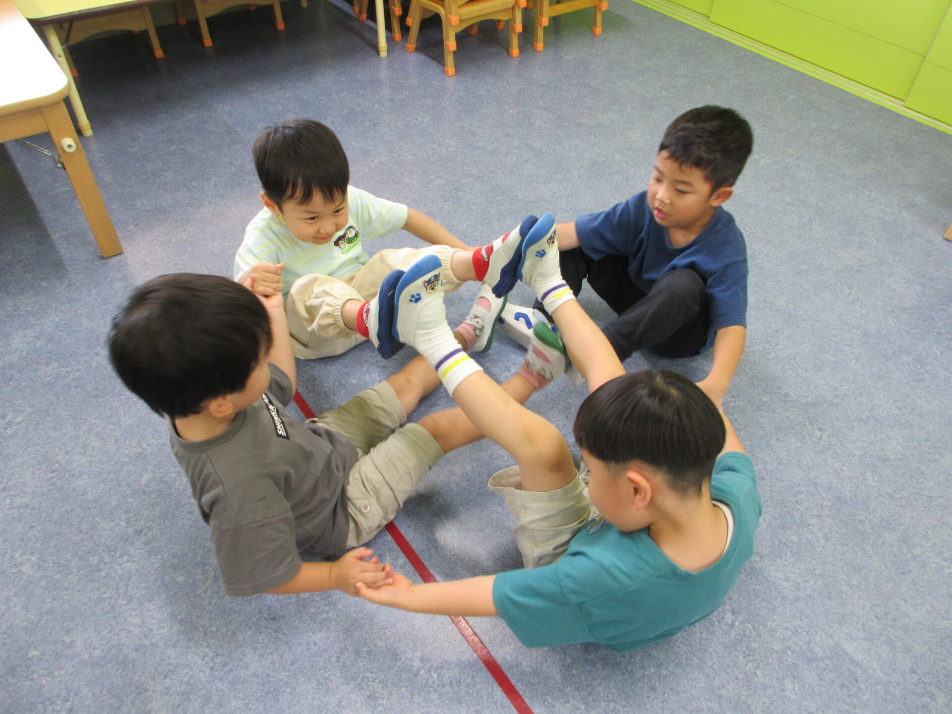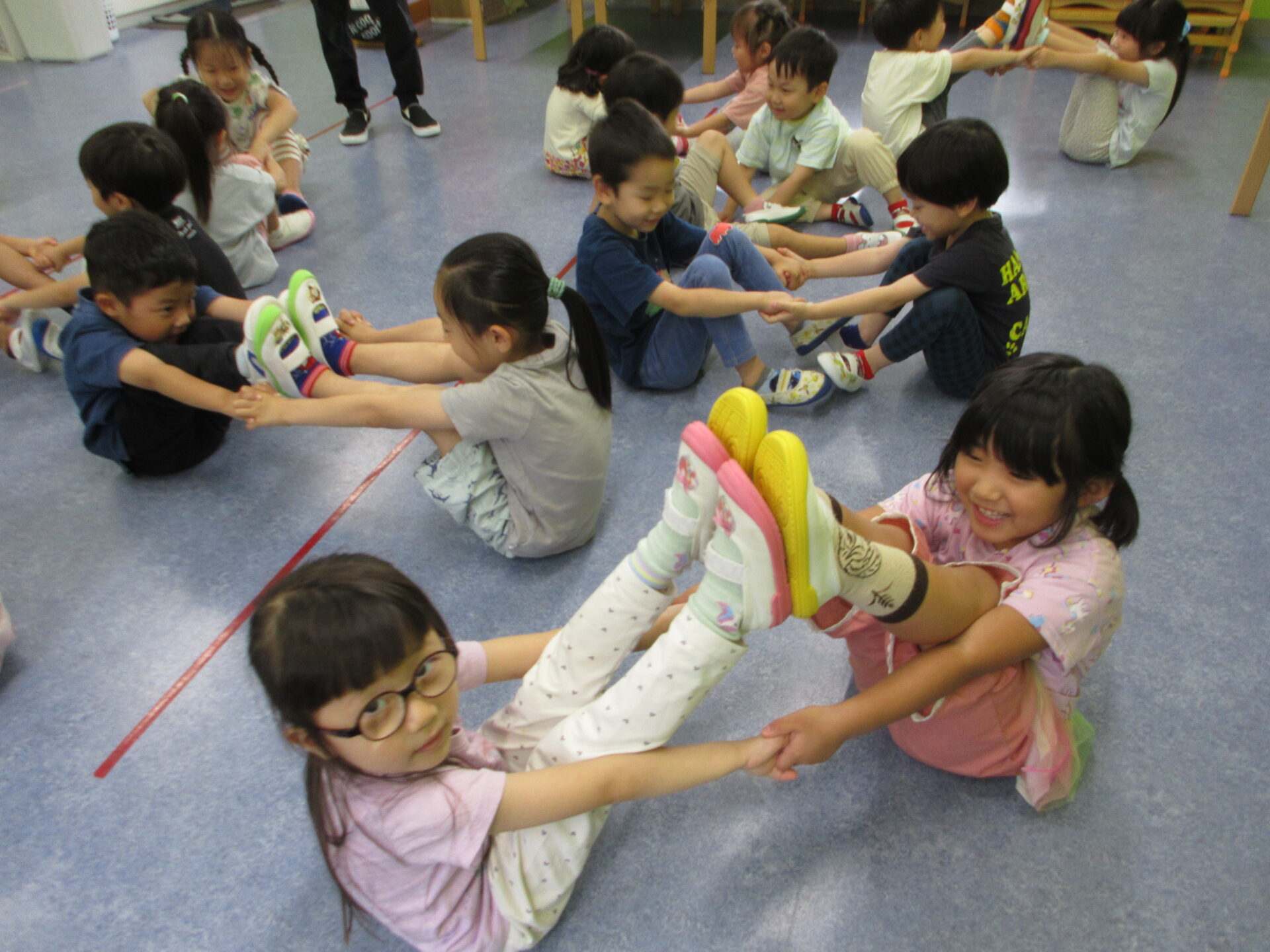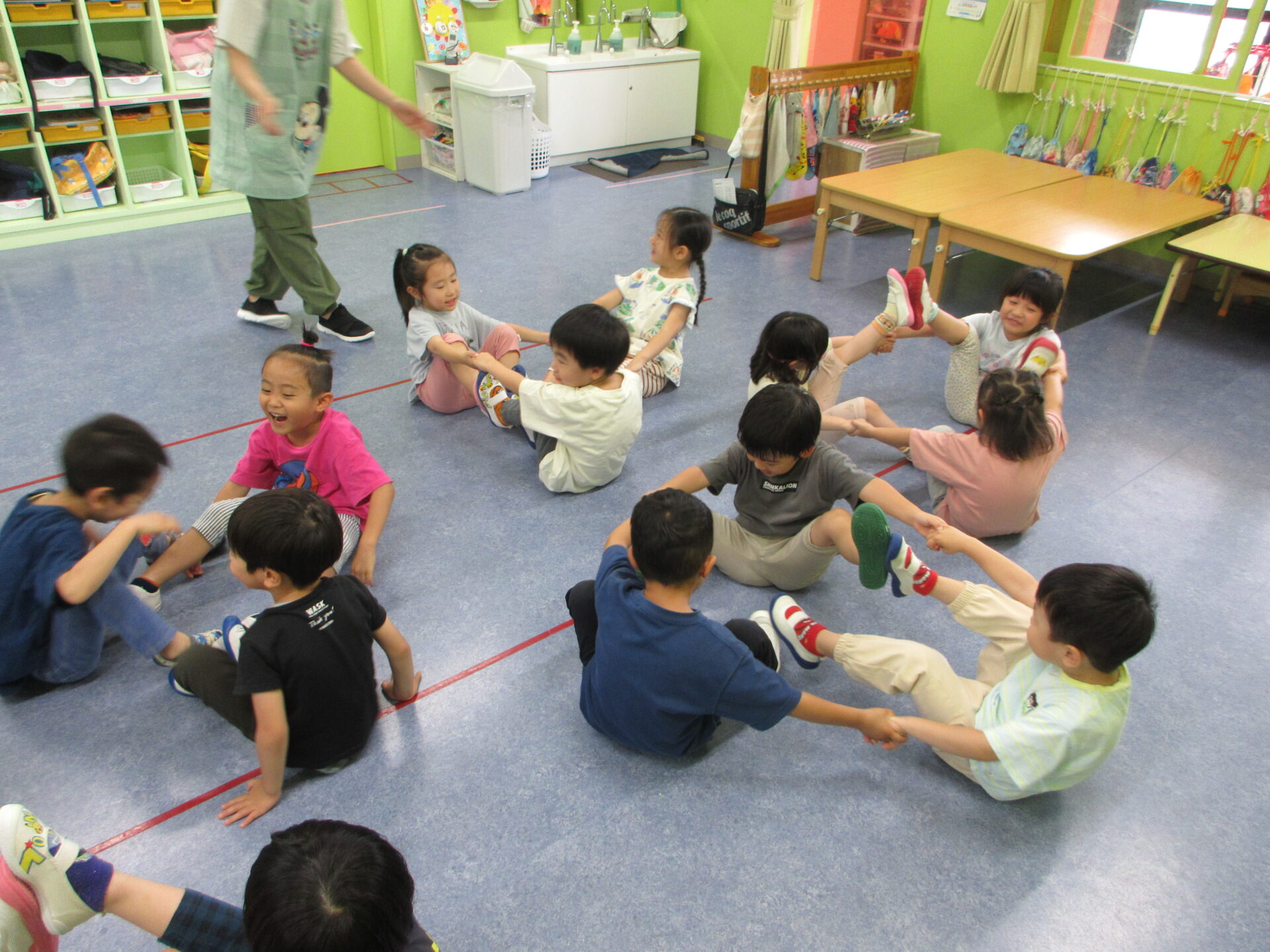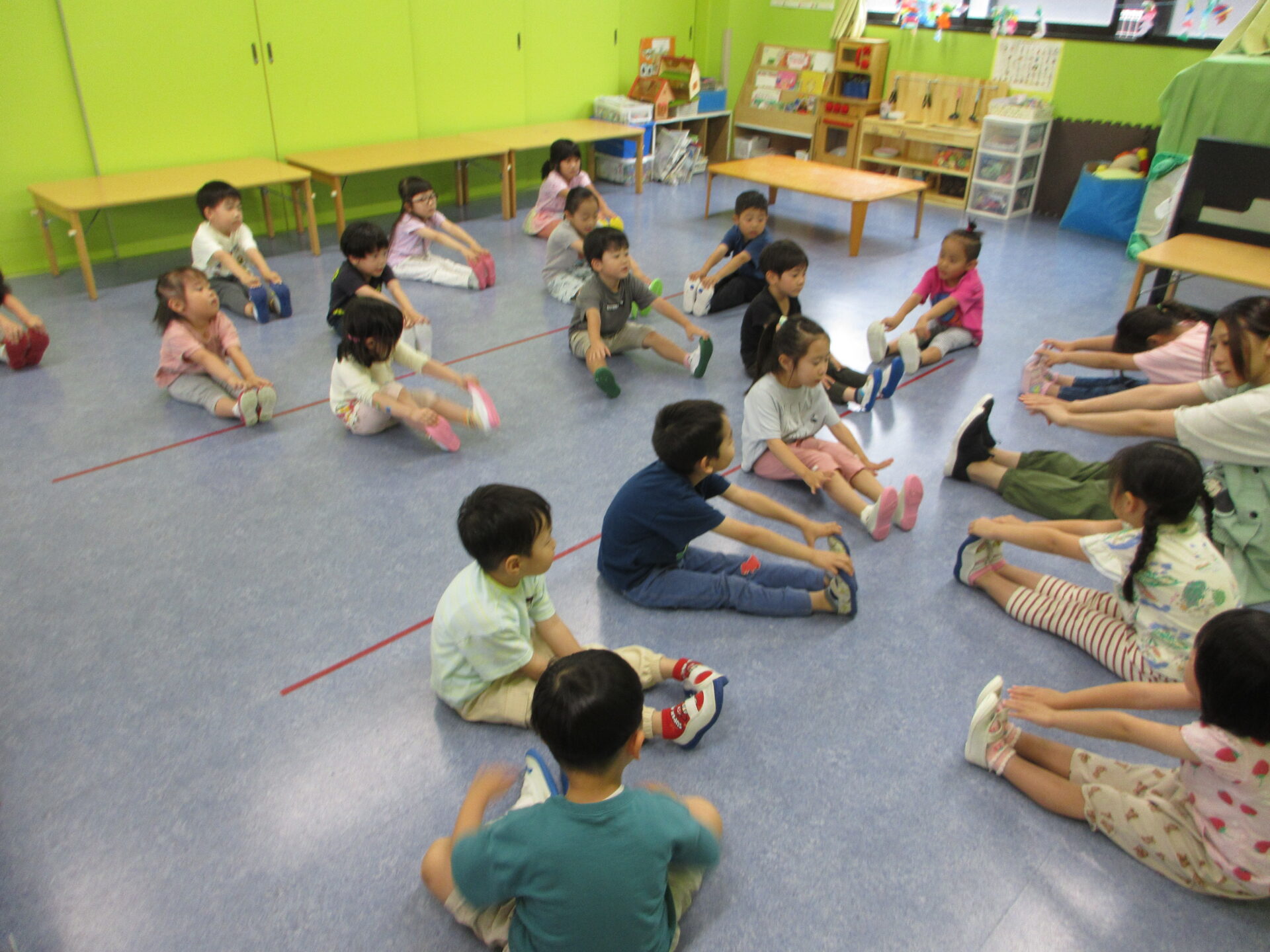 そらチーム(4歳児)では、身体を伸ばしてストレッチが行われていました。
