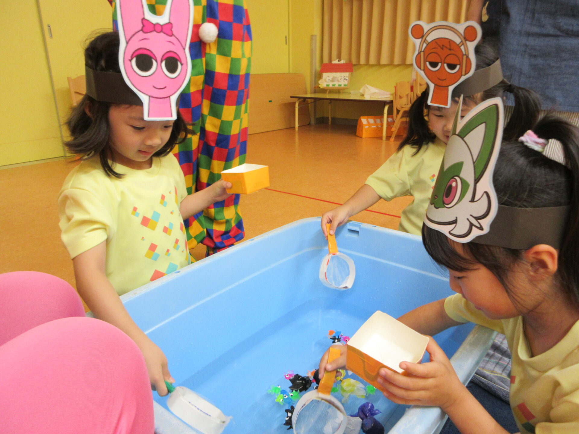 ピンクの金魚ちゃん(保育者)に応援してもらいながら、すくいます🐟