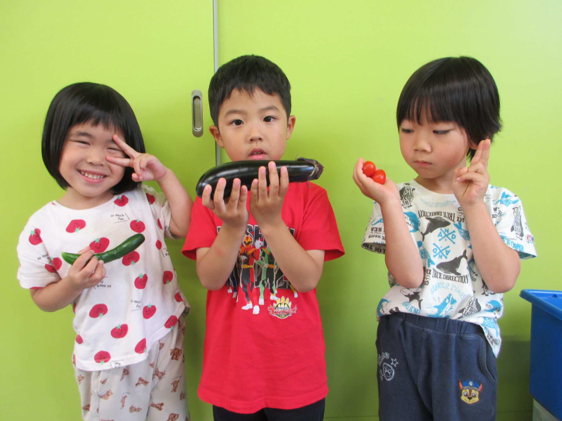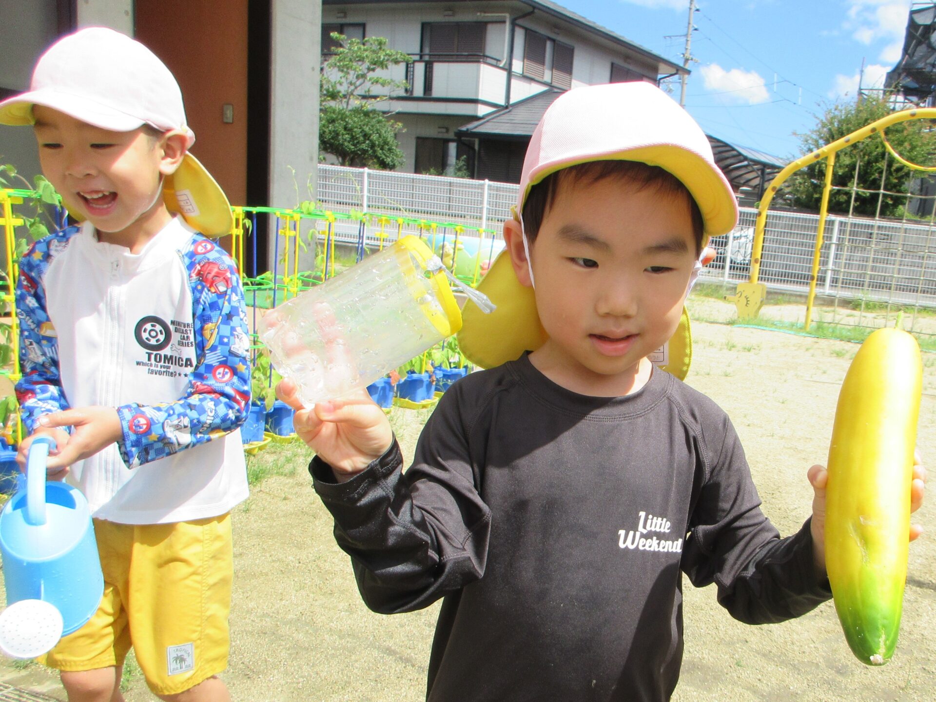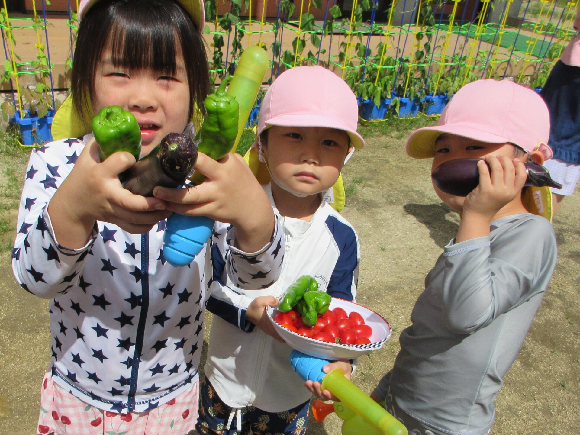 そらチーム(4歳児)のお当番さんも、くじらチーム(5歳児)のお当番さんと協力をして、水をあげて野菜を育てていました😊