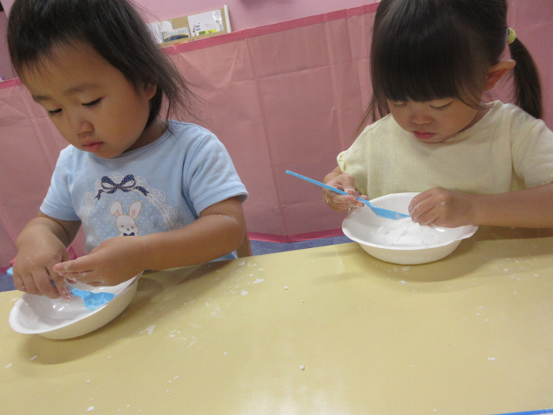 「うわぁ~!とろとろー✨」と目をキラキラとさせ、不思議な感触を楽しんでいました😊