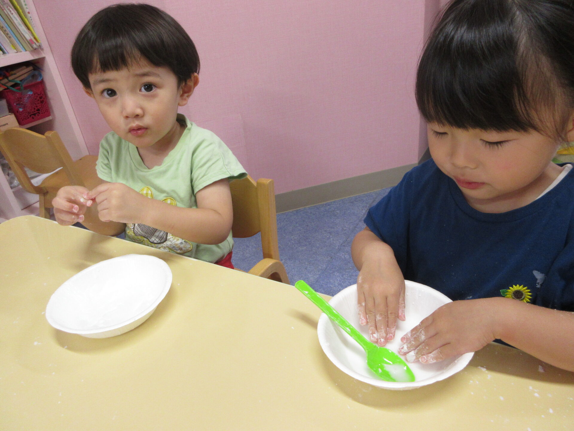 『片栗粉』を使って、感触遊びを楽しむ、あめチーム(2歳児)!