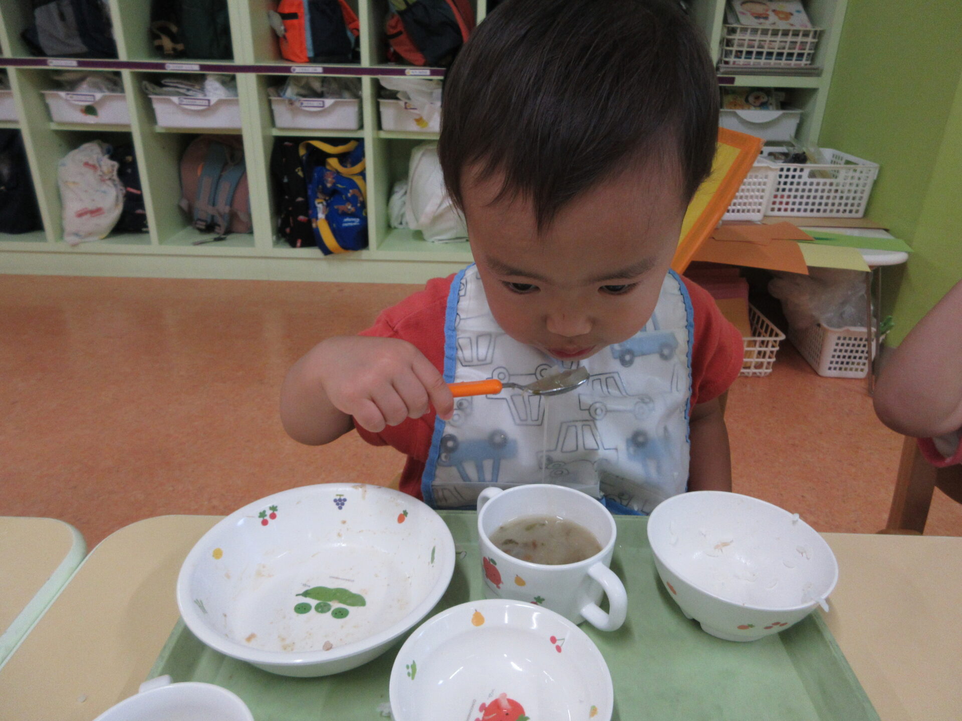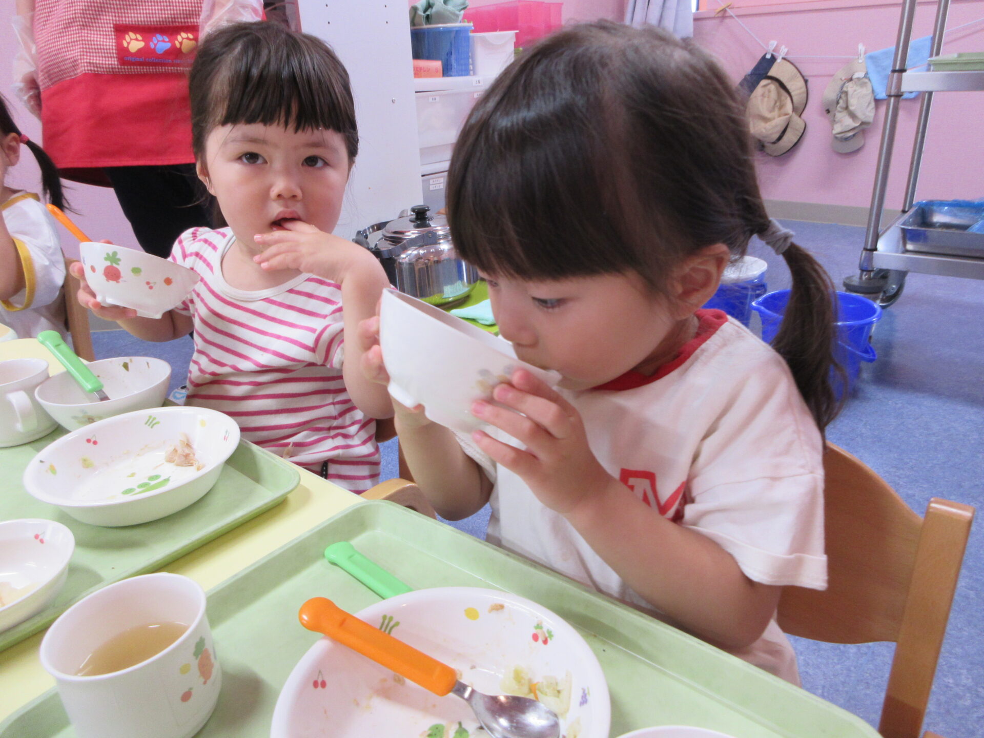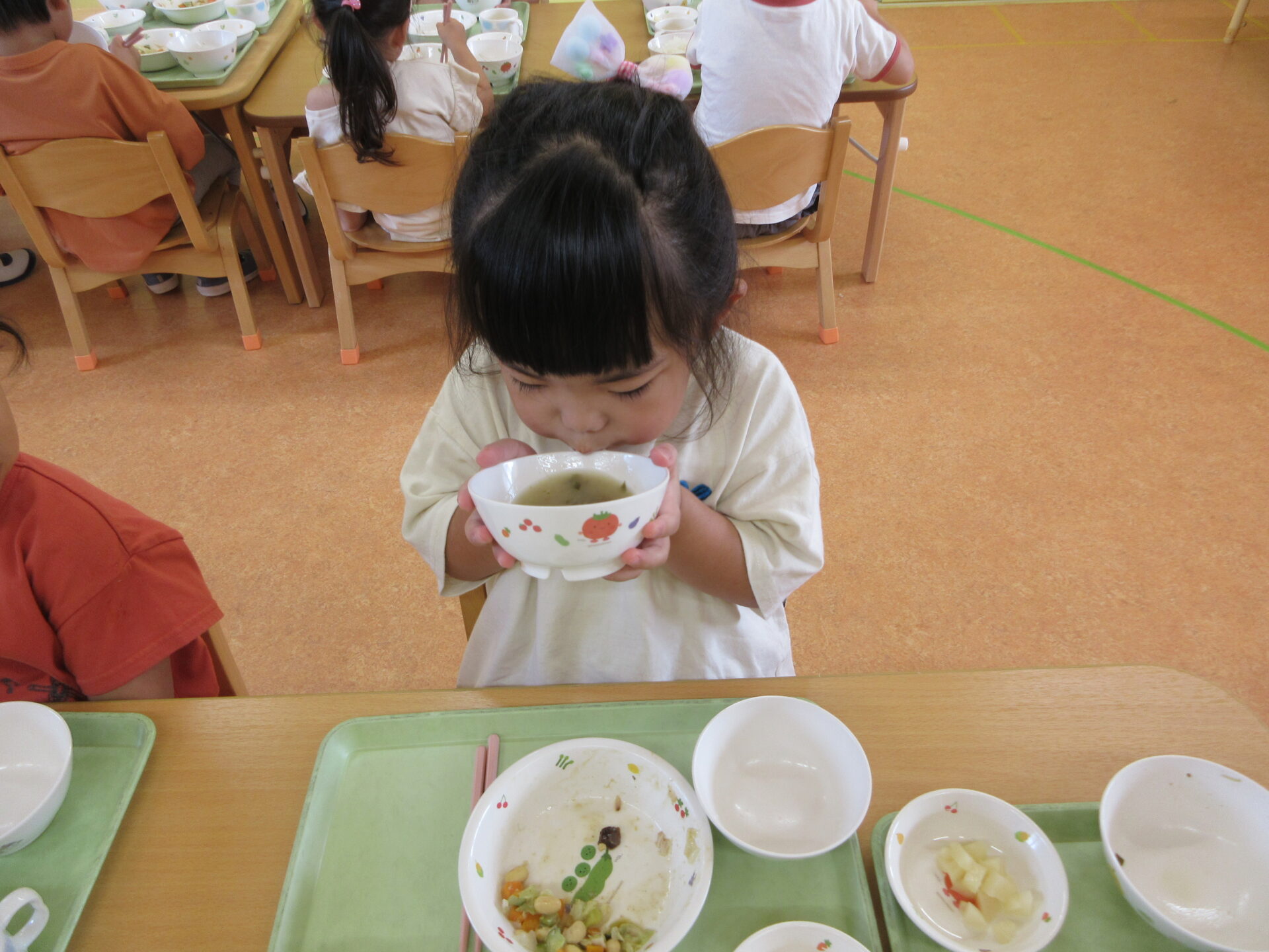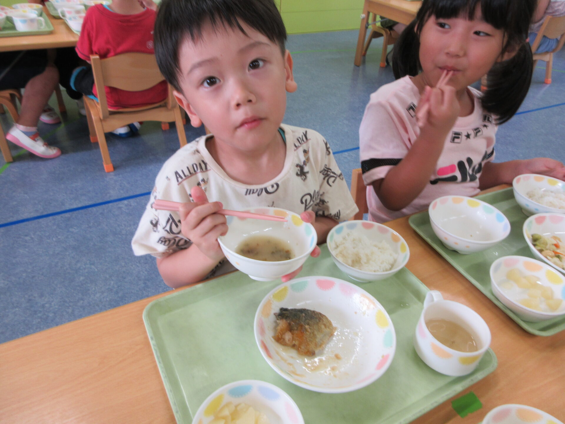くじらチーム(5歳児)は味噌を分けて家庭に持ち帰り、残った分は、こども園の給食で提供してもらいます。早速、9月3日の給食で食べてもらいました。