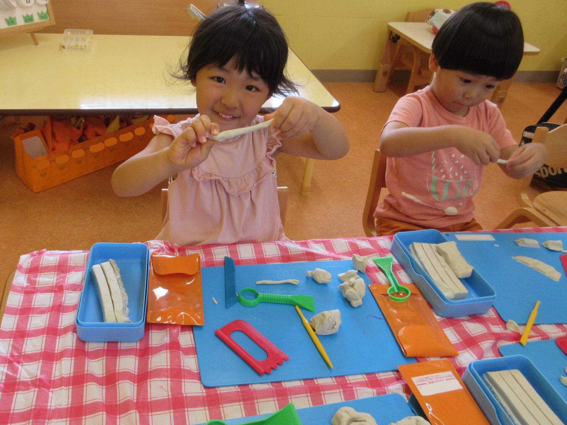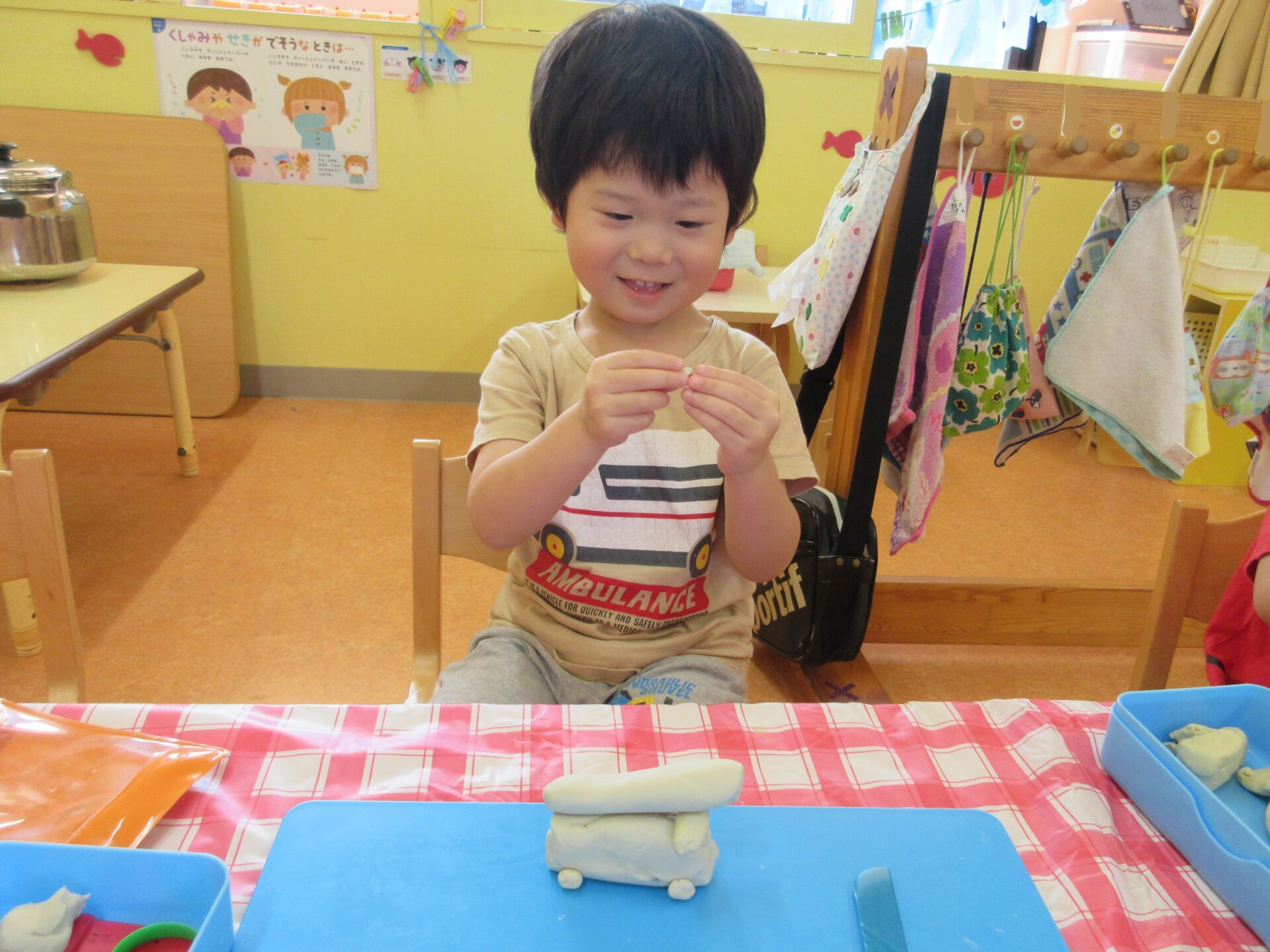 室内で「粘土遊び」を楽しむ、にじチーム(3歳児)!
