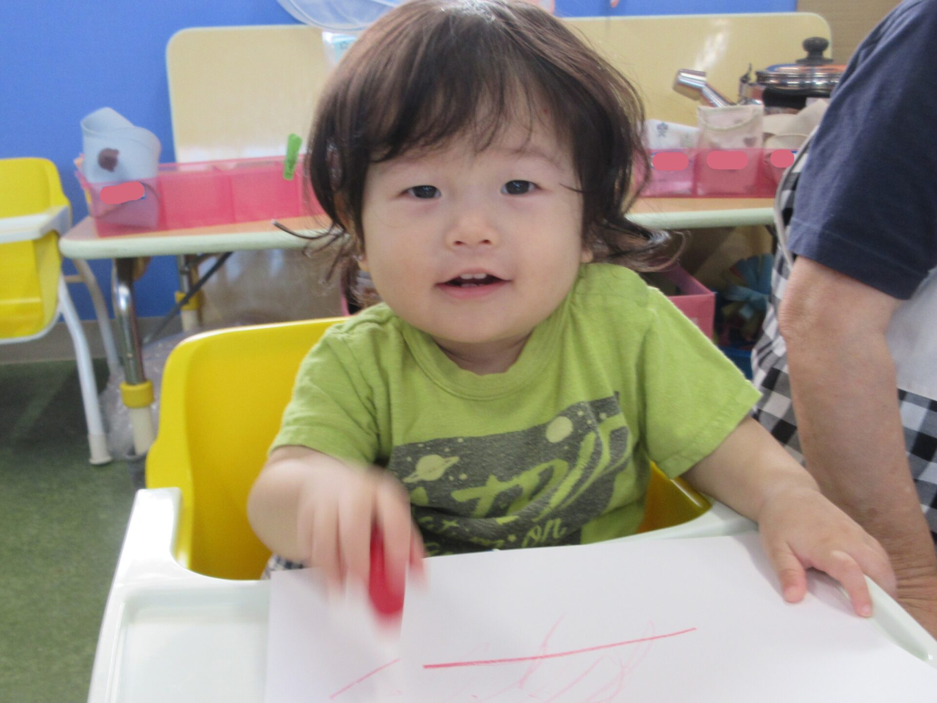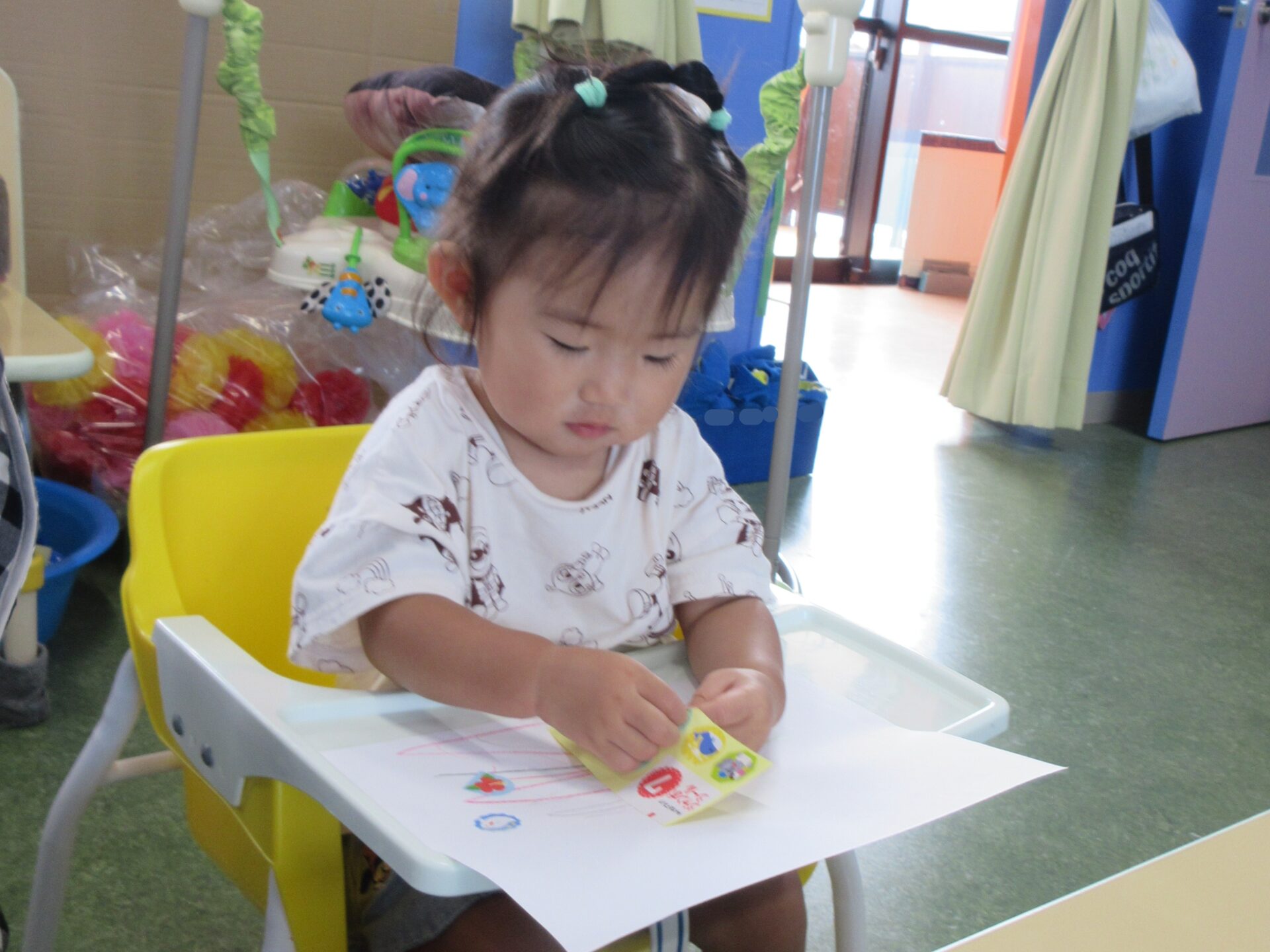 室内でお絵描きやシール貼りを楽しむ、うみチーム(0歳児)😊