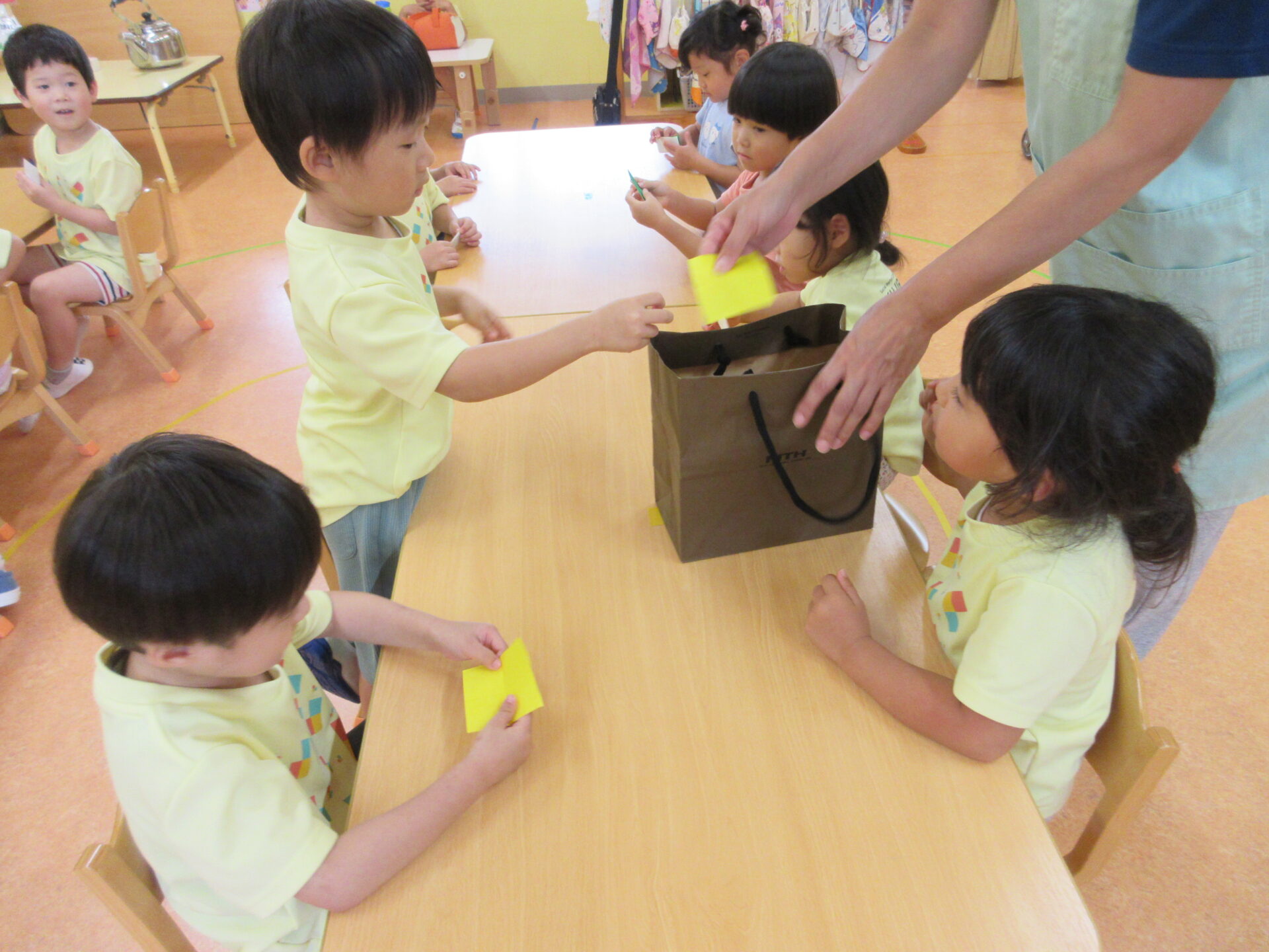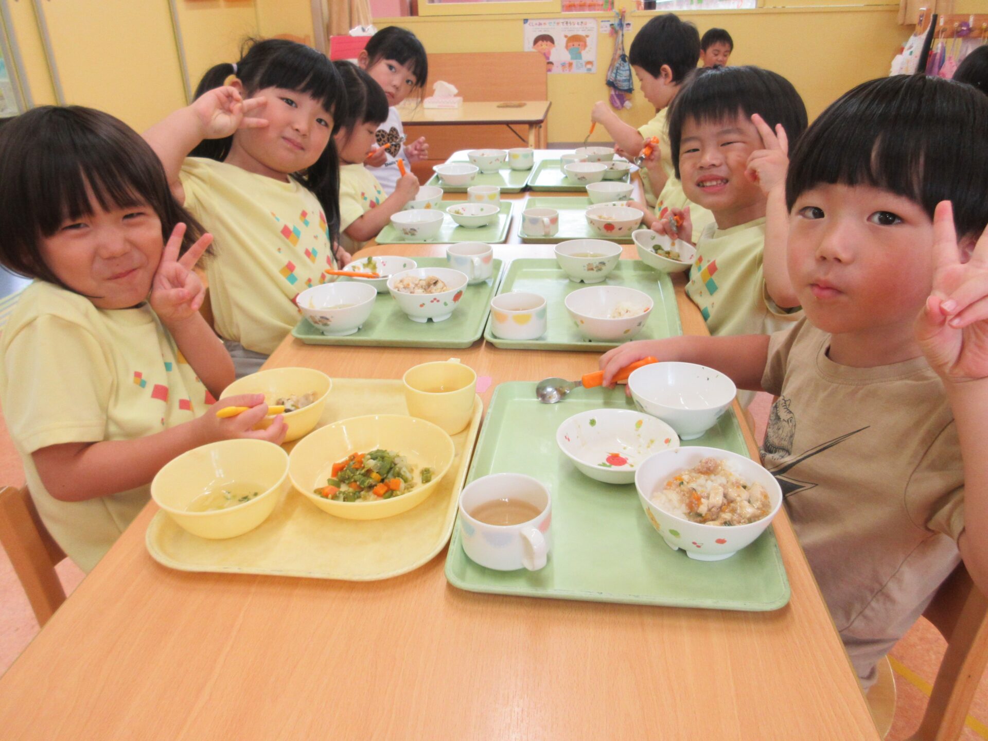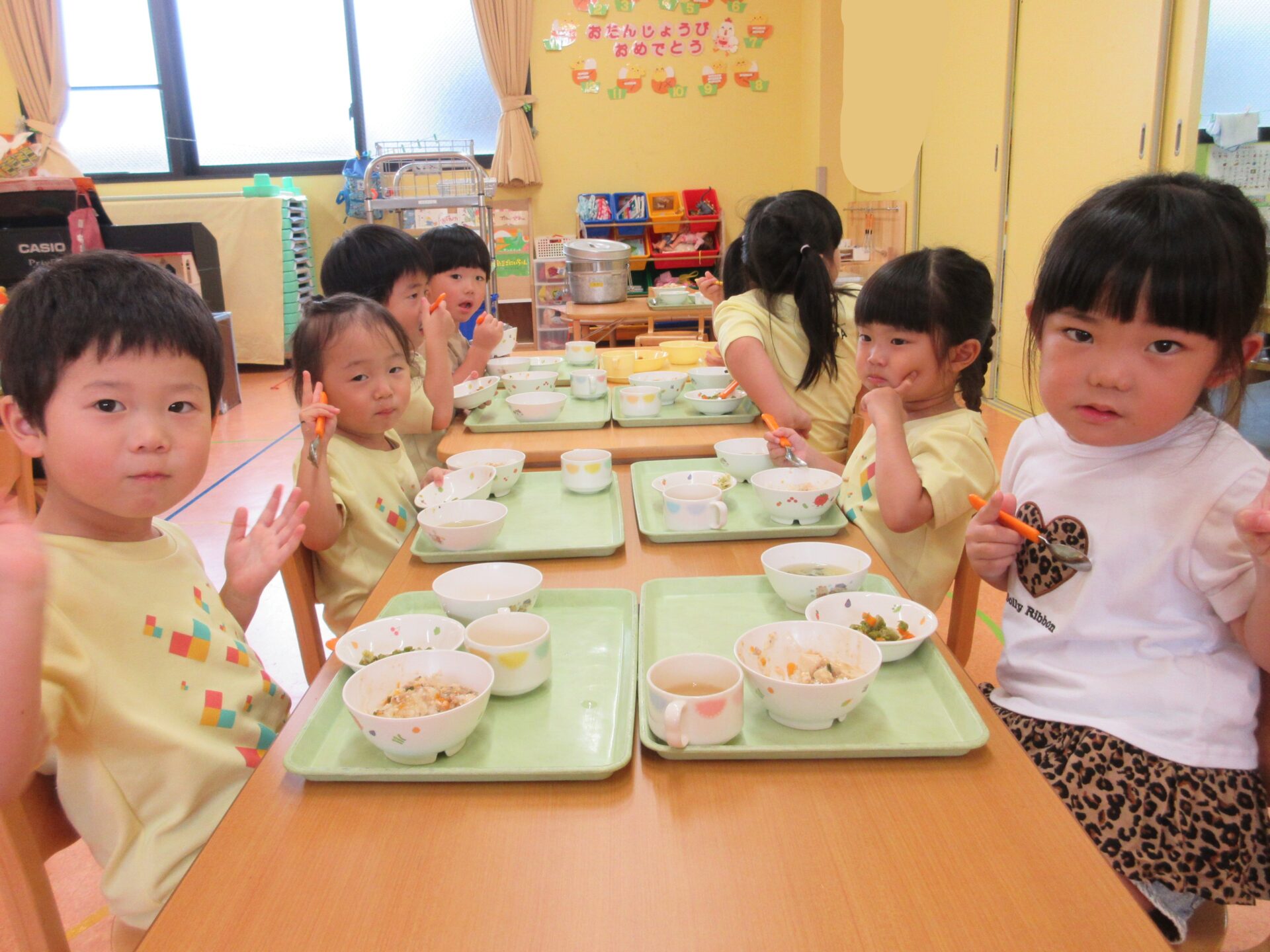 2025.10.10 ブログ ドキドキ💓(3歳児) 今日の、にじチーム(3歳児)は『いつもと違うお友だちとも給食を食べてみよう!』と、くじ引きで座るところを決めました😊 ドキドキしながらくじ引きを引いて… 出た色の机へ! 記念にパシャリっ📸 一覧へ戻る