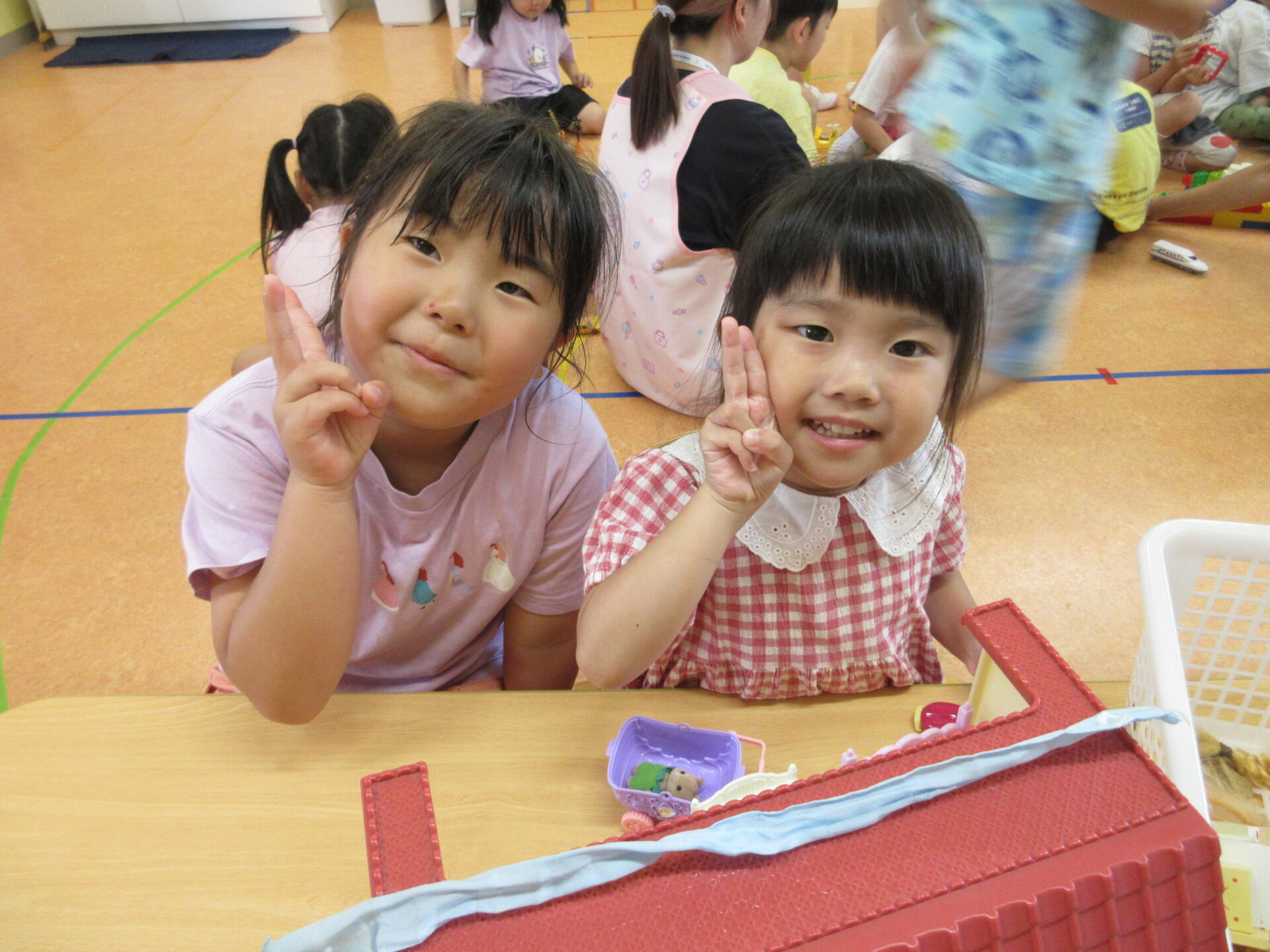 にじチーム(3歳児)のお友だちと一緒に好きな玩具で遊ぶ姿やくじらチーム(5歳児)が優しく接する姿など見られ、とても微笑ましい様子でした💗