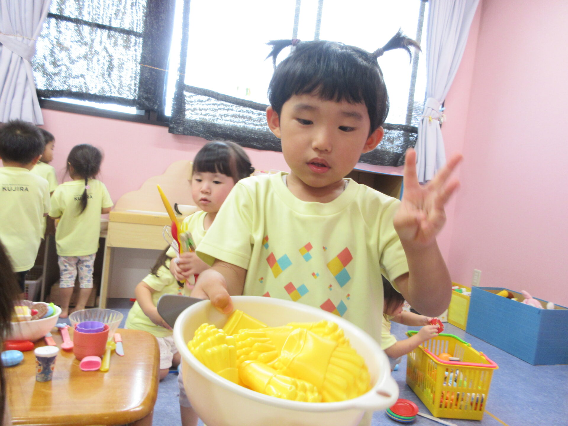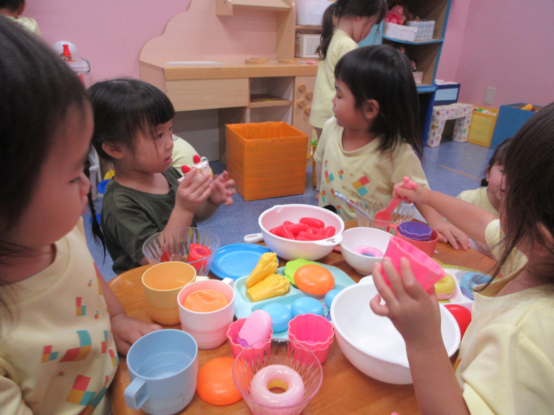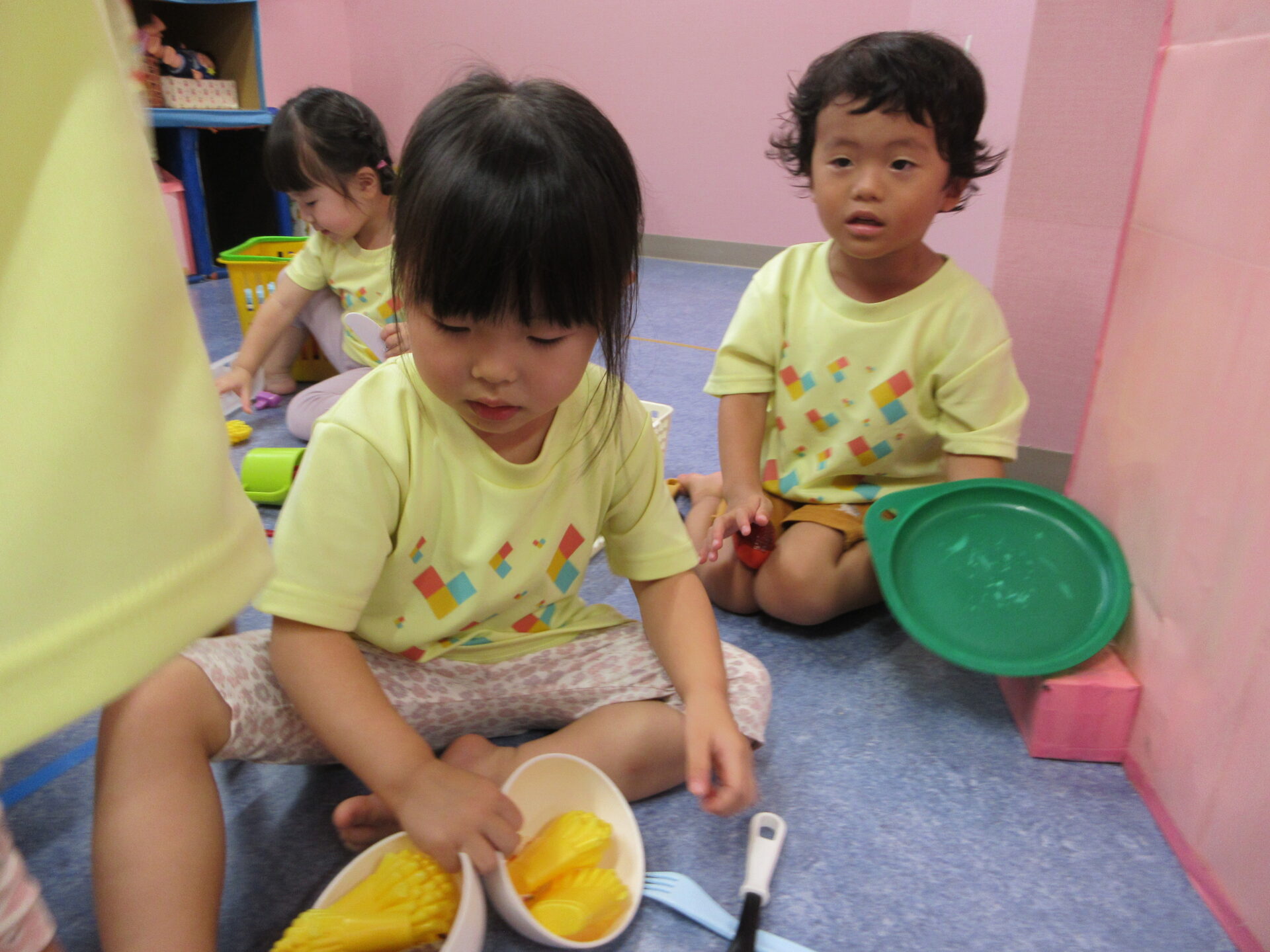 室内で『おままごと』を楽しむ、あめチーム(2歳児)さん😊