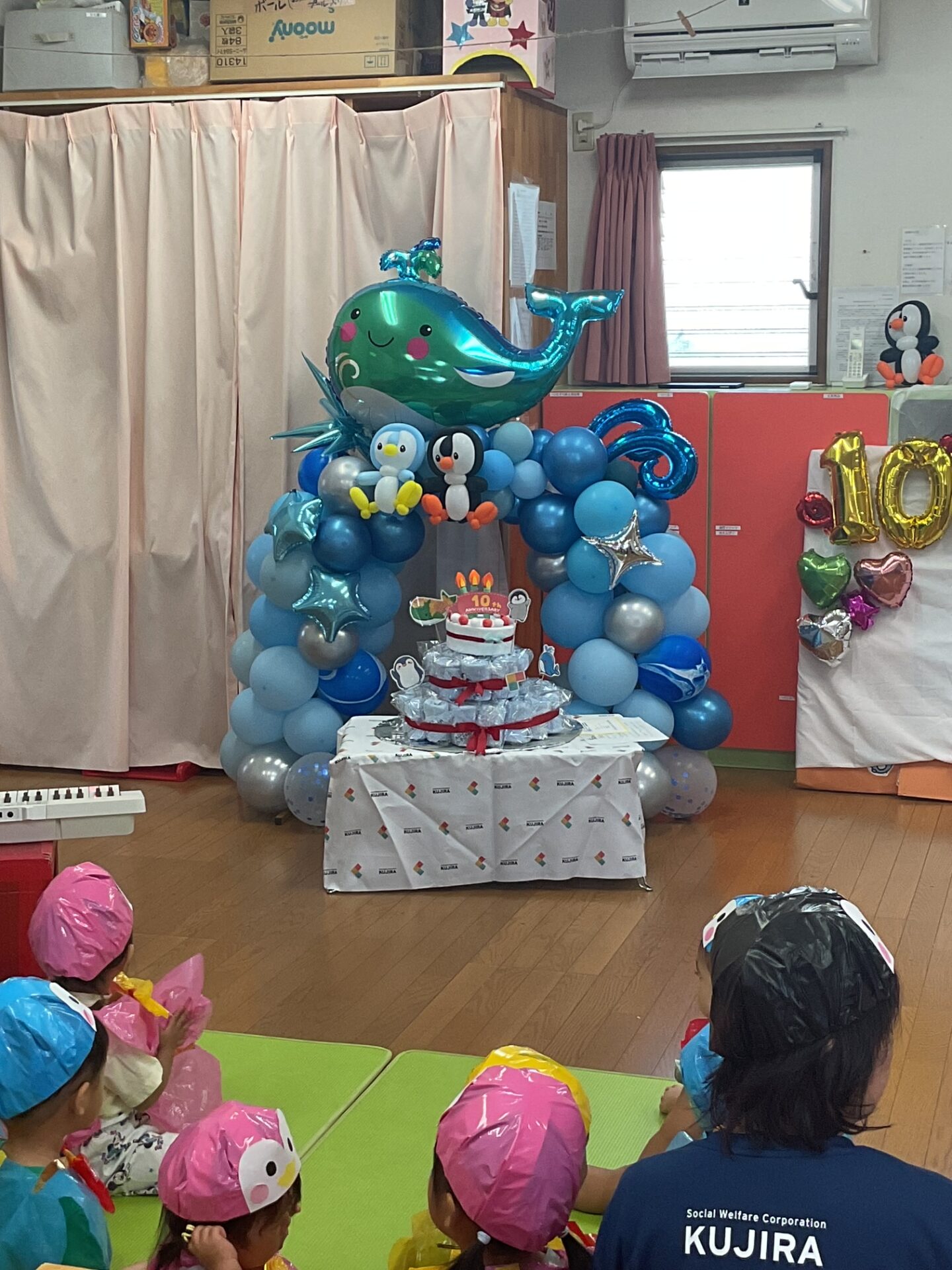 バルーンのくじらとタオルケーキが飾られ、伊予市内にある姉妹園、施設からもお祝いの品が届けられました🎂