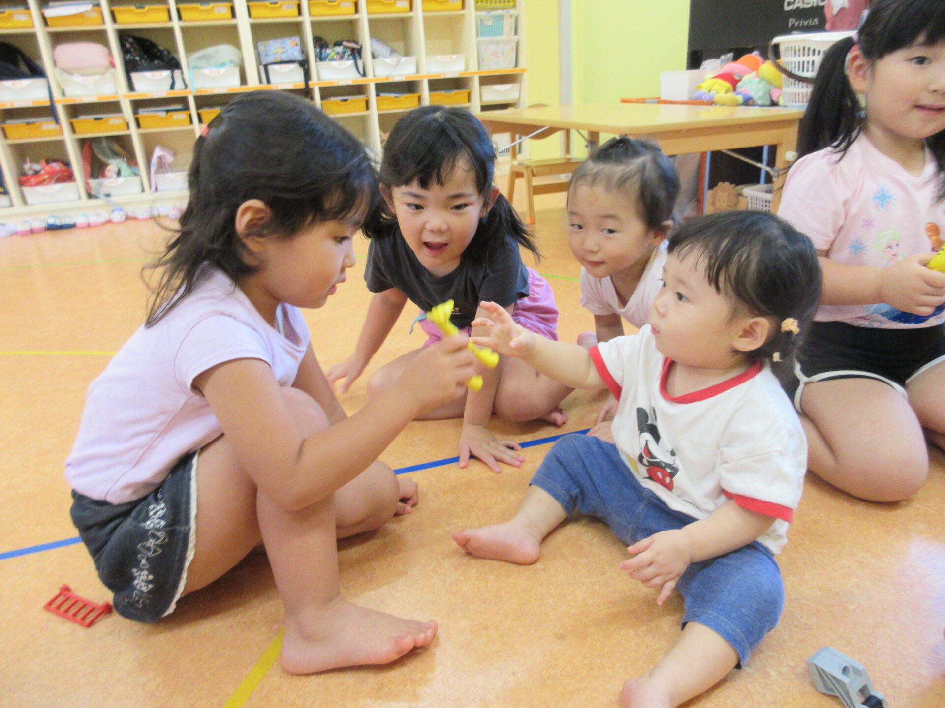 自分より小さいお友達に興味津々で、ぐいぐい近づいていく、にじチーム(3歳児)。