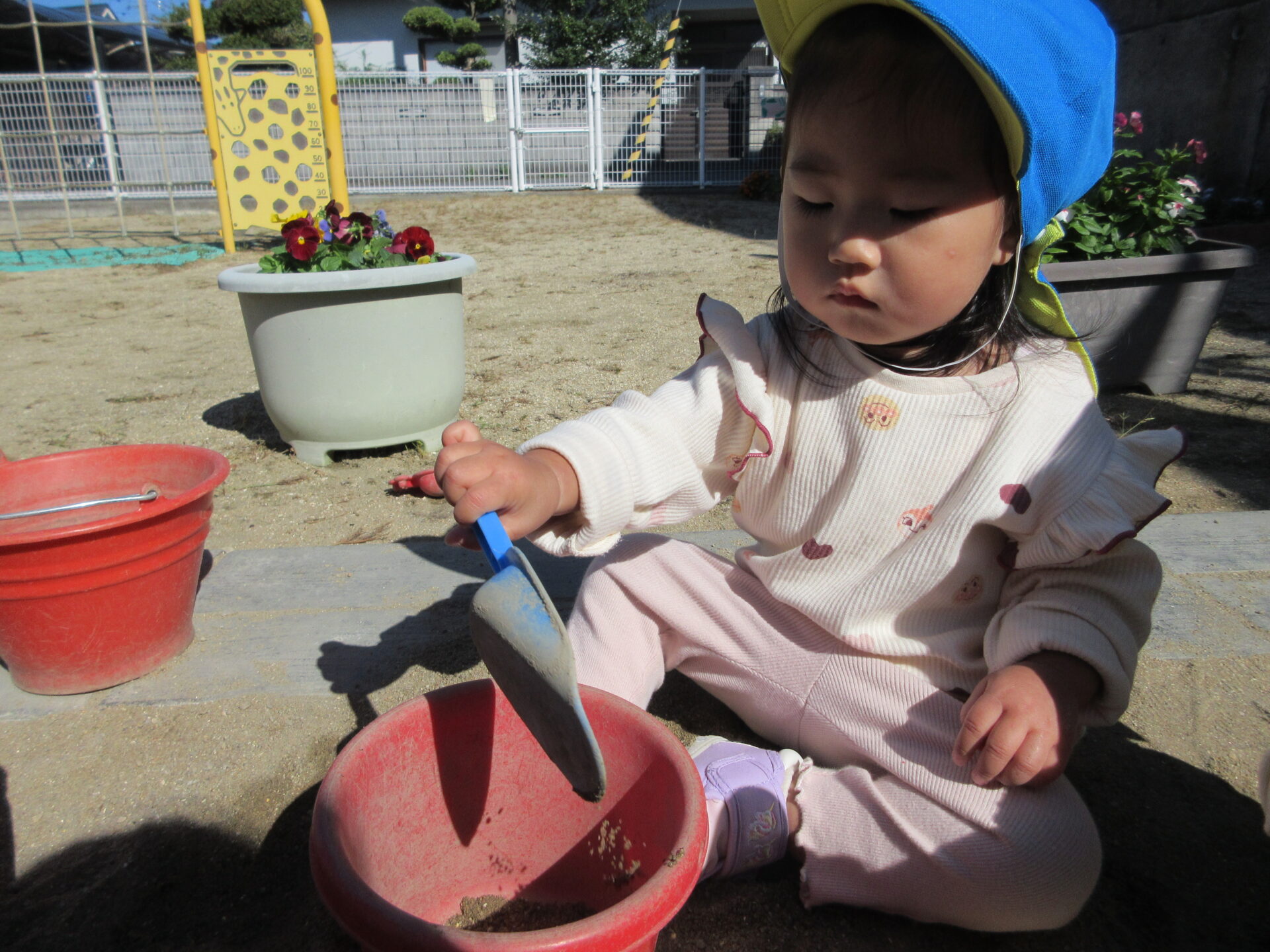 砂場で砂遊びをしたり、園庭を散策したり…