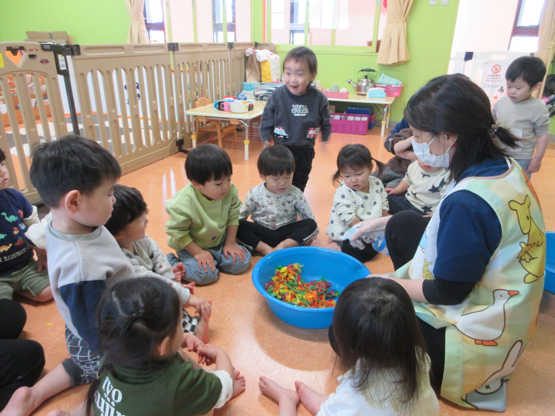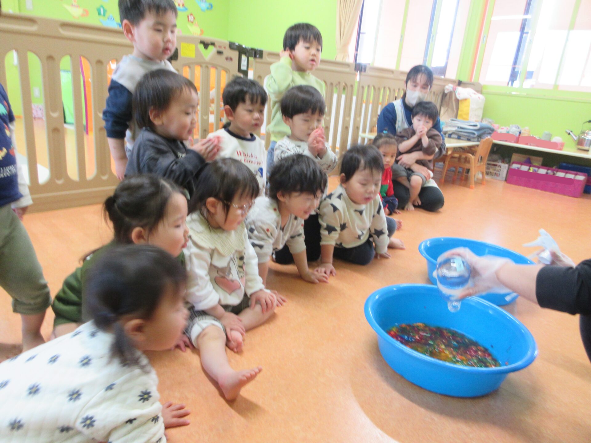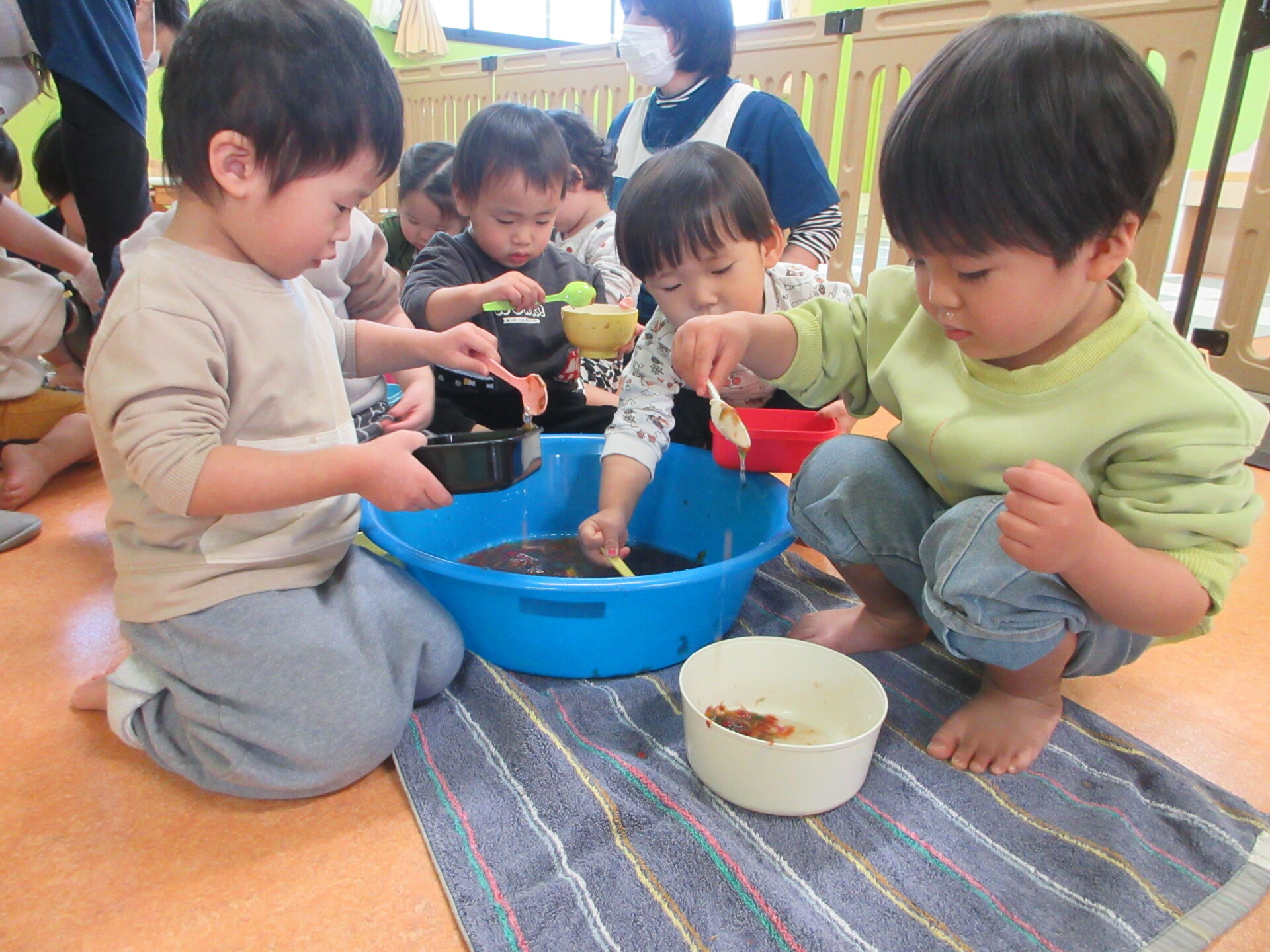 タライを囲んで集まる、だいちチーム(1歳児)!