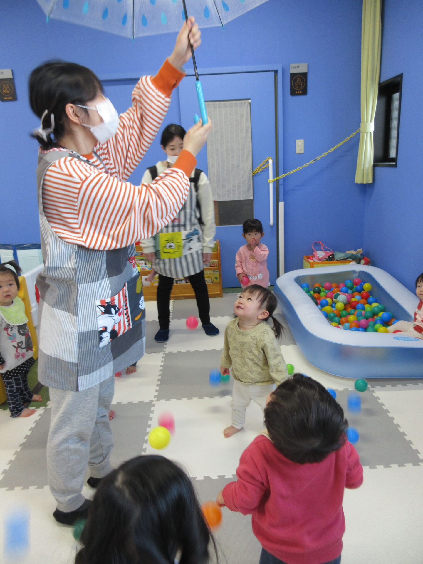 保育者が傘を反対にし、カゴのように👀