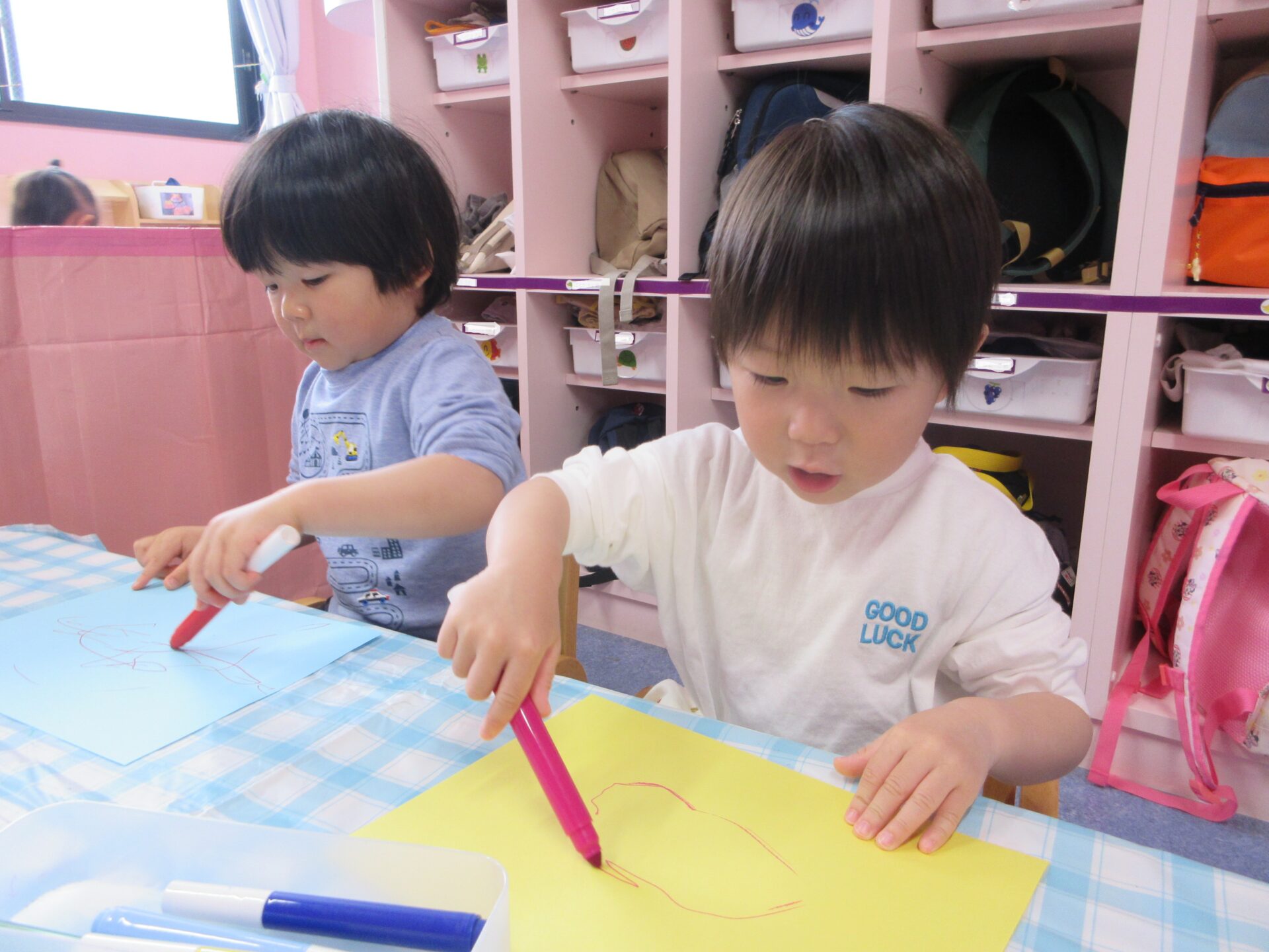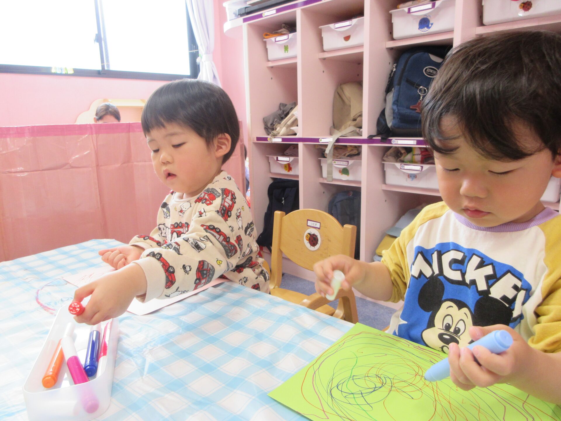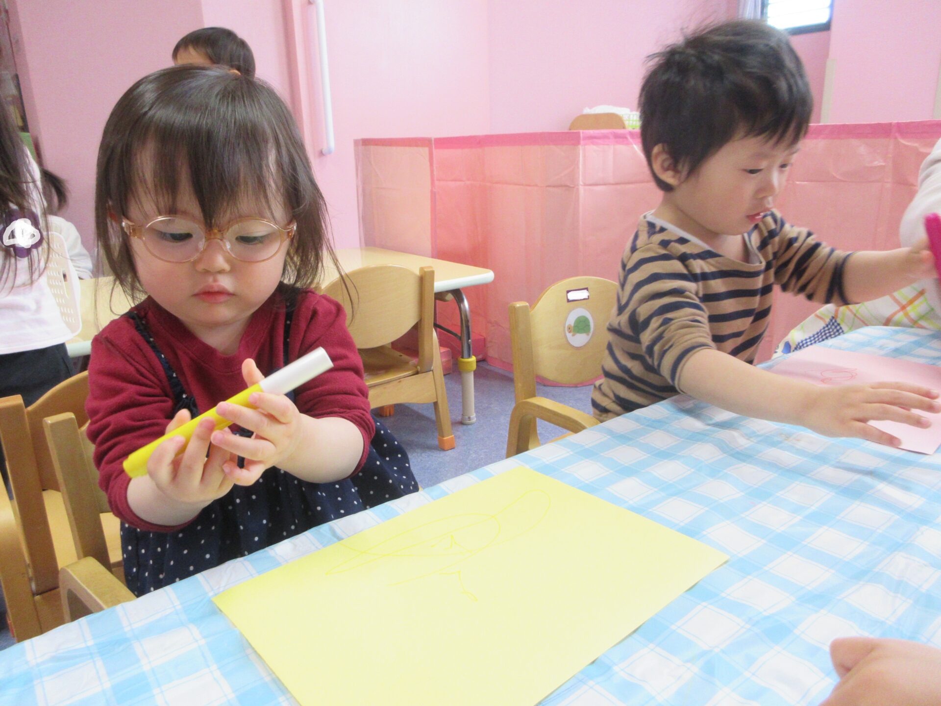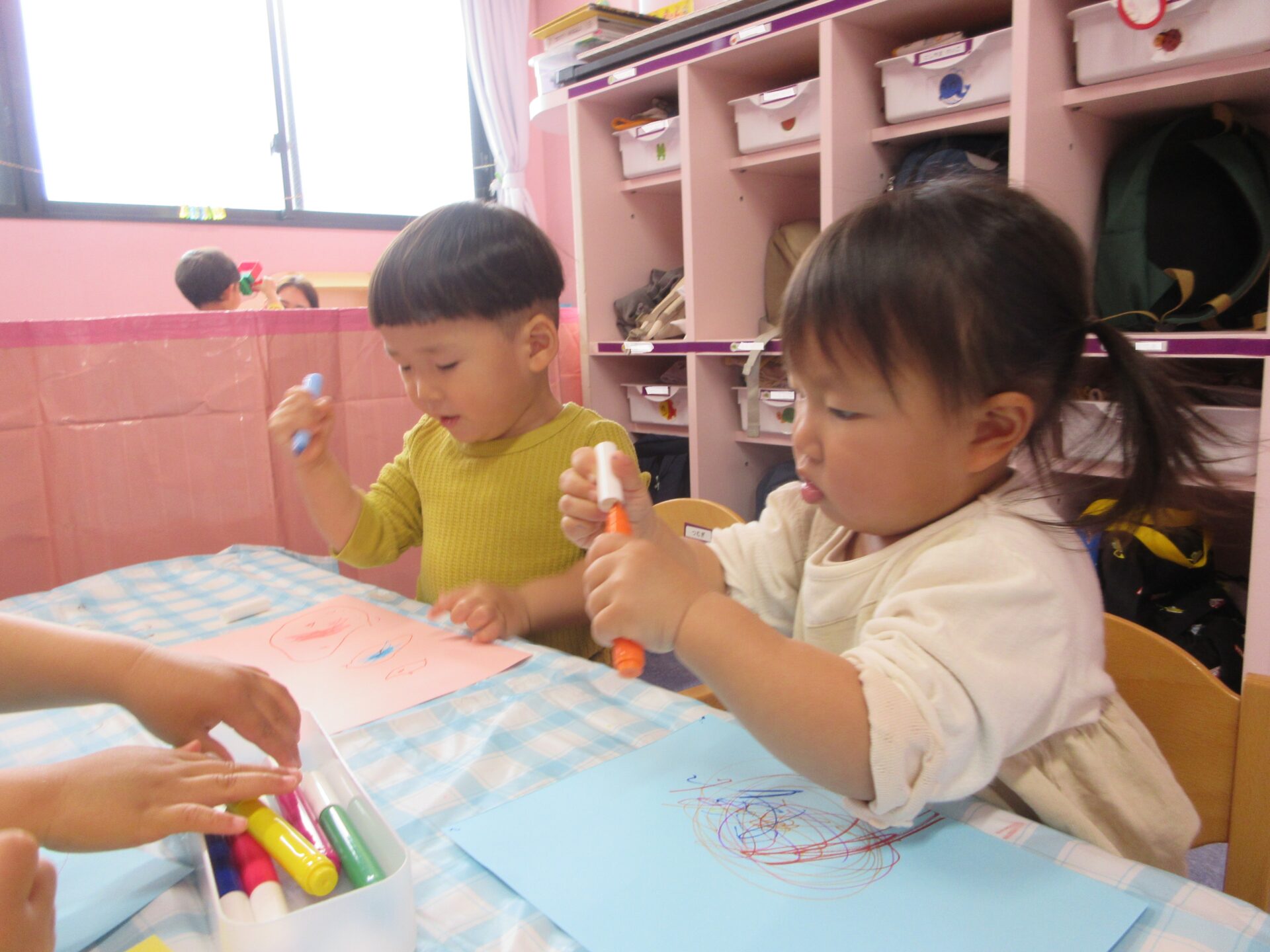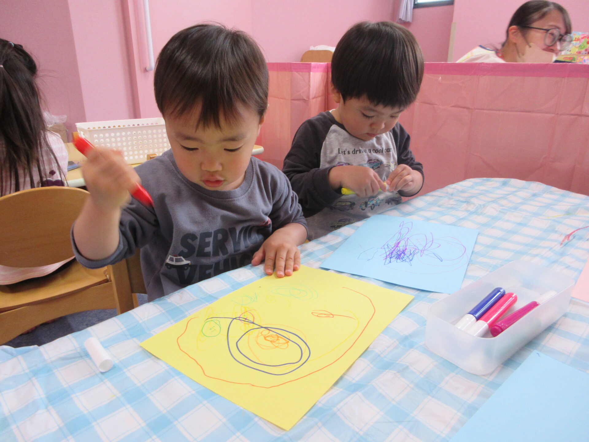 腕を大きく動かしながらのびのびとお絵描きを楽しむ姿が見られました。