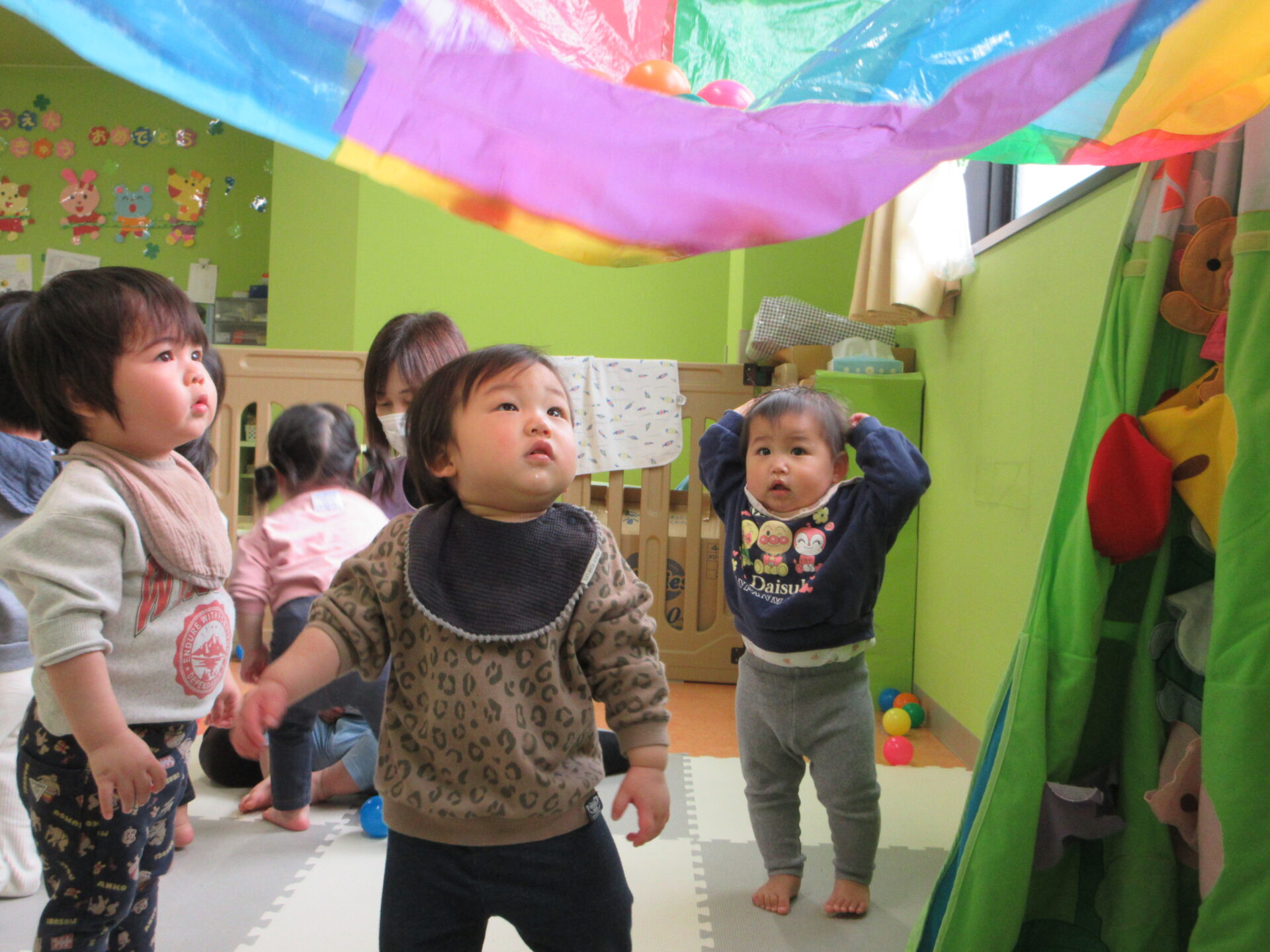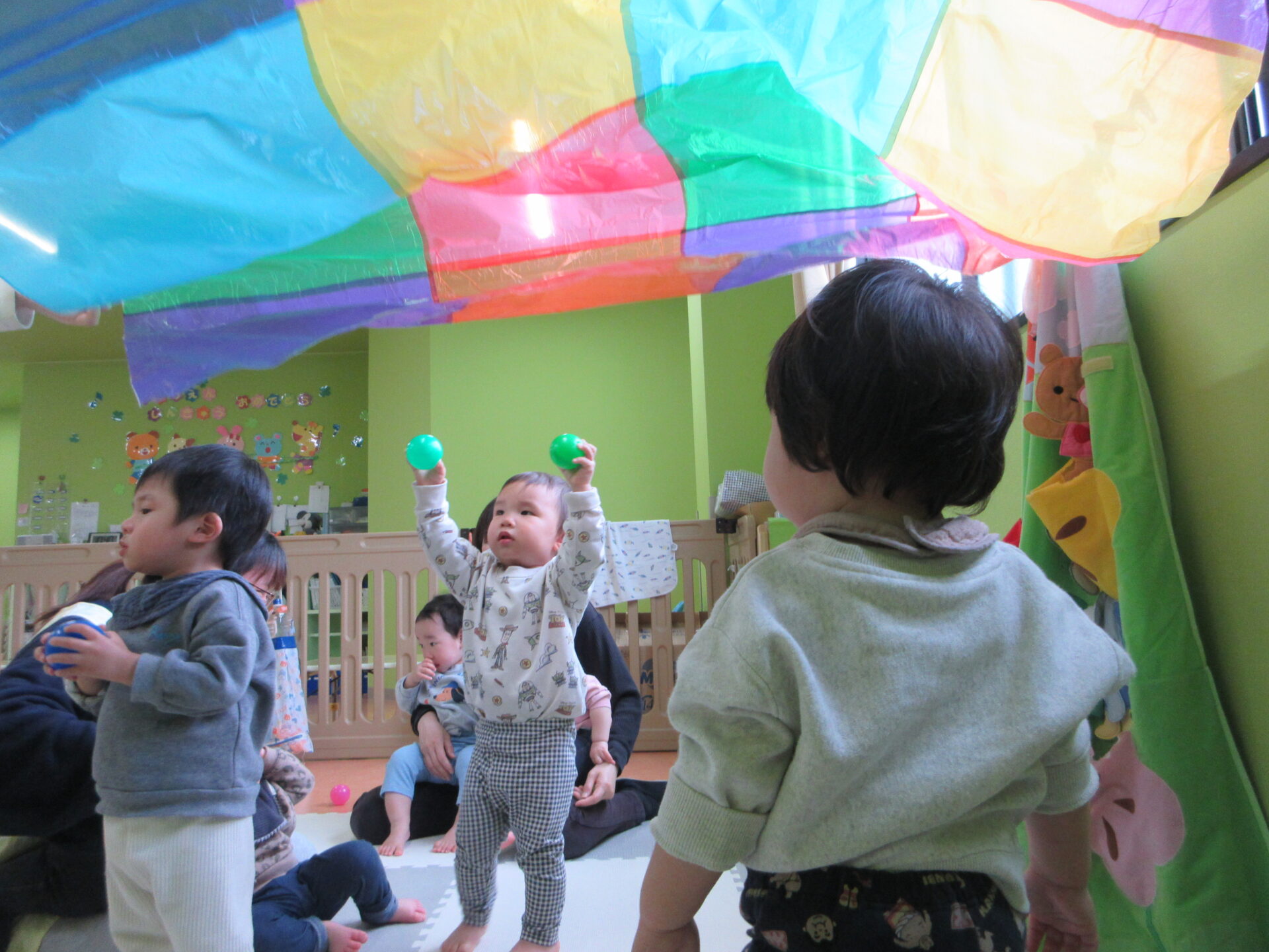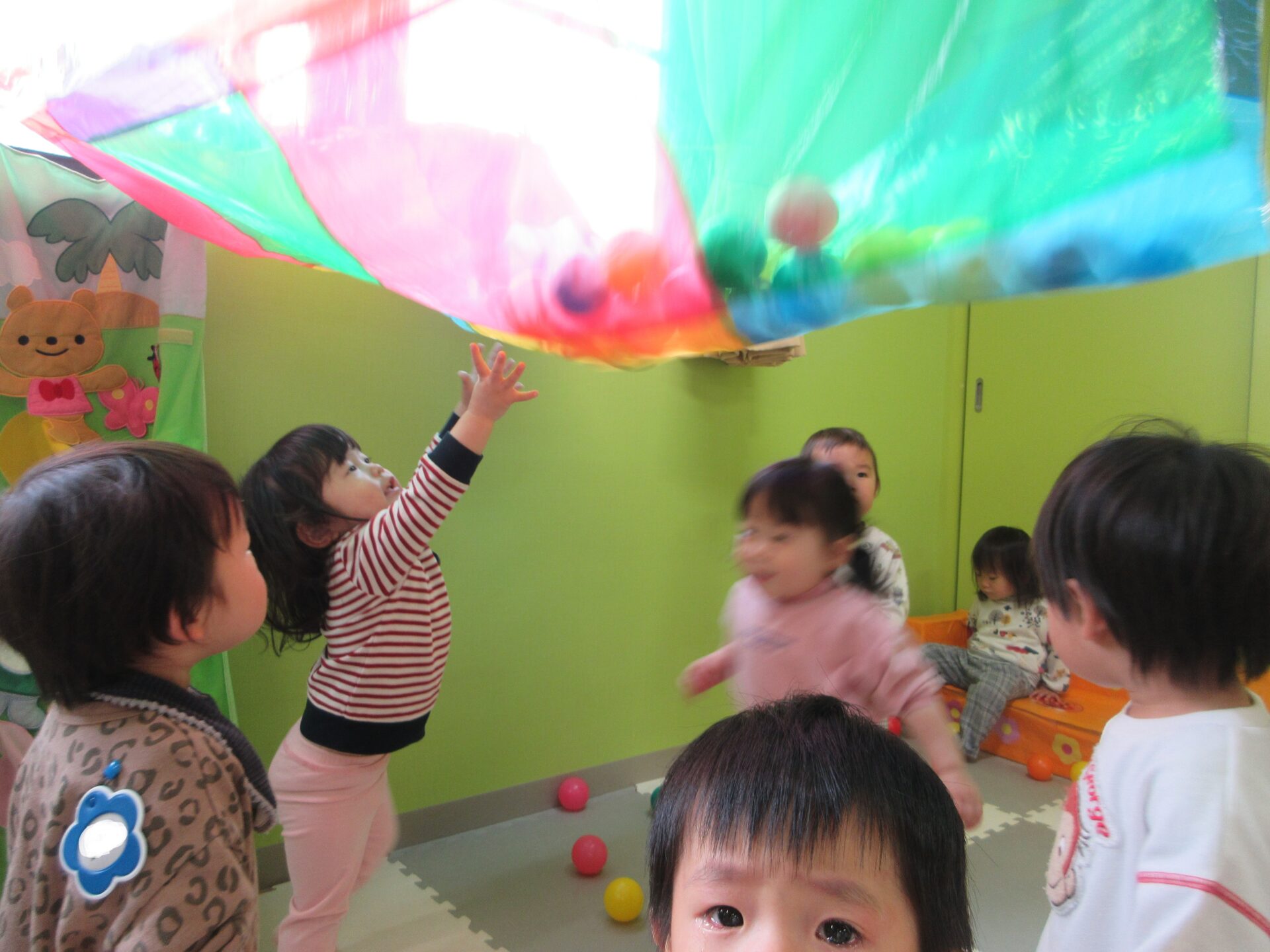 この日は、カラーポリバルーンを楽しみました。フワッと揺れる動きに「わあ~」と大喜びのこどもたち。さらにカラーボールを乗せると、転がったり、跳ねたりするボールを目で追いながら手を伸ばして楽しむ姿が見られました。