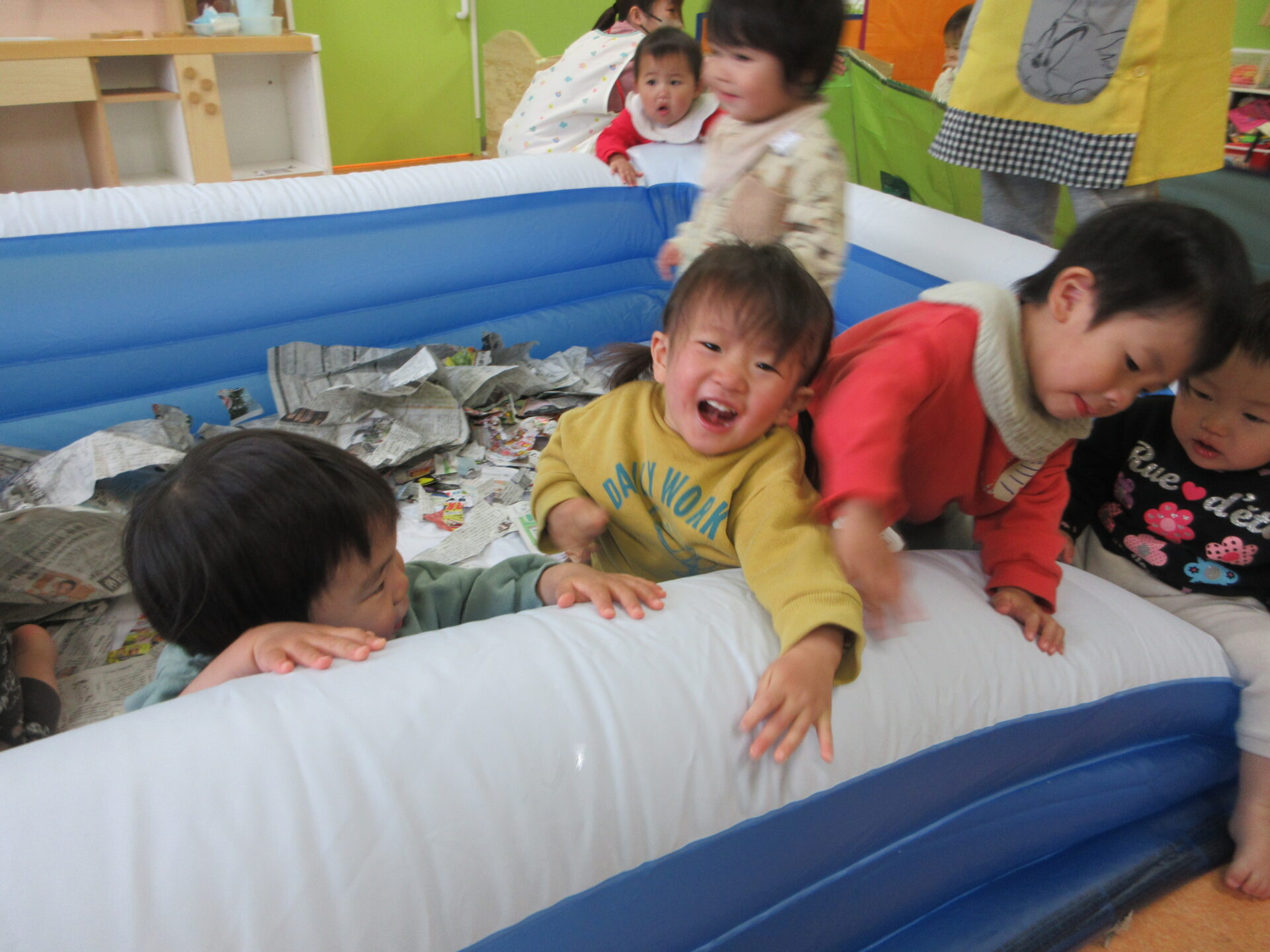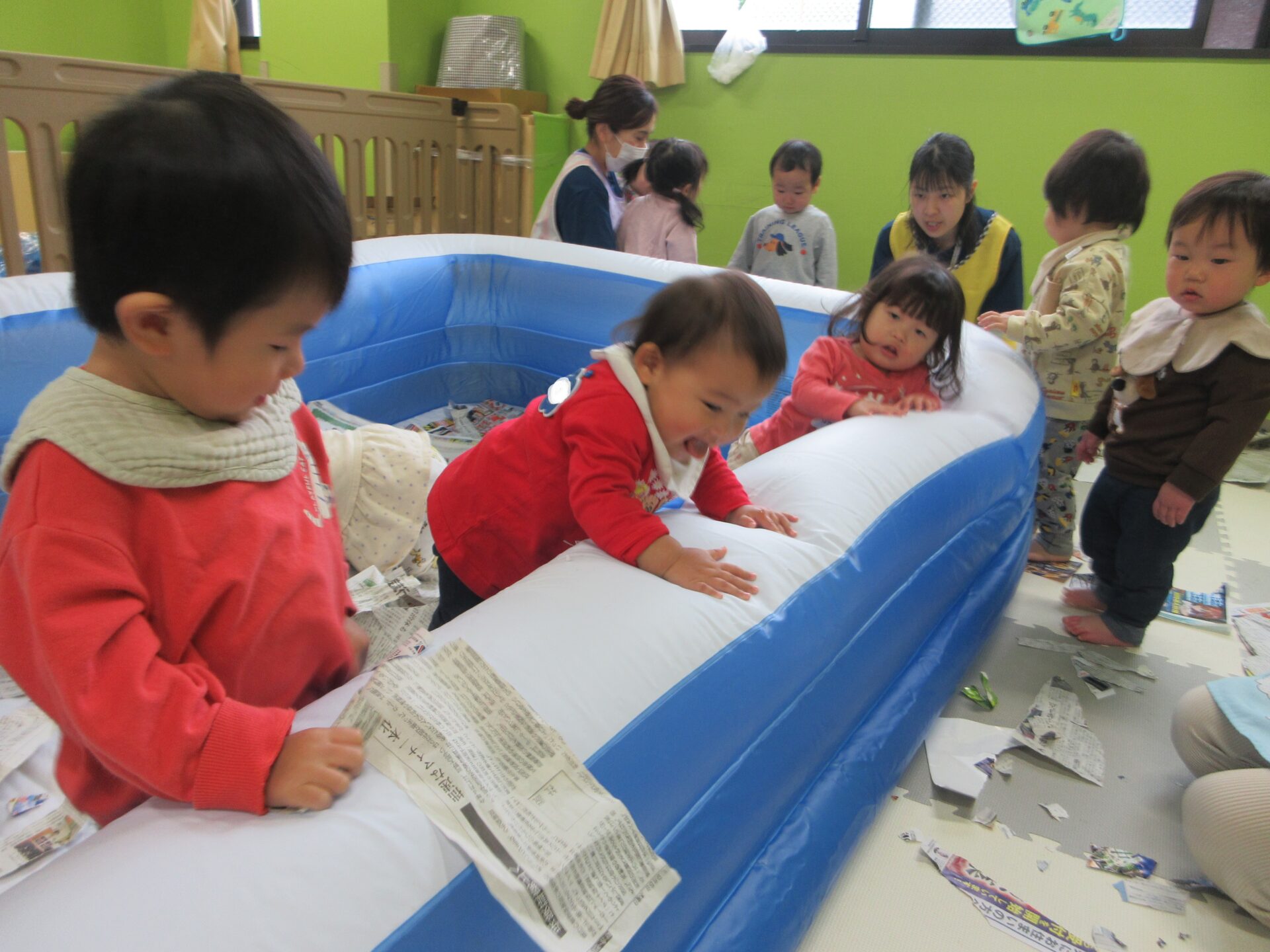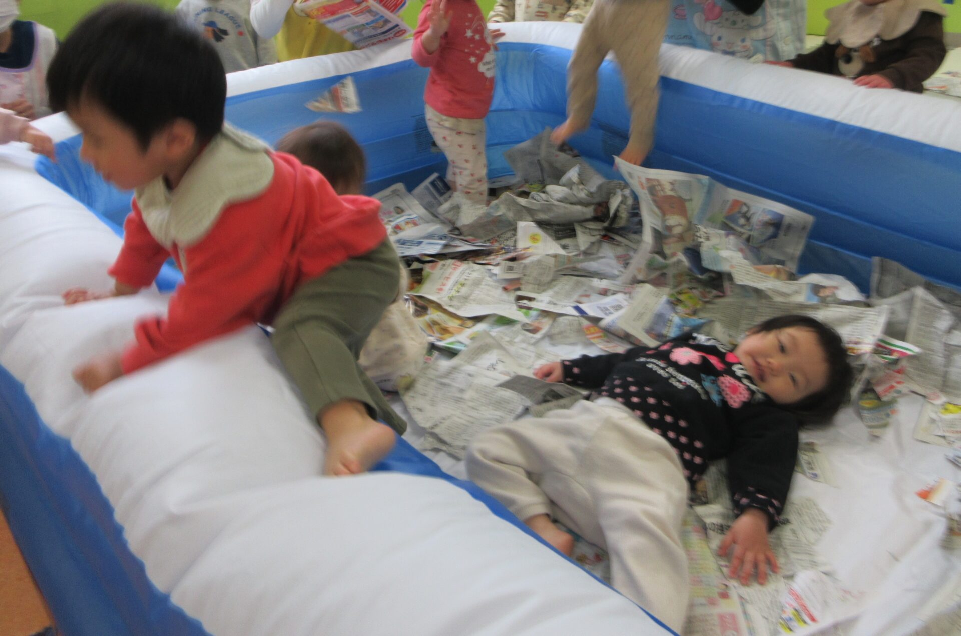 新聞遊びではビリビリと破る感触を楽しんだり、保育教諭と一緒に丸めることを楽しんだりしながら、夢中になって遊んでいました。遊びが広がり、大きなビニールプールを出すと、中に入って新聞紙の感触を全身で味わいながら、伸び伸びと遊んでいました。また、プールのふちにまたがり、ボヨンボヨンと揺れる感覚を楽しむ姿もあり、お友だちと顔を見合わせ、思わず声が出るほど笑い合う様子が微笑ましかったです😊