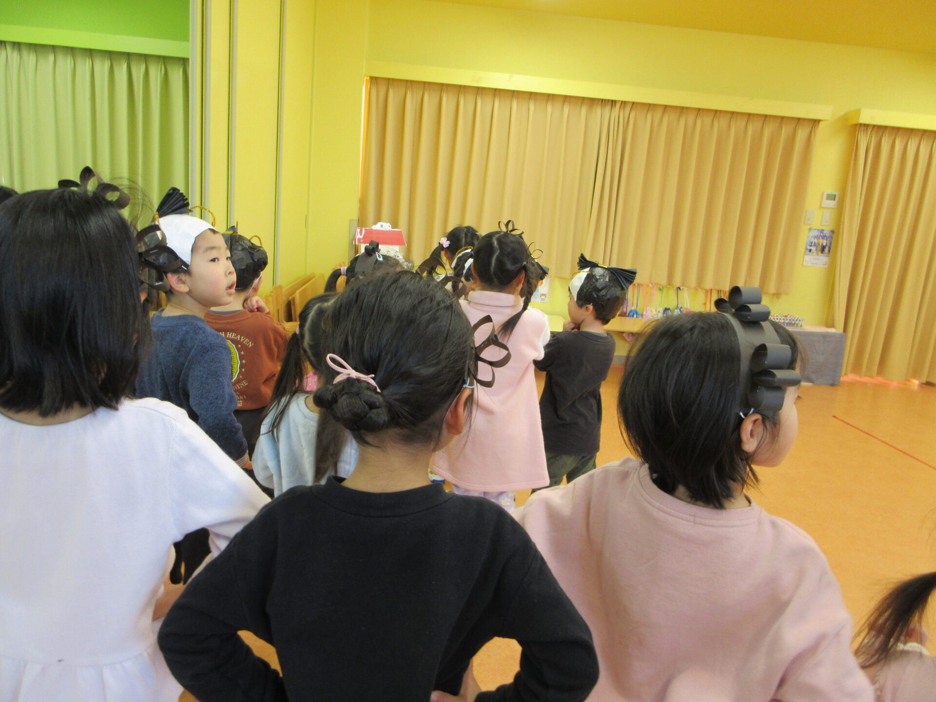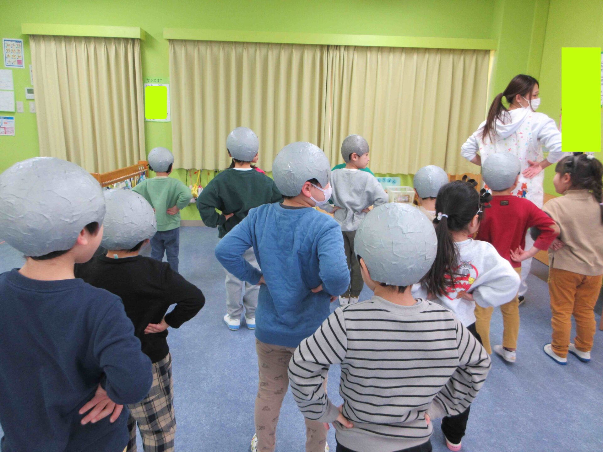 午前中、1階廊下を歩いていくと、3歳児にじチームと4歳児そらチームのカーテンが閉まっており…